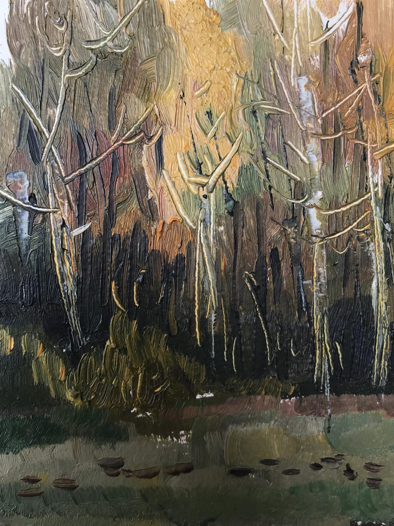 This oil painting, called "Gold autumn", is a beautiful and serene depiction of autumn in all its glory. A peaceful meadow is shown blanketed in a layer of autumn leaves, with the forest beyond providing a stunning backdrop of oranges, reds, and yellows. It's the perfect way to bring the beauty of autumn into your home!