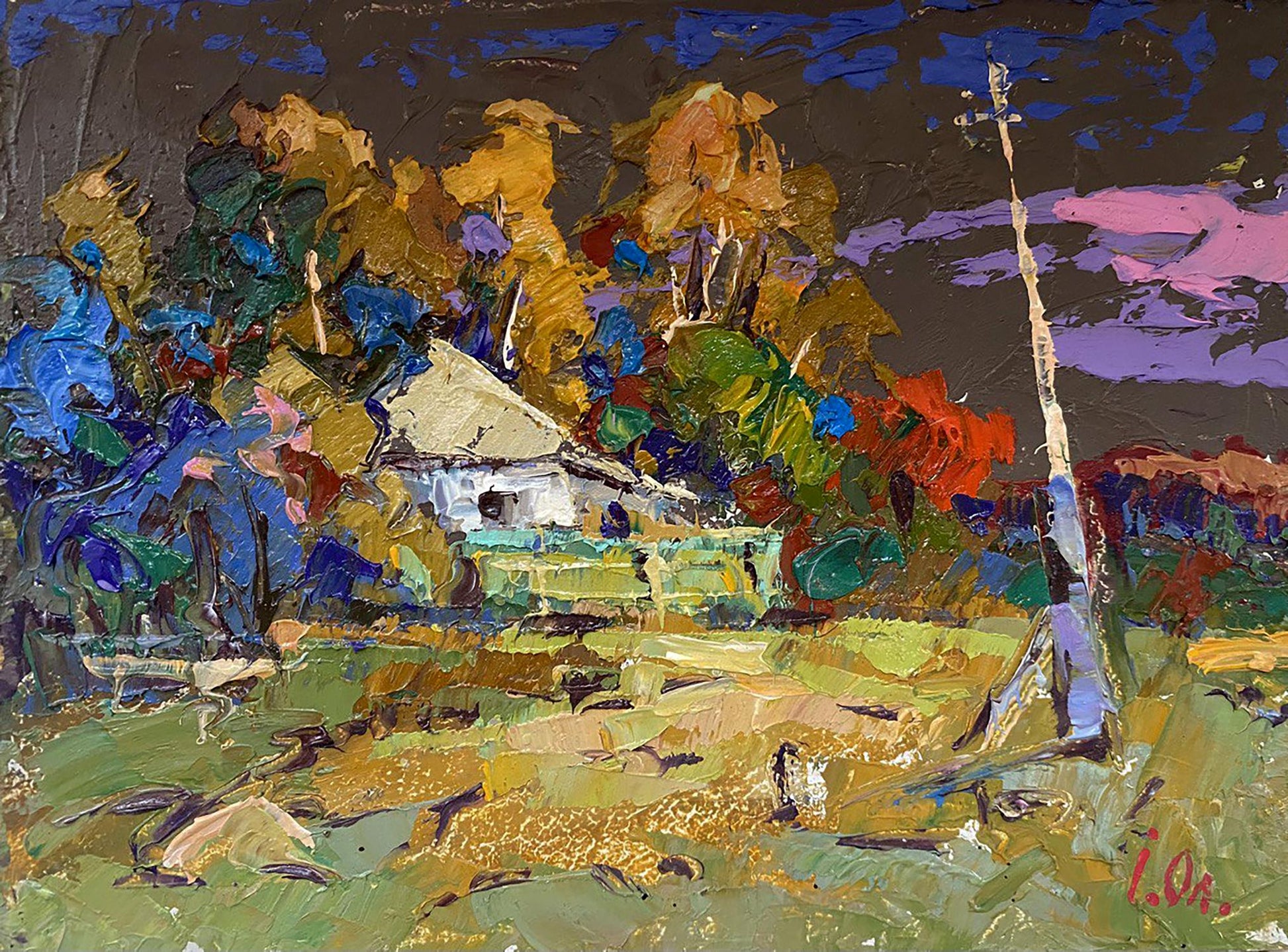 The painting "Grandma's House" vividly captures a cozy rural scene of a traditional house surrounded by autumn trees, evoking a sense of nostalgia and warmth. The artwork features bright, textured brushstrokes and a rich palette of bold colors, creating a lively yet peaceful composition that reflects the charm and simplicity of countryside life. In the foreground, a patch of golden grass and pathways leads the viewer’s eye toward the central house. The earthy tones of yellow, green, and ochre dominate this area, suggesting a sunlit yard in late autumn. The textured brushwork gives the impression of dried grass and fallen leaves, creating a feeling of seasonal change. A tall, bare tree trunk stands prominently on the right, contrasting with the colorful foliage and the soft curves of the landscape, adding a vertical element that balances the composition. The centerpiece of the painting is a modest rural house, painted in soft white and beige tones with a thatched roof. The house is partially hidden by trees, suggesting a secluded and peaceful location. The green accents on the house reflect the surrounding natural landscape, giving it a feeling of harmony with nature. The roof and walls of the house show thick, expressive brushstrokes, which add texture and depth to the structure. The bright white walls stand out against the darker, more saturated colors of the surrounding trees. The background is filled with tall autumn trees, painted in shades of gold, red, green, and blue, symbolizing the changing season. The foliage is dense and vibrant, indicating a lush natural environment. The sky above is painted in dark, moody tones, with purple and pink clouds stretching across it. The contrast between the bright foreground and the dark sky creates a sense of drama and atmosphere, hinting at approaching evening or an impending change in weather. The painting conveys a mood of nostalgia and tranquility, evoking memories of childhood visits to a grandparent’s house in the countryside. The warm autumn colors create a feeling of comfort and familiarity, while the dark sky adds a hint of mystery and depth. There is a quiet, peaceful charm to the scene, with the house standing as a symbol of warmth, family, and tradition. The vivid colors and expressive brushstrokes bring the scene to life, making it feel dynamic and full of emotion. "Grandma's House" is a vivid and nostalgic portrayal of rural life, capturing the beauty of nature and the warmth of family traditions. Through rich colors and expressive brushstrokes, the artist conveys a scene that feels both lively and peaceful, inviting viewers to reflect on memories of simpler times spent in the countryside. The painting is a celebration of home, tradition, and the changing seasons, reminding us of the comfort and beauty found in familiar places.