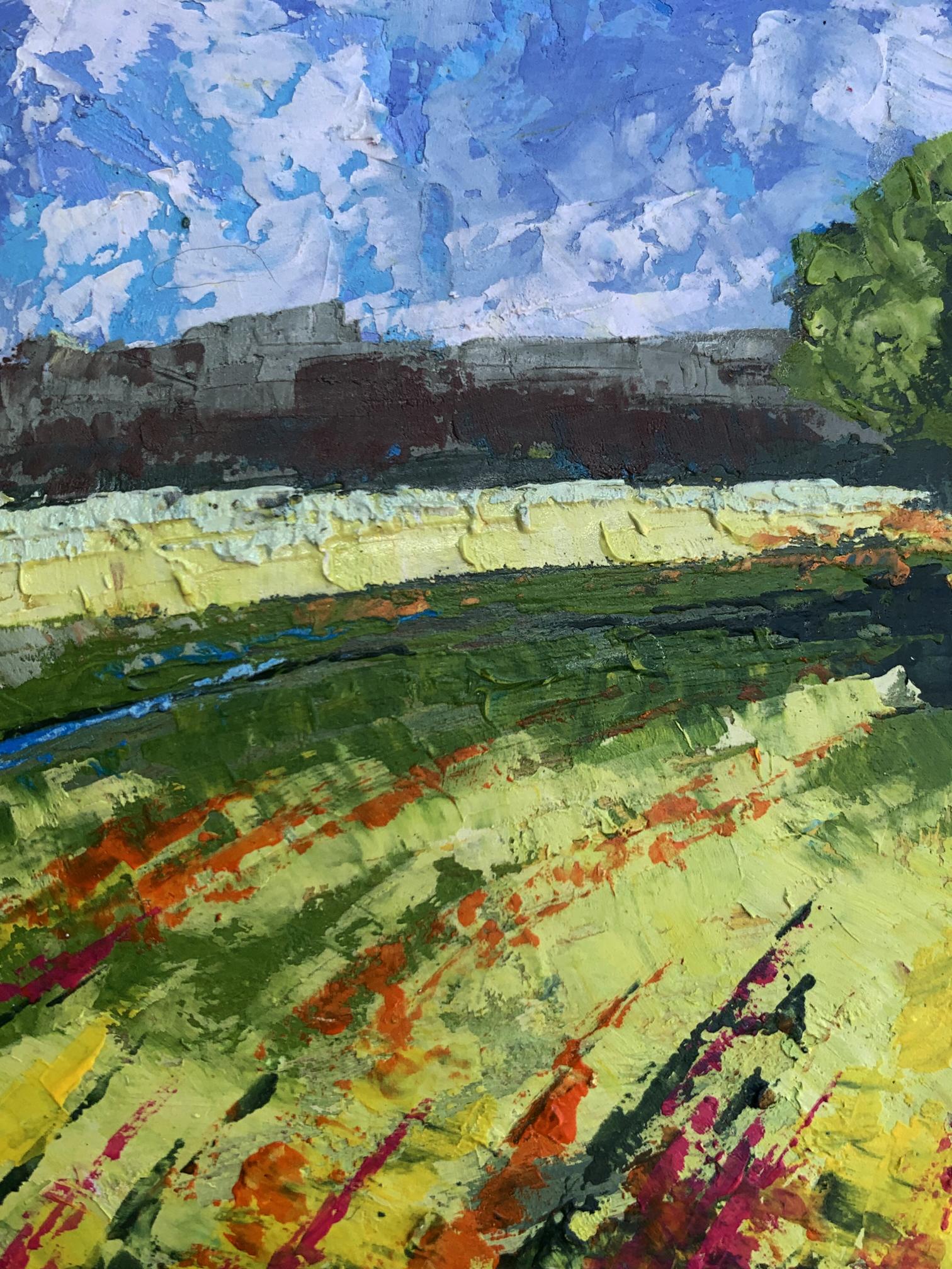 "Green Fields Under Clear Skies" is a vibrant oil painting that beautifully captures the serenity and natural beauty of an expansive landscape on a bright, sunny day. The artist employs a bold color palette and dynamic brushstrokes to convey the lushness of the fields and the clarity of the sky. The sky is painted in a striking blue with patches of white, indicating fluffy clouds scattered across a clear day. The smooth blending of blues and whites creates a sense of depth and openness, suggesting a vast, endless sky. The fields in the foreground are depicted with rich, vivid greens, interspersed with streaks of other colors such as blues, reds, and yellows. This mix of colors adds a lively, dynamic quality to the landscape, highlighting the diversity of flora. The trees are painted in deep, lush greens with thick, textured brushstrokes, giving them a three-dimensional appearance. The artist's use of impasto technique creates a tactile, almost touchable surface, making the trees stand out against the fields. The distant background features a darker, more muted range of colors, which provides a natural contrast to the bright greens of the fields and the vibrant blue of the sky. This use of contrast helps to create a sense of depth and perspective. The painting is divided into distinct layers, with the vibrant fields dominating the foreground and middle ground. The undulating lines of the fields guide the viewer’s eye across the landscape, creating a sense of movement and continuity. Prominent trees are positioned strategically to break the horizontal lines of the fields, adding vertical interest and balance to the composition. The largest tree is centrally placed, serving as a focal point that draws the viewer’s attention. The background hills and distant landscape are kept in darker, subdued tones, enhancing the sense of distance and the vastness of the open fields. The fields are the most striking element of the painting, depicted with rich greens and highlighted with other colors to show the variety of plants and flowers. The use of impasto for the trees adds depth and texture, making them stand out prominently against the smoothness of the sky and fields. The expansive sky provides a calming backdrop to the vibrant fields, suggesting a perfect, clear day. The overall mood of "Green Fields Under Clear Skies" is one of peace and tranquility. The bright colors and open composition evoke a sense of freedom and the beauty of nature in full bloom. The clear sky and lush fields suggest a perfect day, filled with the promise of growth and the serenity of the countryside. The painting can be interpreted as a celebration of the beauty and diversity of the natural world. The artist’s use of vibrant colors and dynamic brushstrokes conveys a sense of vitality and life, reminding viewers of the simple yet profound beauty of a clear day in the countryside. Overall, "Green Fields Under Clear Skies" is a captivating depiction of nature at its best. The artist's skillful use of color and texture creates a scene that is both lively and serene, inviting viewers to immerse themselves in the beauty of the landscape.