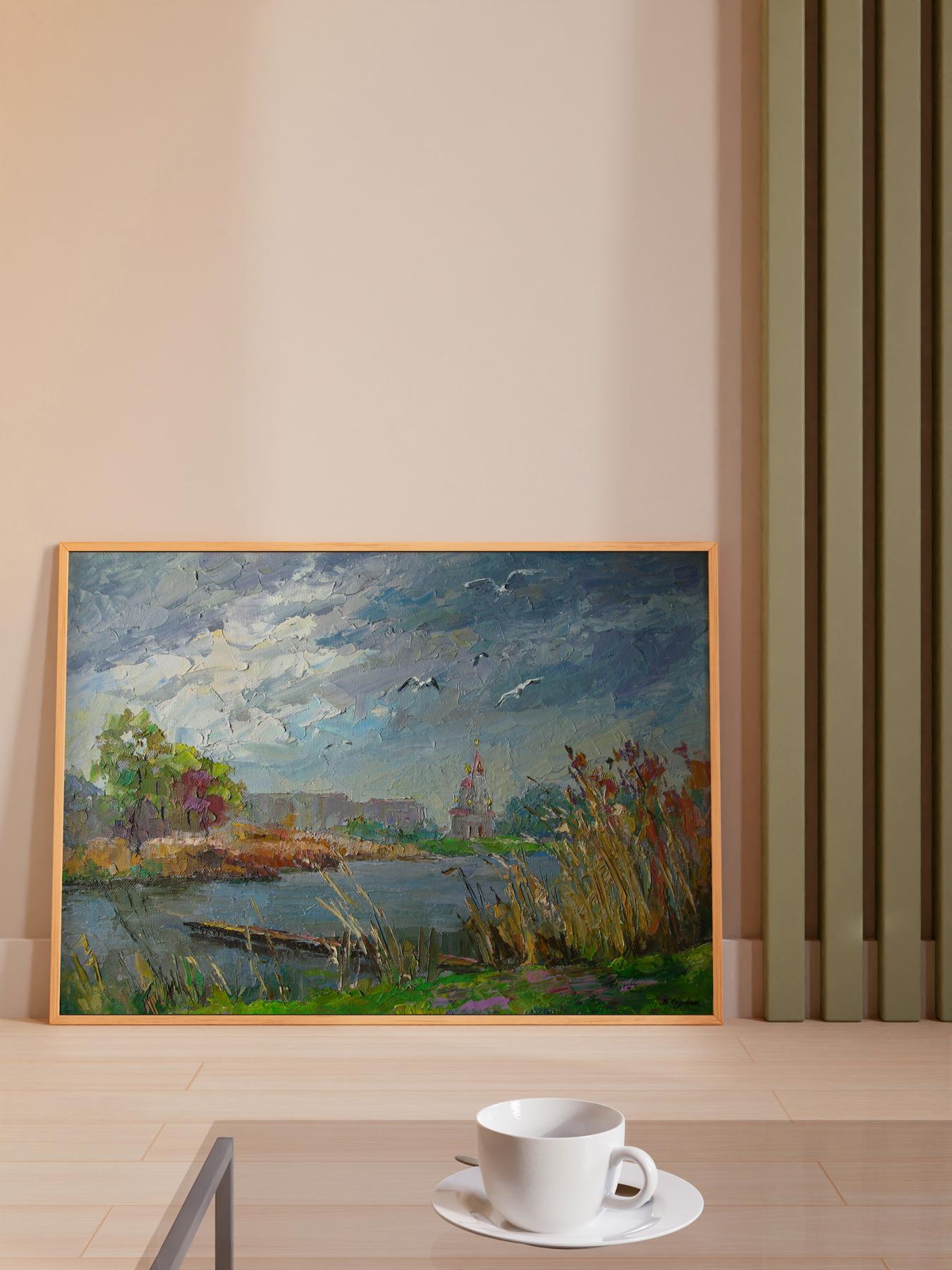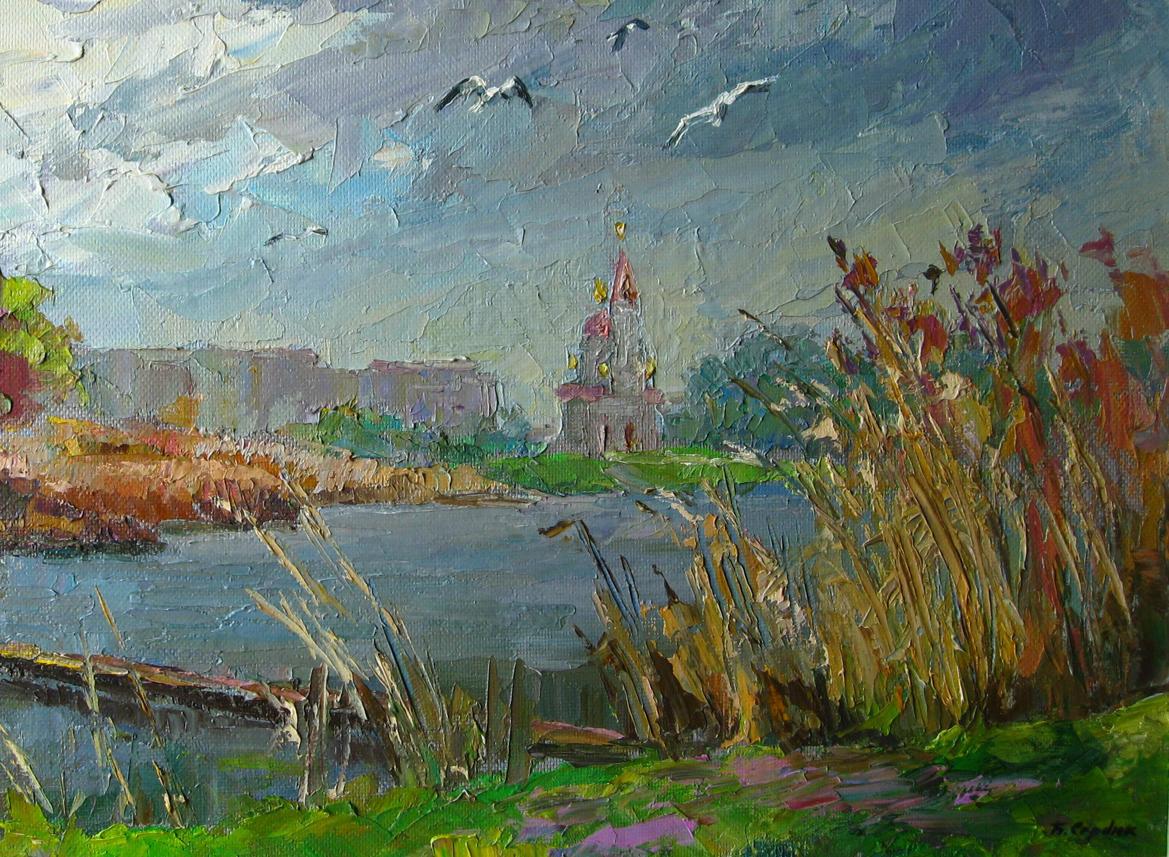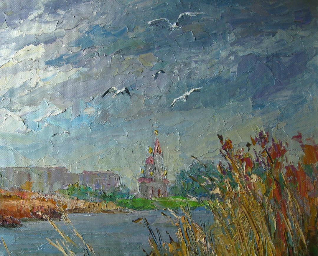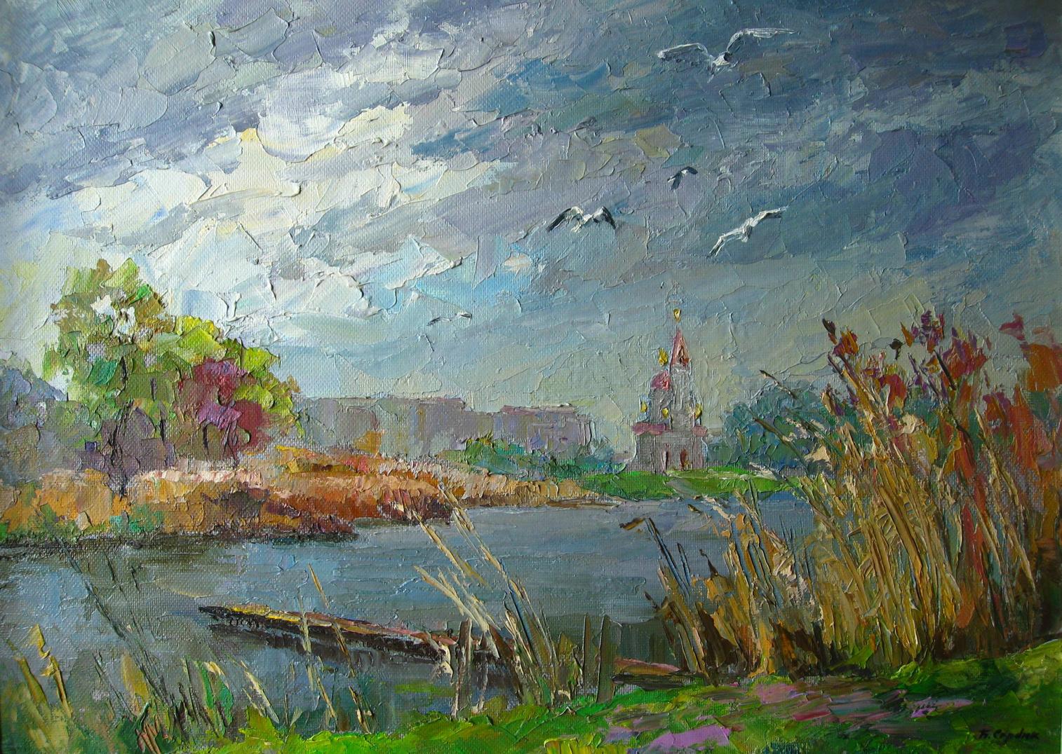 Gulls over the river. Dry Kagamlyk by Serdyuk Boris Petrovich is a compelling oil painting that evokes the tranquil yet charged atmosphere of a landscape on the cusp of change. This piece skillfully captures a moment where nature and urban life intersect under the impending weight of a brewing storm.