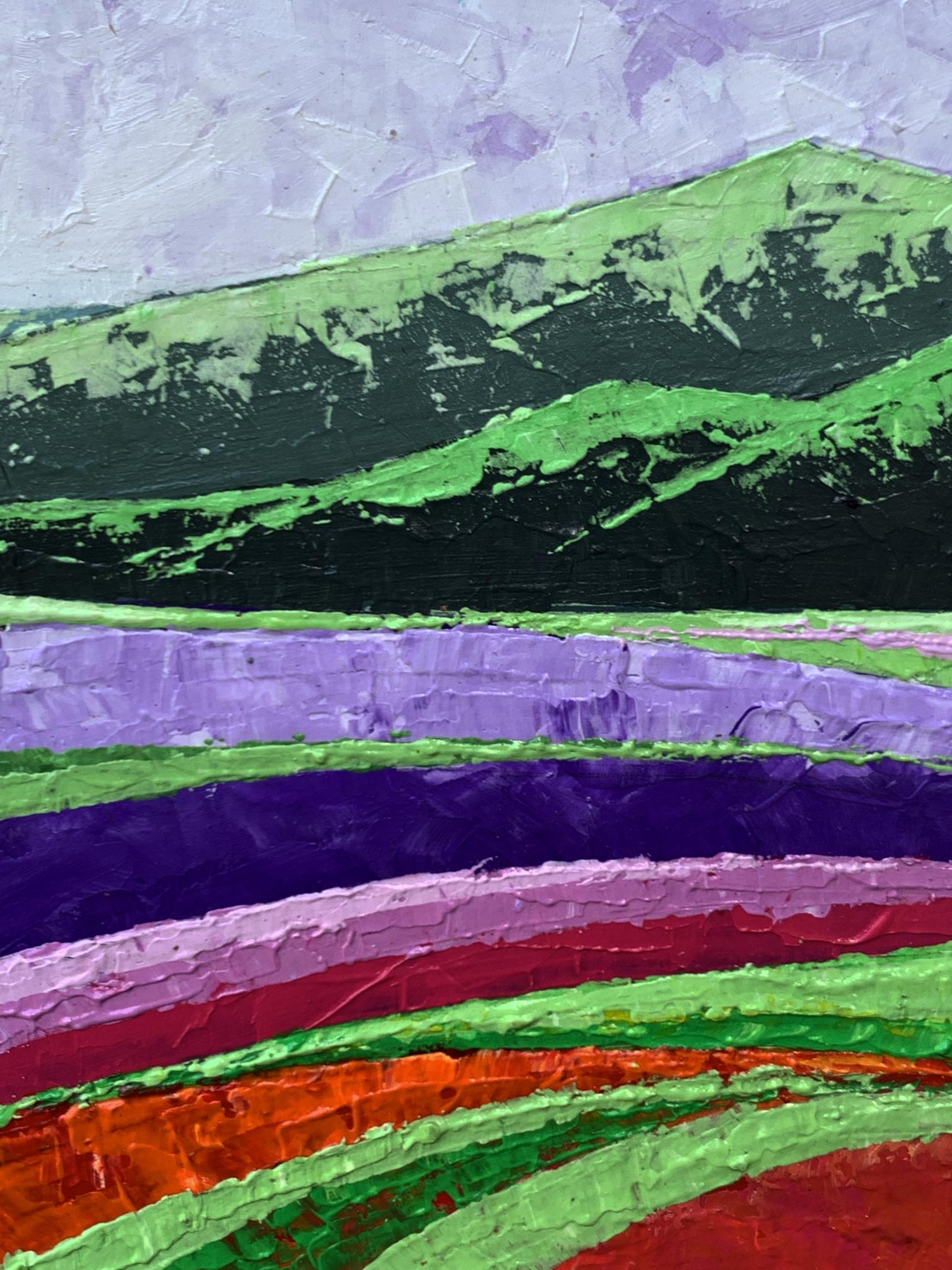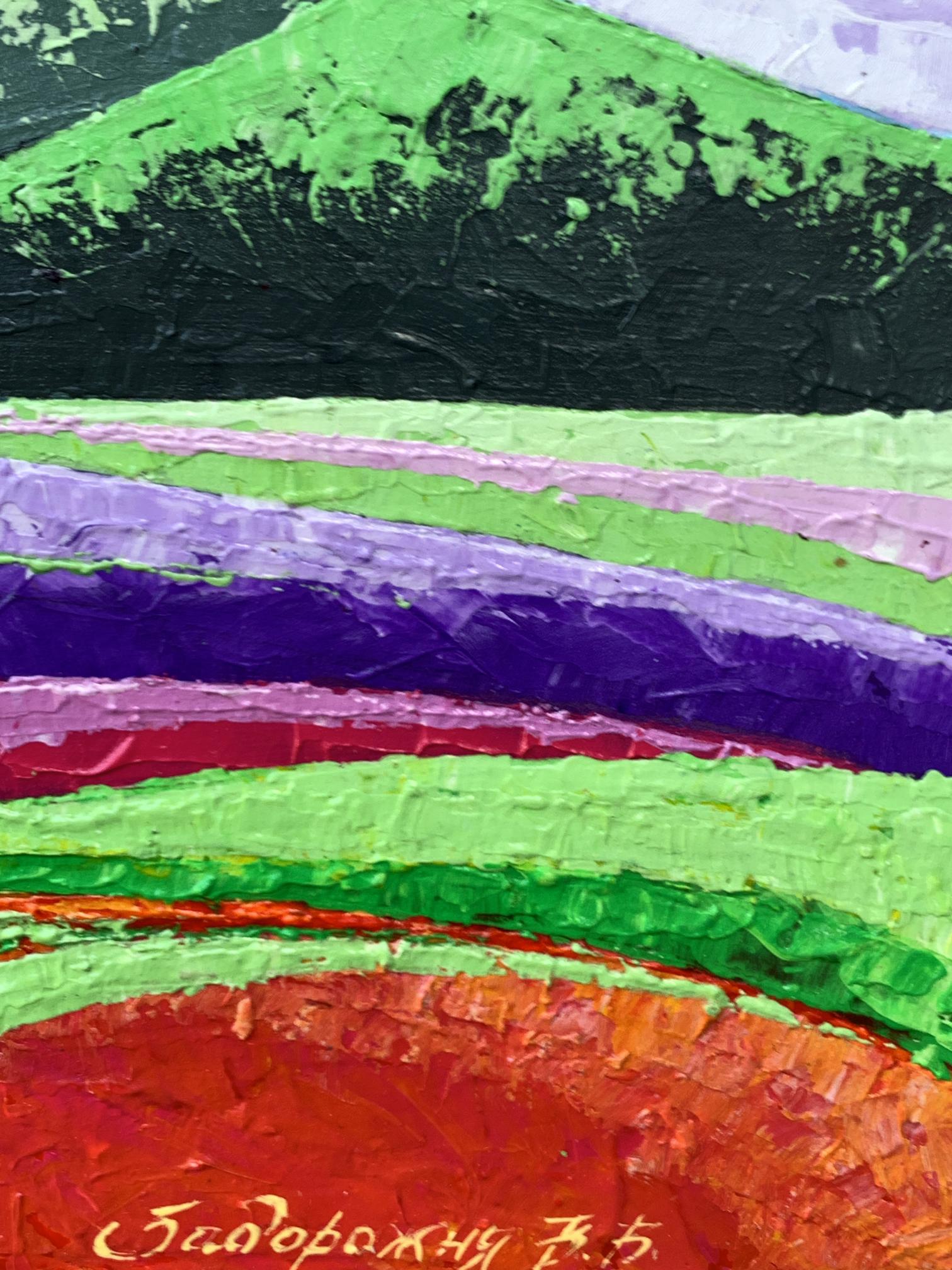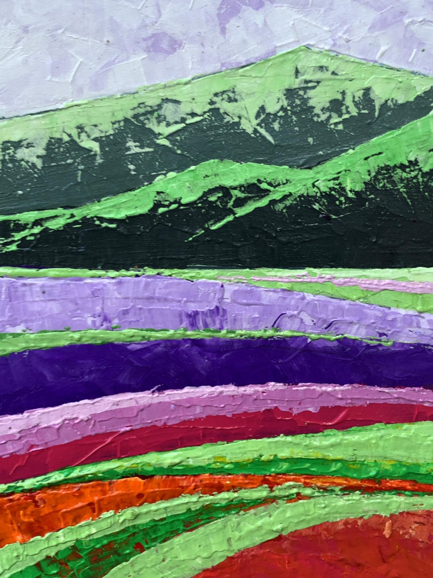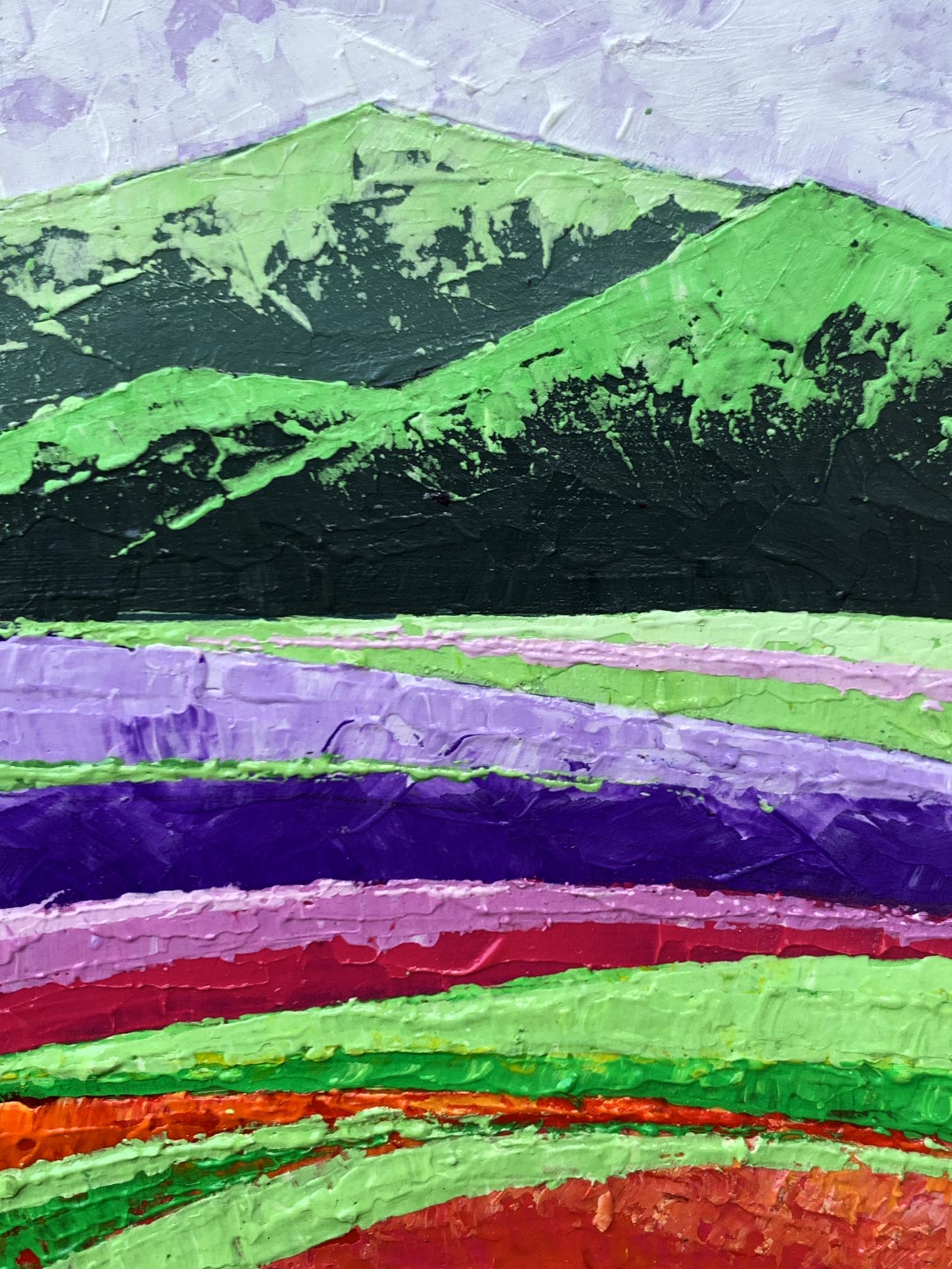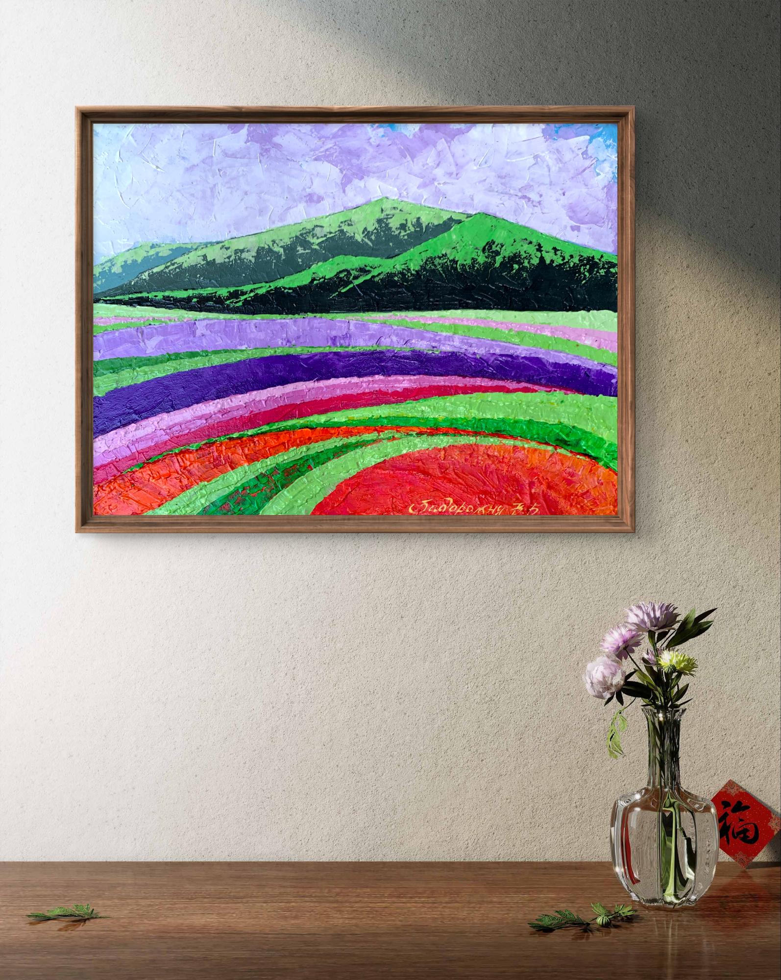 The painting titled "High Green Mountains" is a vibrant, abstract interpretation of a mountain landscape, created with oil on cardboard. Through dynamic color contrasts and bold strokes, the artist has captured the grandeur of the natural world while infusing it with an almost dreamlike quality.In the background, the central focus of the painting lies on the towering green mountains, rendered in rich, deep hues of emerald and forest green. The slopes of the mountains are depicted with subtle gradations of light and shadow, giving them depth and dimension. Their majesty is further emphasized by the light lavender sky above, where soft textures and muted tones create a tranquil atmosphere, offering a calm contrast to the intensity of the foreground.The foreground is dominated by a mesmerizing array of colorful fields that sweep across the canvas in curved, layered bands. Each stripe is painted in vivid tones of purple, magenta, red, and green, interspersed with orange accents that seem to shimmer under an imagined sunlight. The fields radiate energy and motion, almost as if they are waves rippling toward the mountains. The artist uses thick impasto techniques, where the raised texture of the paint adds a tactile quality to the work, inviting viewers to experience the landscape not just visually, but emotionally.This composition is a celebration of the harmony between nature's immensity and its intricate details. The mountains, representing stability and endurance, are juxtaposed against the fields, which suggest vitality, growth, and seasonal change. The vibrant palette conveys the artist's deep appreciation for the beauty of untouched landscapes, where every color plays a role in the symphony of life.Through "High Green Mountains," the artist communicates a sense of wonder and reverence for the natural world. The fields symbolize the richness of the earth, and the towering peaks evoke feelings of awe and inspiration. The painting invites the viewer to explore the balance between permanence and transformation in nature, reminding us of the importance of preserving its beauty and vitality. This work is not only a visual delight but also a call to connect more deeply with the environment and the emotions it evokes.