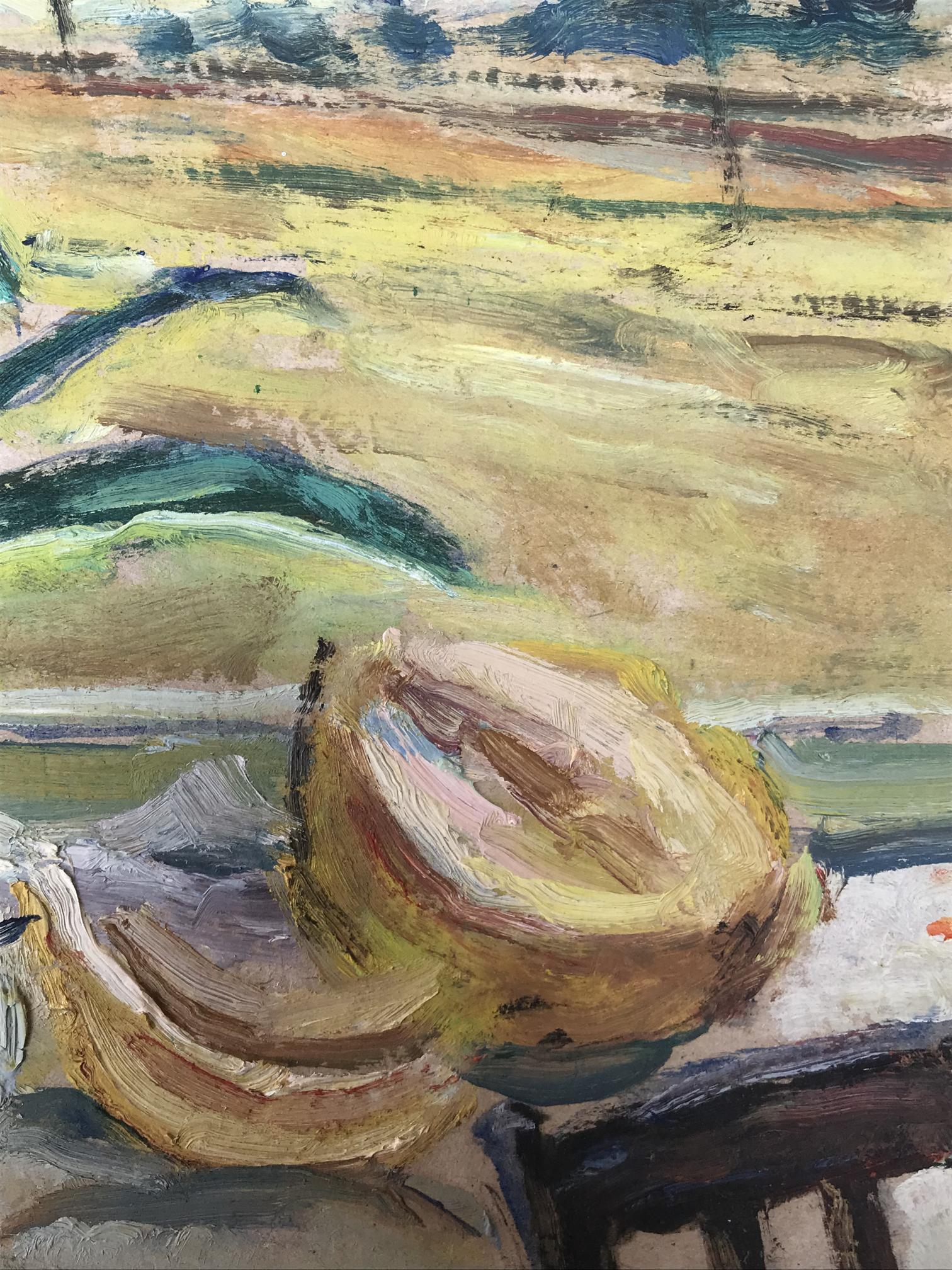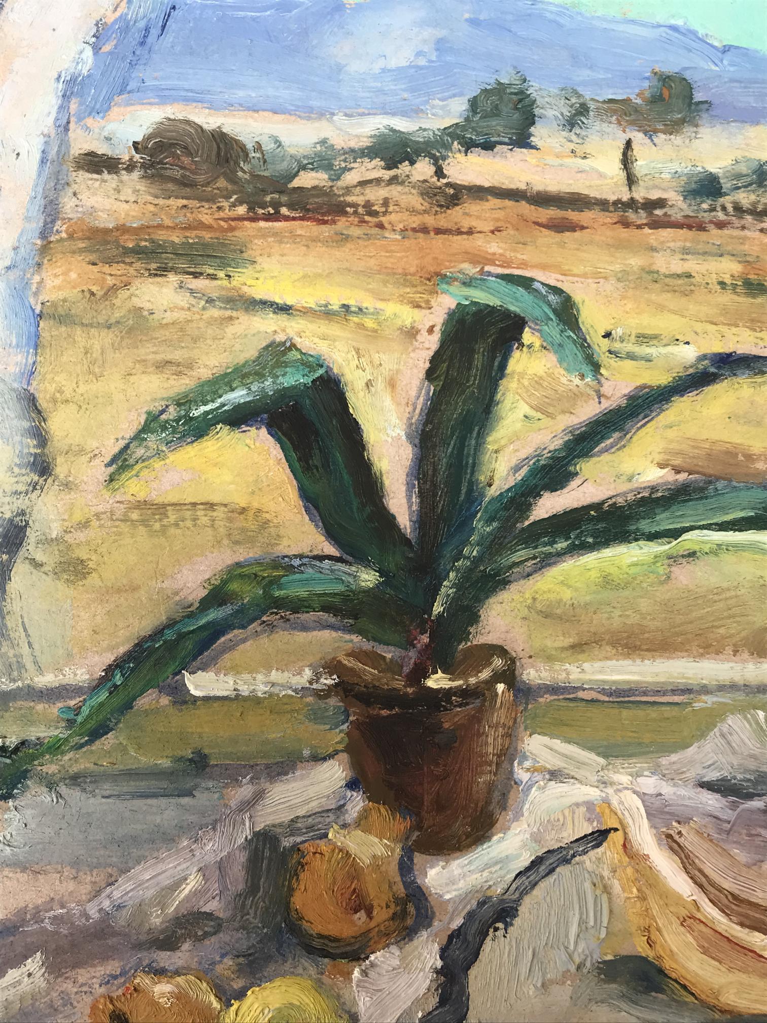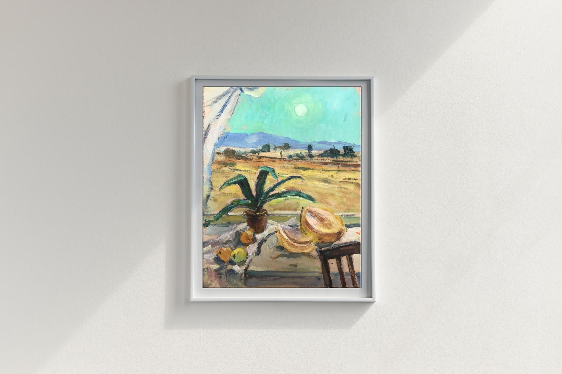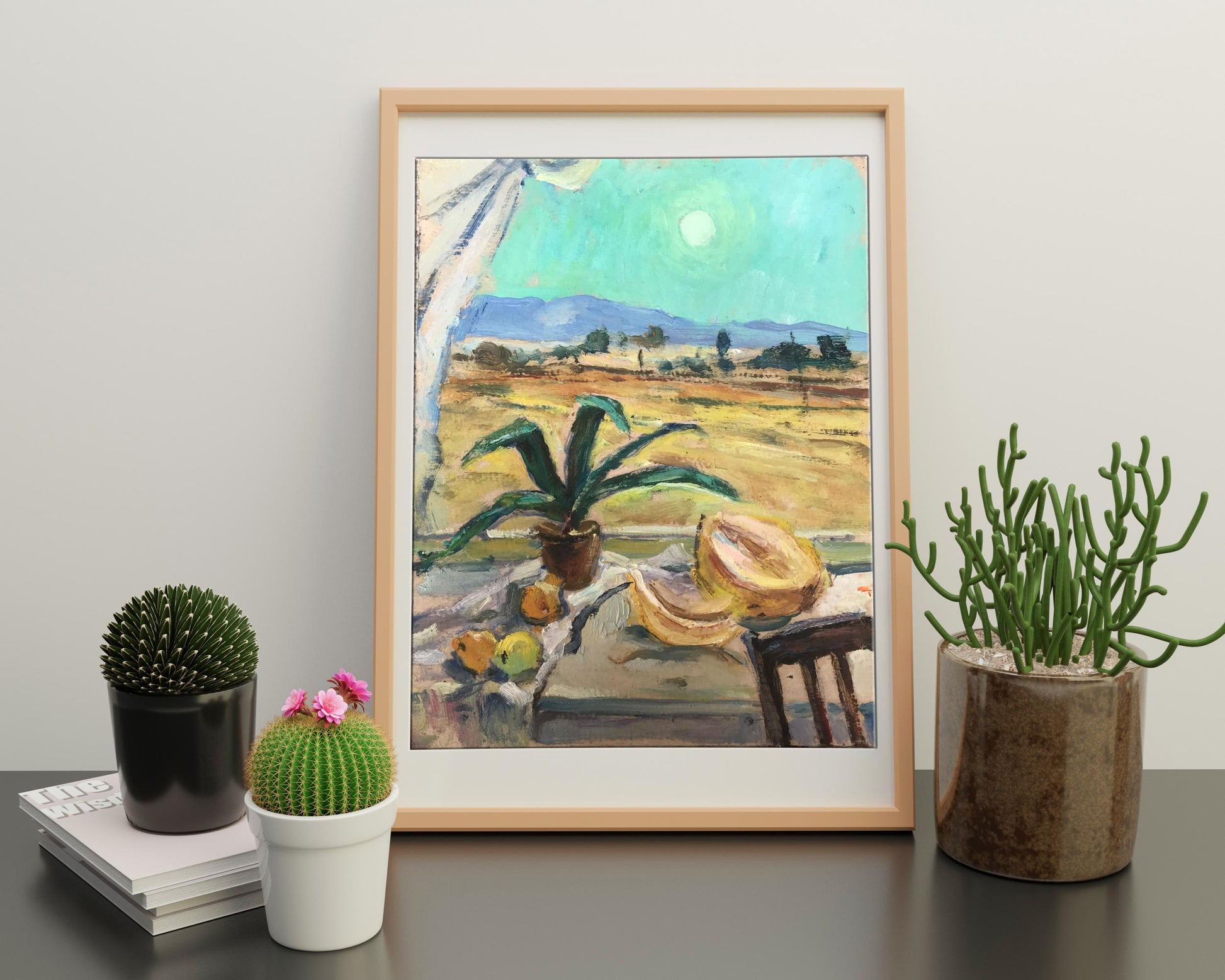 When you look at this oil painting, you can almost feel the heat emanating from the scene. The golden steppe stretches out before you, and the mountains loom on the horizon. The fruits on the windowsill are a tempting treat on a hot day. This painting perfectly captures the essence of a summer day.
