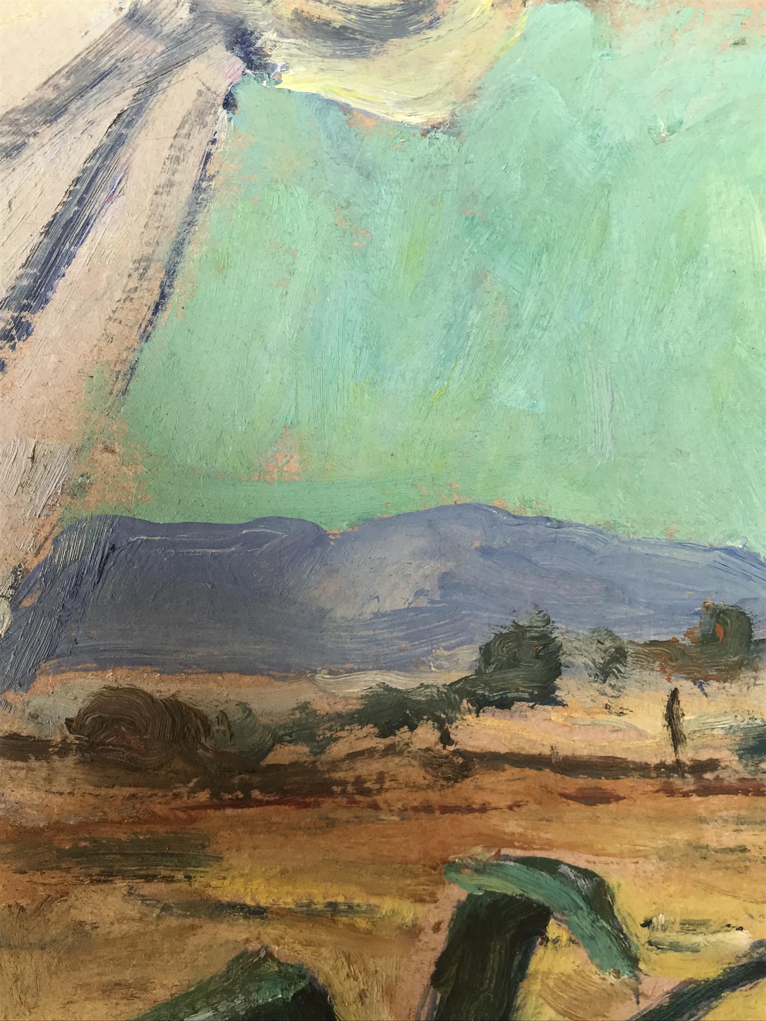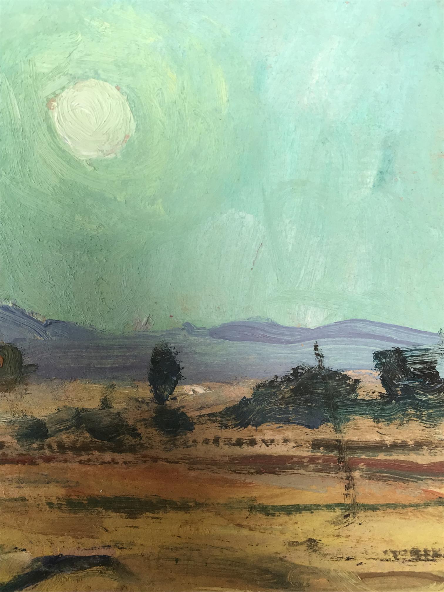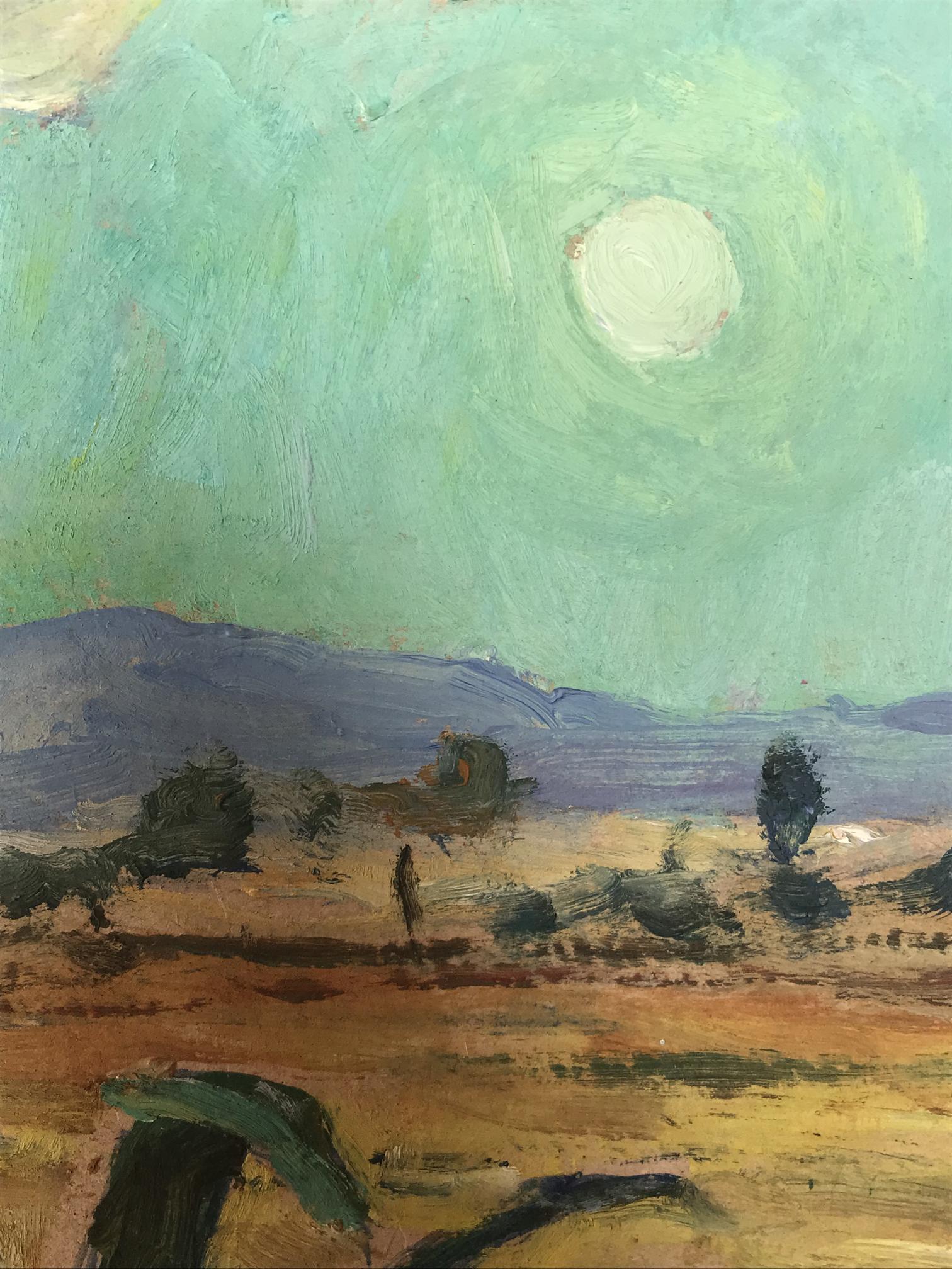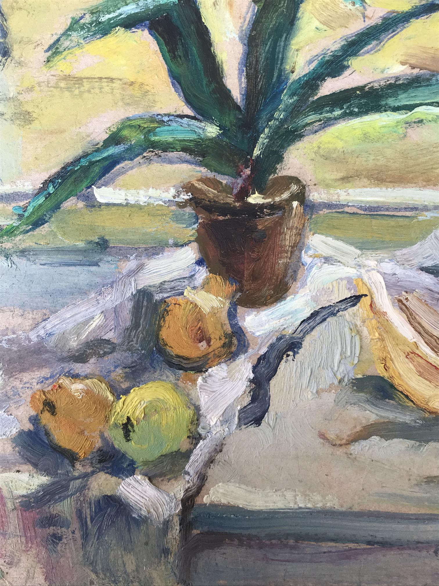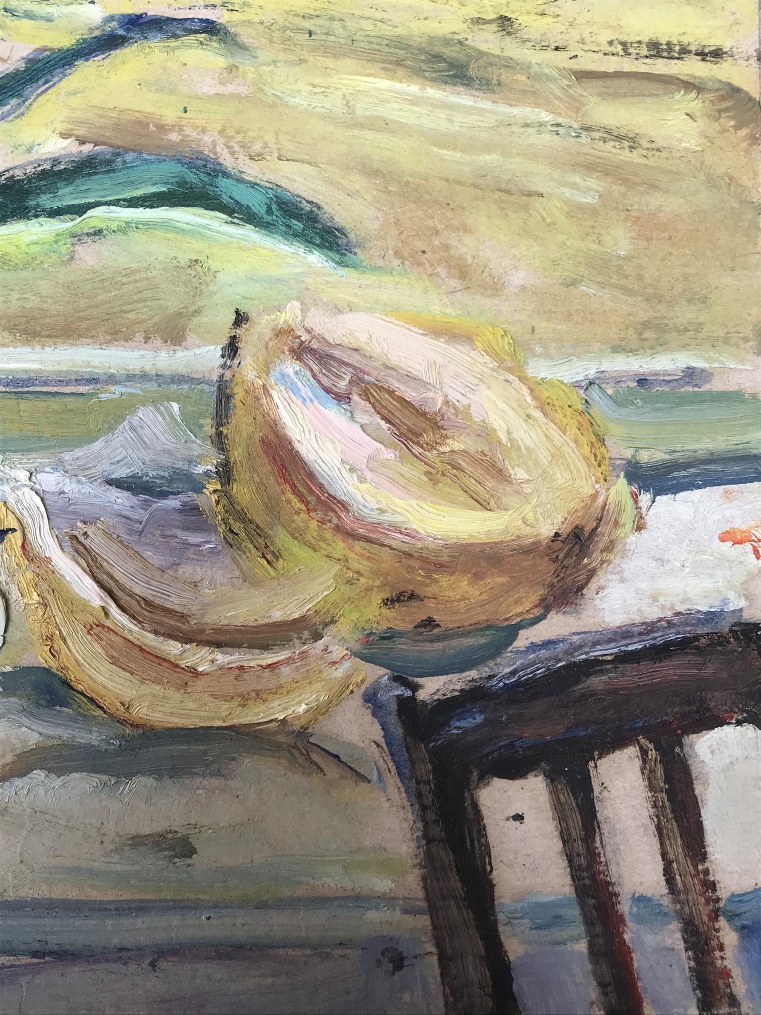When you look at this oil painting, you can almost feel the heat emanating from the scene. The golden steppe stretches out before you, and the mountains loom on the horizon. The fruits on the windowsill are a tempting treat on a hot day. This painting perfectly captures the essence of a summer day.