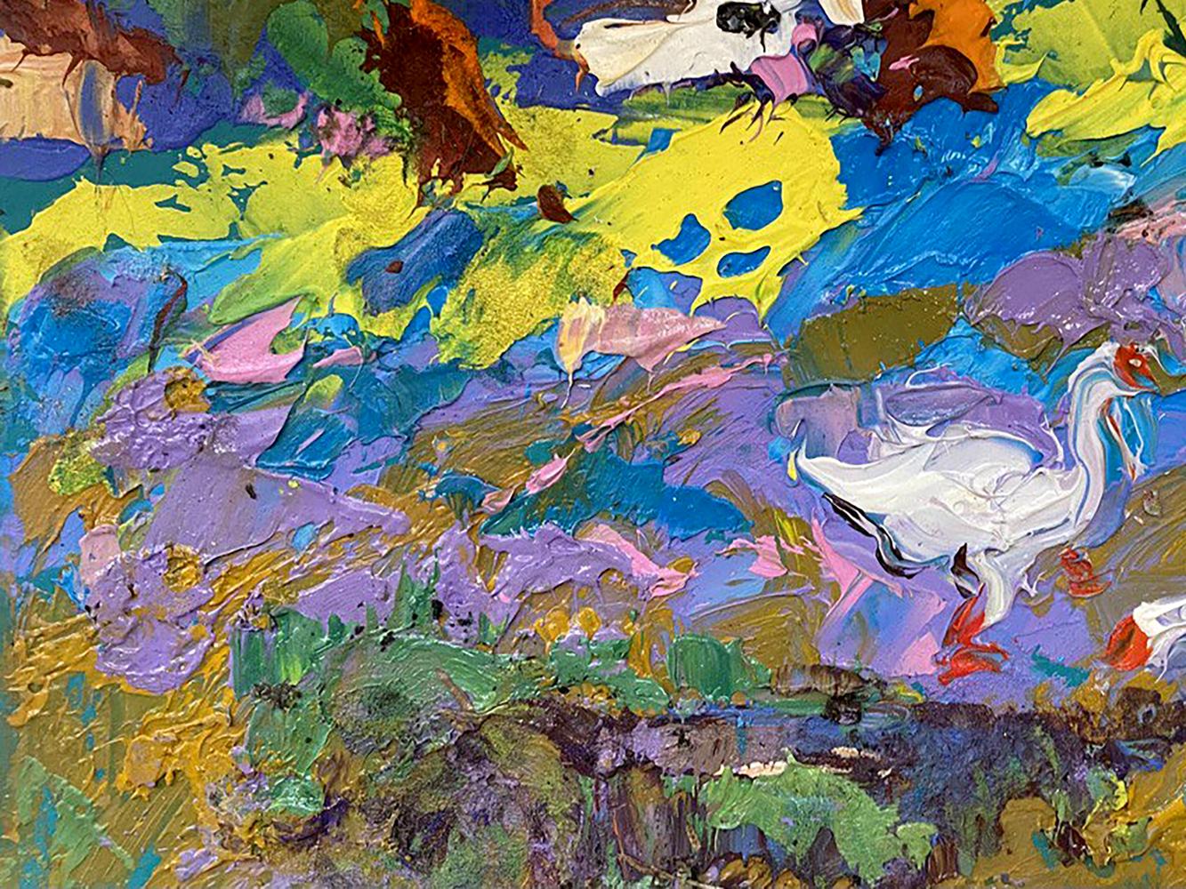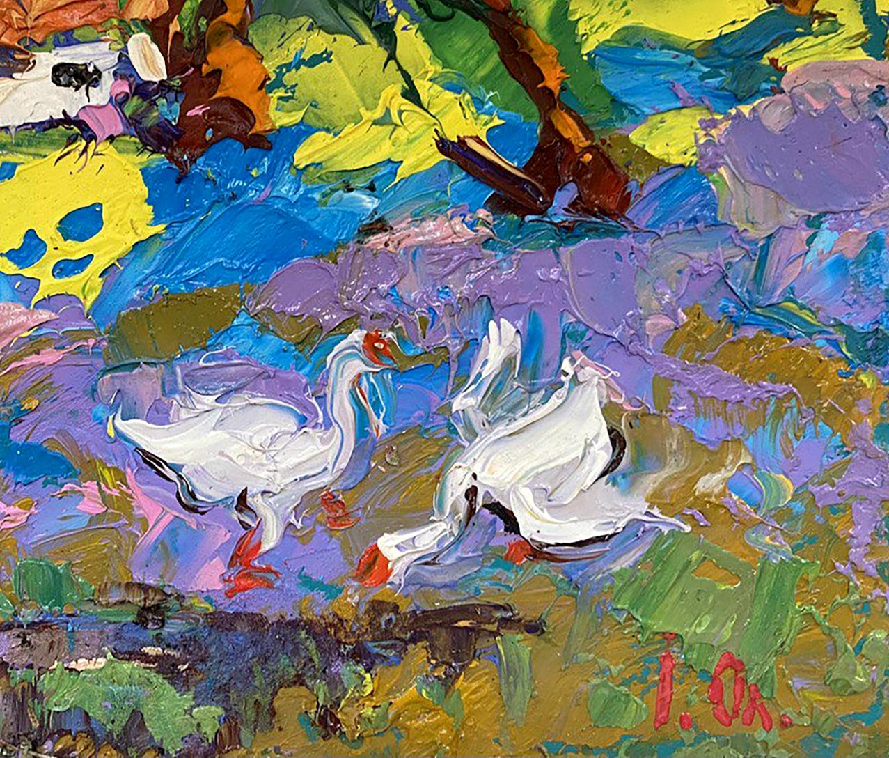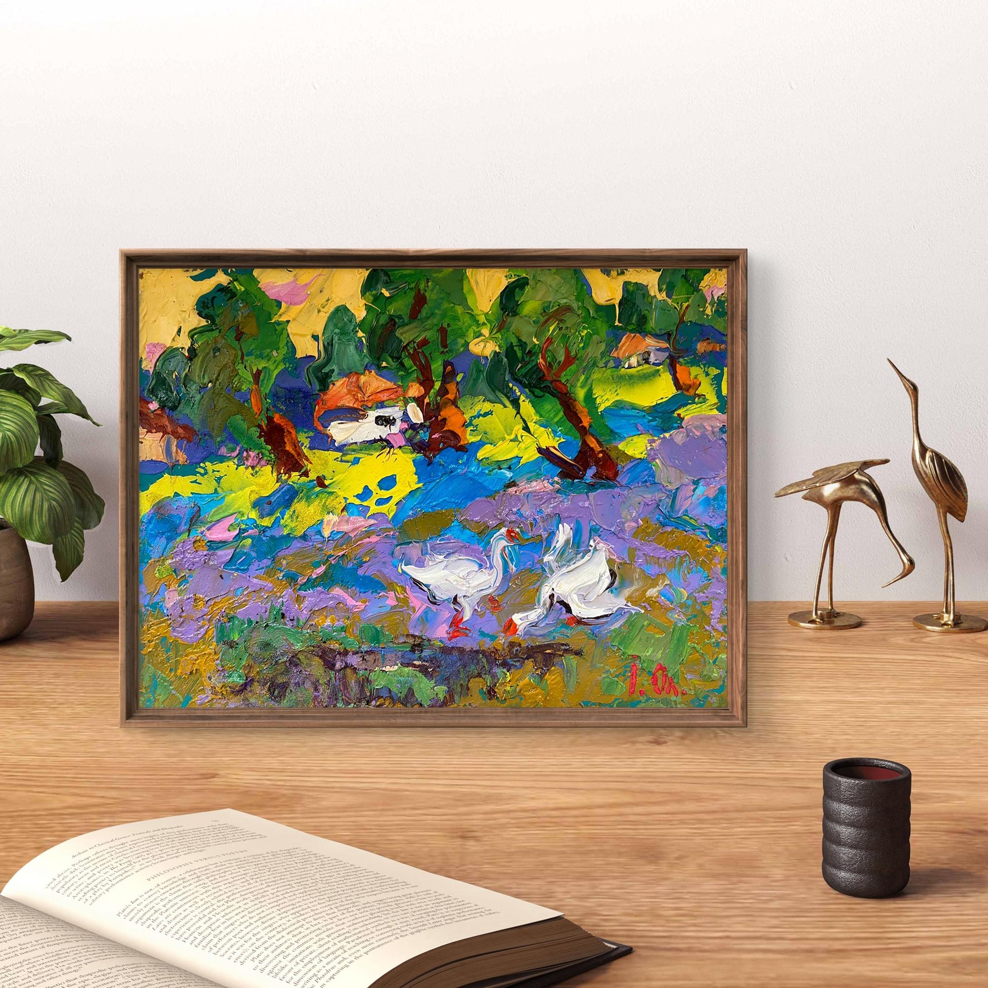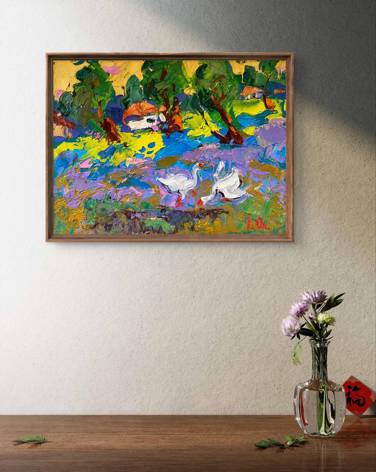 The painting titled "House Among the Trees" is a vibrant and lively depiction of a countryside scene where a small house is nestled among lush green trees, with playful white geese roaming the colorful landscape. The artist uses bold palette knife strokes and an expressive color palette of bright yellows, blues, greens, and purples to create a textured, energetic composition. This work captures the essence of rural tranquility while showcasing the beauty of nature and everyday life in the countryside. The foreground is filled with wild grass and flowers, painted in a mix of bright purple, blue, and green tones. The brushstrokes are thick and layered, creating a textured, almost three-dimensional surface. The bold use of color suggests sunlight reflecting off the grass and flowers, bringing the scene to life. At the center of the foreground, a group of white geese is depicted with red beaks and feet, standing out against the colorful surroundings. The geese appear lively and animated, adding a sense of movement and playfulness to the scene. Their presence hints at rural life and simple joys, emphasizing the connection between humans and nature. In the middle ground, a small, cozy house with a whitewashed exterior and a red roof is partially hidden among the trees. The house represents shelter, warmth, and home, nestled in the peaceful embrace of nature. The trees surrounding the house are painted in rich green and brown tones, with hints of orange and yellow suggesting sunlight filtering through the leaves. The tilted trees and swirling brushstrokes give the composition a sense of movement, as if a gentle breeze is passing through the landscape. The trees frame the house, drawing the viewer's eye toward it as a focal point of the painting. The background features a soft, yellow sky with hints of pink and turquoise, suggesting early morning or late afternoon light. The sky adds a sense of openness and serenity to the composition, balancing the dense, colorful landscape below. The contrast between the bright sky and the darker, earthy tones of the trees creates a sense of depth and distance, enhancing the feeling of a secluded, peaceful countryside retreat. "House Among the Trees" is a colorful and dynamic depiction of rural life, celebrating the beauty of nature, home, and simple pleasures. The artist’s use of bold colors, textured brushstrokes, and lively composition creates a scene that feels both vivid and welcoming, inviting the viewer to experience the joy and tranquility of the countryside. The painting captures a moment of peaceful harmony in nature, reminding us of the timeless charm of rural living.