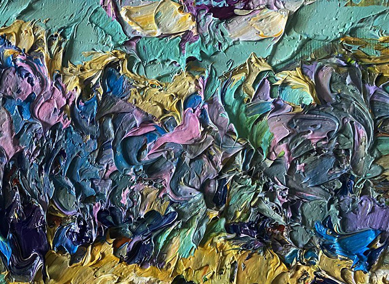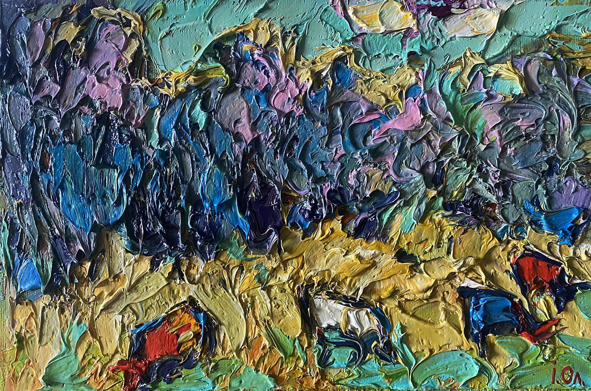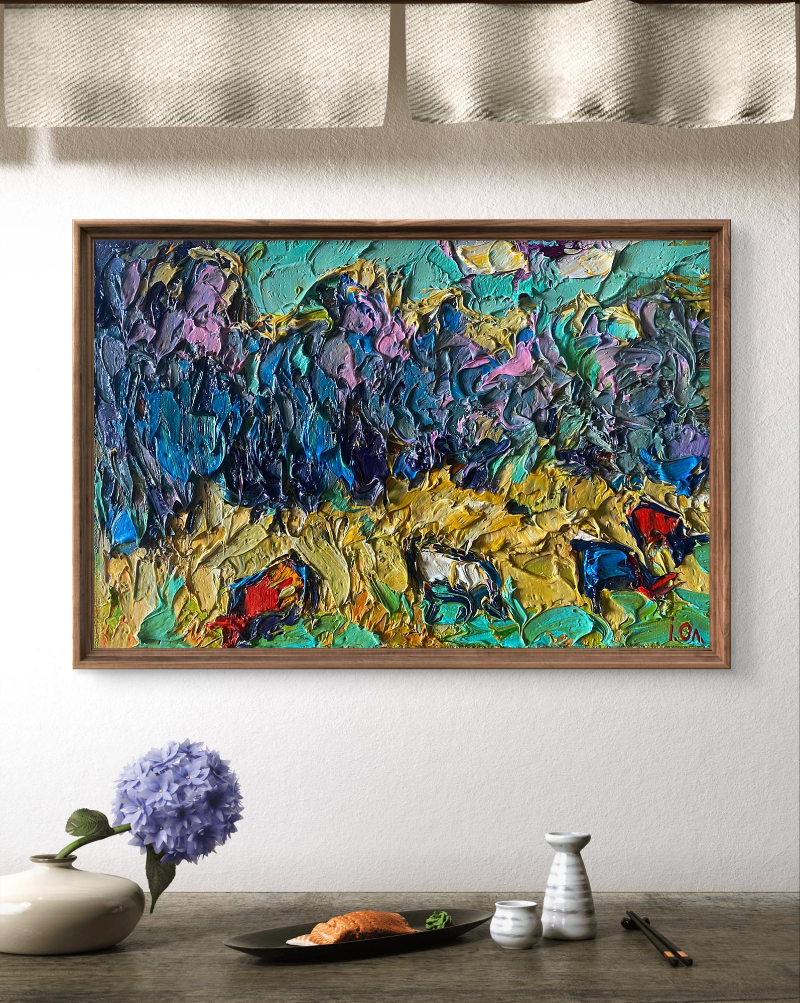The painting "In the Autumn Field" captures the raw and expressive essence of autumn nature through bold impasto strokes and a vivid color palette. The canvas is rich in texture, with thick layers of paint that bring a sense of movement and depth to the composition. The upper section of the artwork is dominated by stormy shades of dark blue, purple, and green, depicting a dense forest or tree line in the distance. The use of multiple tones in the foliage creates an abstract impression of the changing leaves, with hints of pink and teal adding an unexpected playfulness to the otherwise moody sky. In the foreground, the field is painted in golden yellows and earthy greens, symbolizing the autumn harvest season. The vibrant patches of red, blue, and white suggest farm animals or scattered foliage, adding a touch of life and warmth to the landscape. These bright accents contrast beautifully with the more subdued background, drawing the viewer's attention to the details in the field. The painting's expressive brushstrokes and textured surface make the scene feel alive and dynamic, inviting the viewer to explore the subtle transitions of color and form. The abstract elements leave room for interpretation, allowing each viewer to find their own story within the piece. "In the Autumn Field" is a captivating and energetic artwork that celebrates the natural beauty of the changing seasons. The use of impasto technique creates a sense of tactility and depth, making the painting feel alive and dynamic. It invites viewers to immerse themselves in the landscape and appreciate the colors and textures of autumn in a new and abstract way.