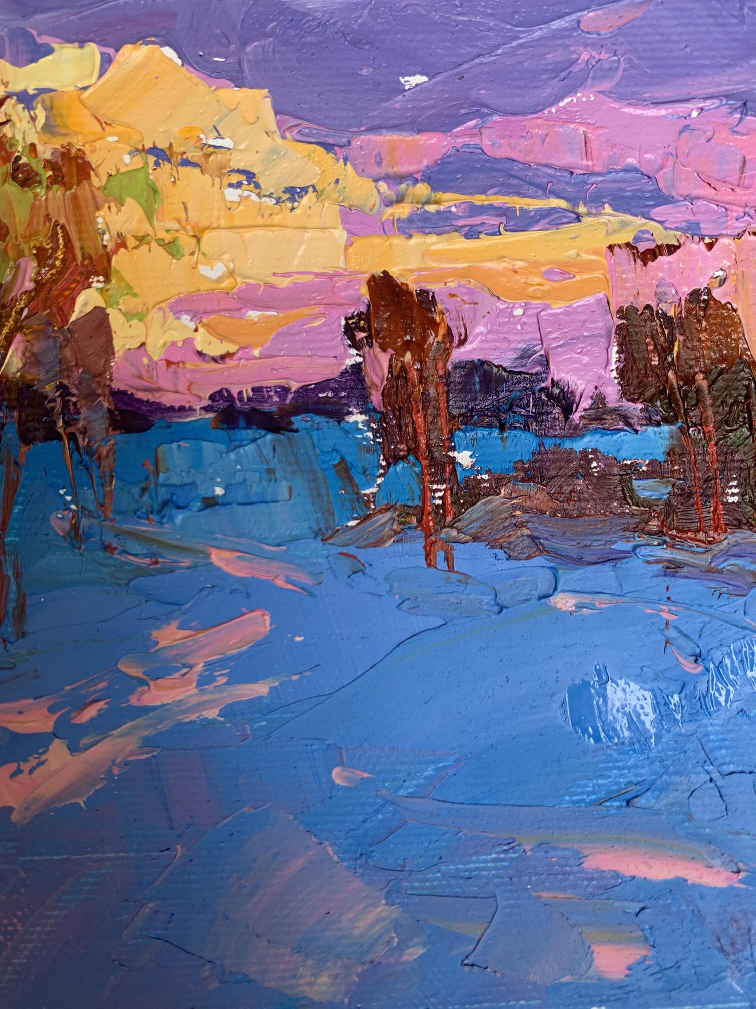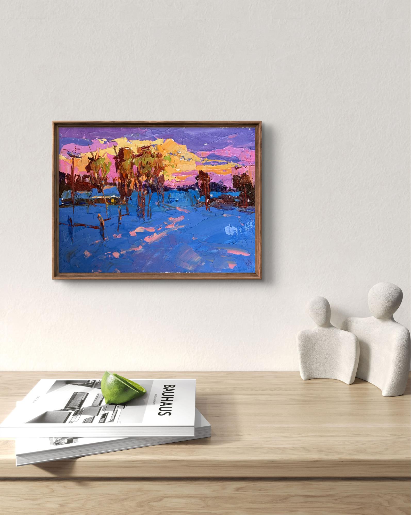 The painting "In the Evening in the Cold" is an expressive and vibrant oil on canvas piece that captures the serene yet chilling atmosphere of a winter evening landscape, bathed in the colors of the setting sun. The artist employs a rich and diverse color palette dominated by shades of blue, purple, pink, and orange. The technique features thick, textured brushstrokes typical of the impasto style, creating a sense of depth and movement. The bold and contrasting colors, combined with the energetic brushwork, give the painting a dynamic and immersive quality. The composition centers around a winter landscape with bare trees and snow-covered ground. The vibrant colors of the sky at sunset dominate the upper portion of the painting, while the snow and trees fill the middle and lower sections, creating a balanced and harmonious scene. The trees are depicted with expressive and textured brushstrokes, rendered in shades of brown, green, and orange. The bare branches reach upwards, creating intricate patterns against the colorful sky. The snow-covered ground is painted in various shades of blue and purple, with highlights of pink and orange reflecting the colors of the sunset. The thick application of paint adds texture and depth, making the snow appear almost three-dimensional. The sky is a dramatic mix of pink, purple, and orange, capturing the vibrant hues of the setting sun. The swirling clouds and dynamic brushstrokes create a sense of movement and energy, contrasting beautifully with the stillness of the snow-covered landscape. The shadows and reflections on the snow add to the realism of the scene, with patches of pink and purple suggesting the play of light as the sun sets. Overall Mood. The overall mood of the painting is tranquil yet vibrant, capturing the beauty and stillness of a winter evening. The use of bold colors and dynamic brushstrokes conveys the chill of the cold air and the warmth of the setting sun, creating a sense of contrast and harmony. "In the Evening in the Cold" can be interpreted as a celebration of the serene beauty of winter landscapes. The painting captures a moment of calm and tranquility, reflecting the artist's appreciation for the natural world. The vibrant colors and expressive brushstrokes reflect the artist's emotional response to the scene, conveying a sense of wonder and admiration for the beauty of nature. This painting masterfully combines elements of realism and expressionism to create a vivid and immersive depiction of a winter evening, using color and texture to evoke a sense of peace and natural beauty.