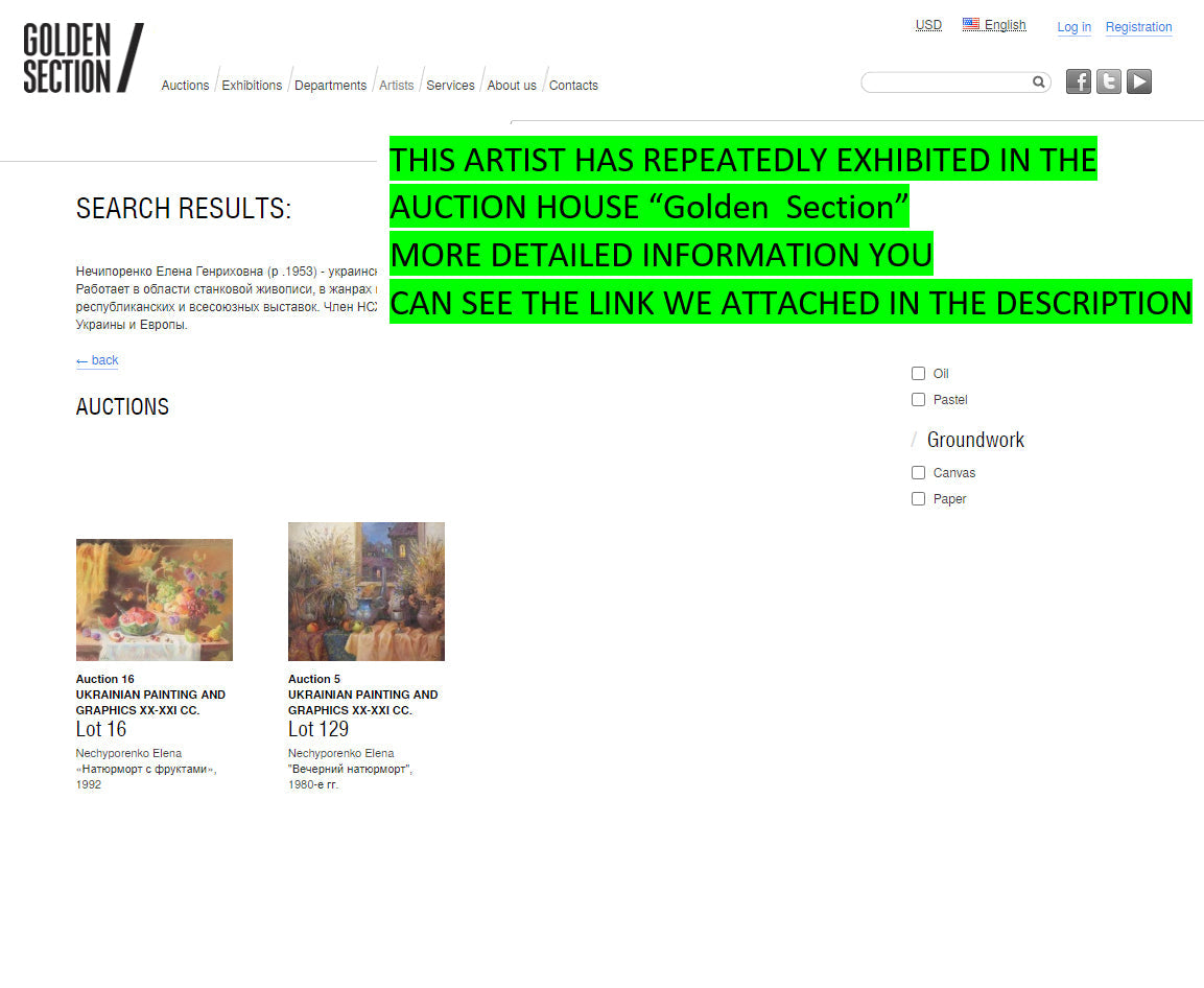 About the artists: Elena Genrikhovna Nechiporenko (b. 1953) - Ukrainian painter. Graduated from the Kiev Art School (1974). Works in the field of easel painting, in the genres of still life and lyrical landscape. Participants of many republican and all-union exhibitions. Member of the National Union of Artists (1984). The artist's works are kept in private collections in Ukraine and Europe.