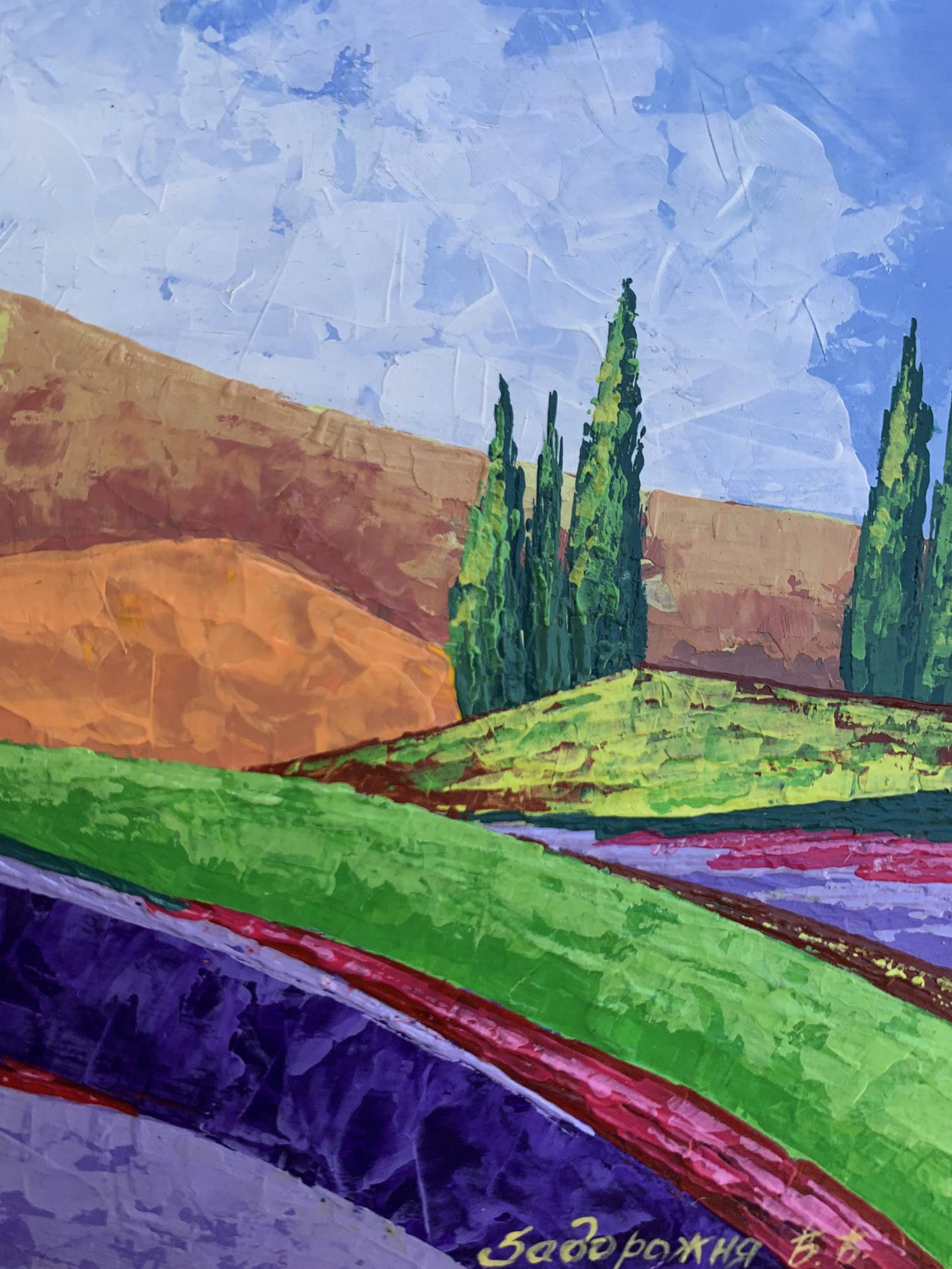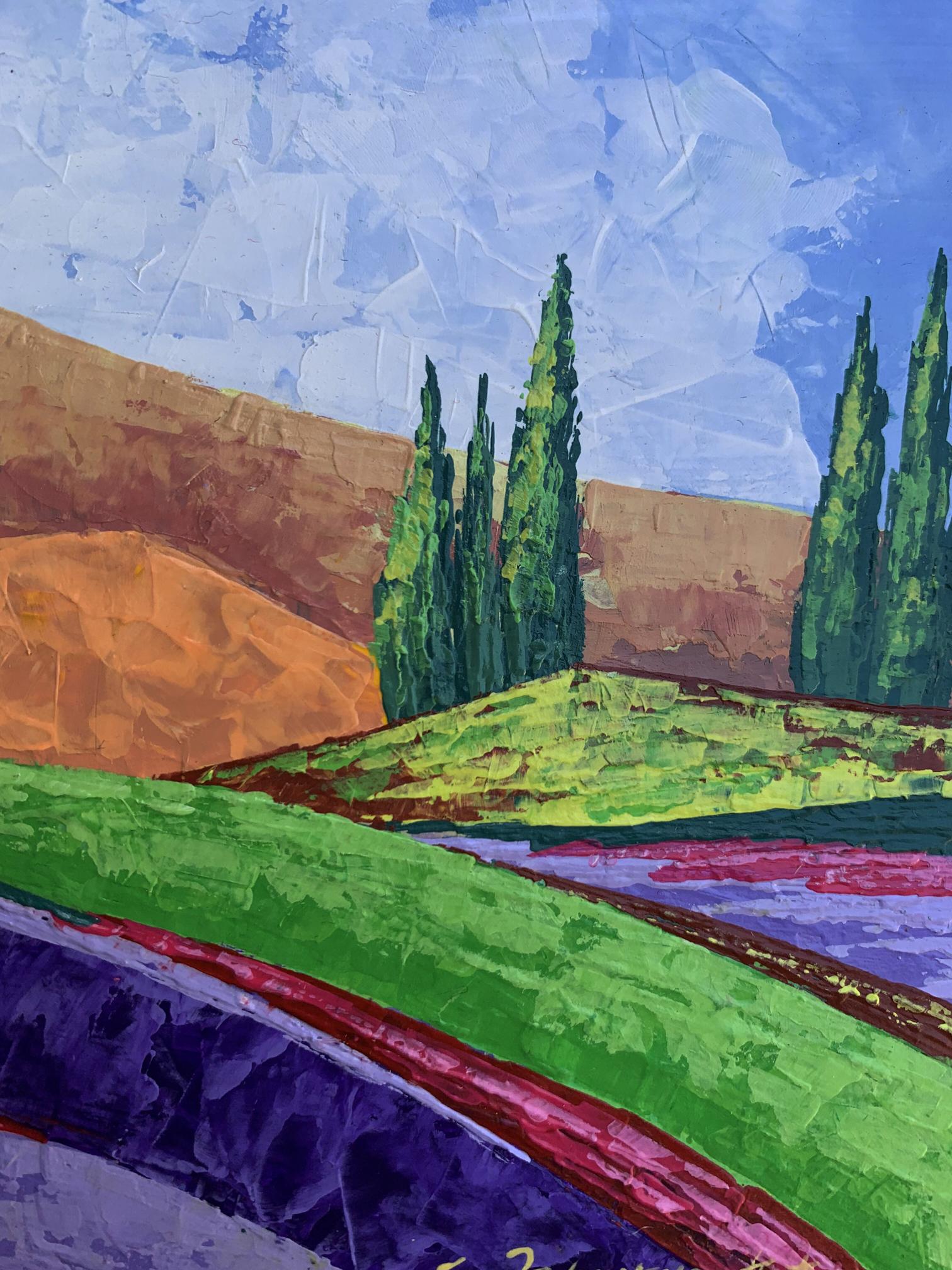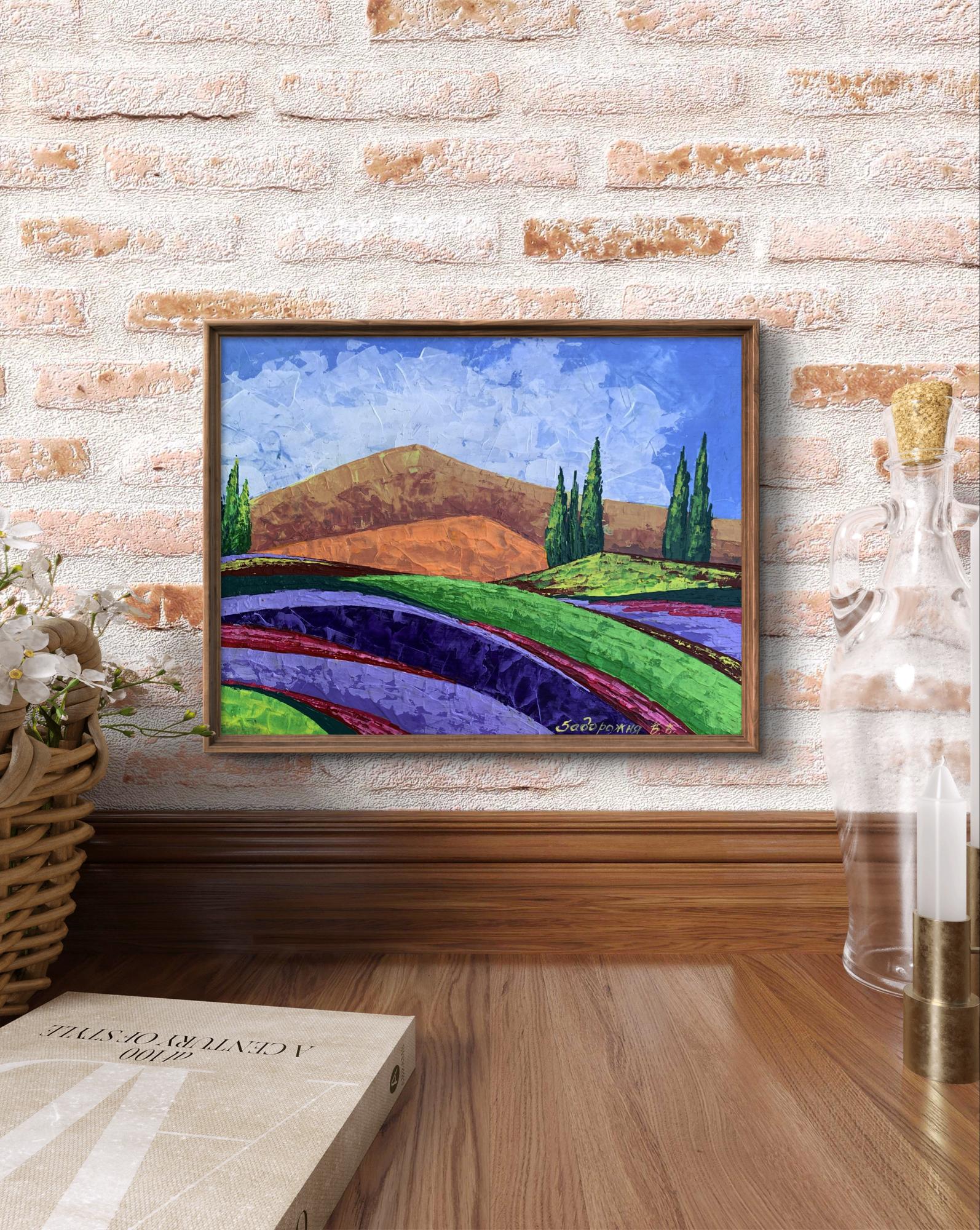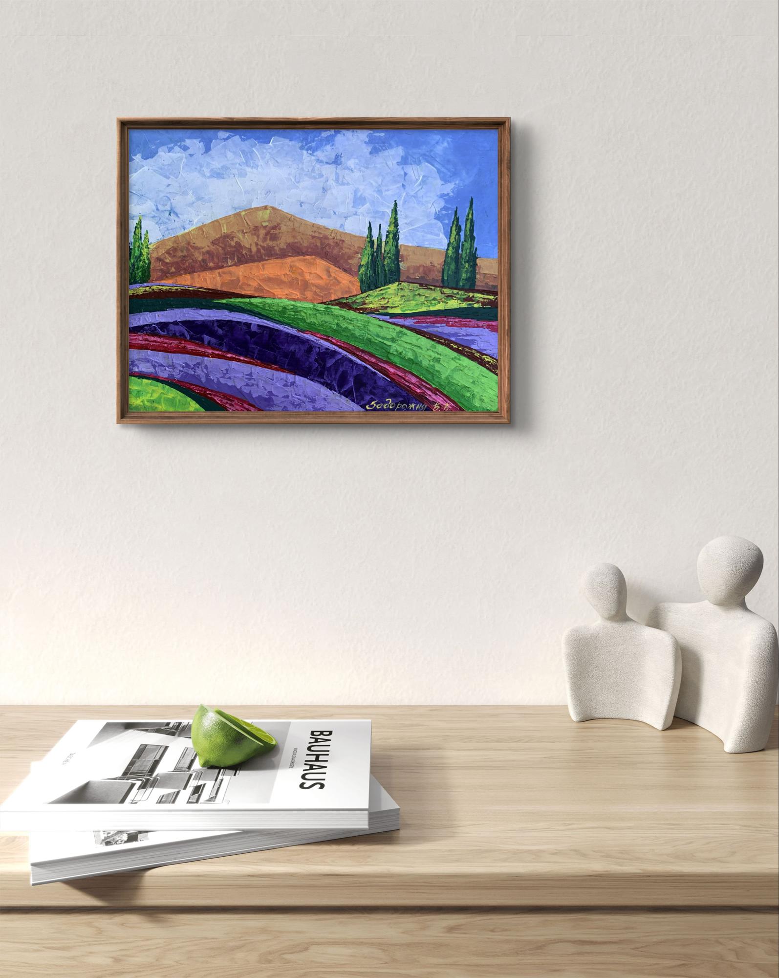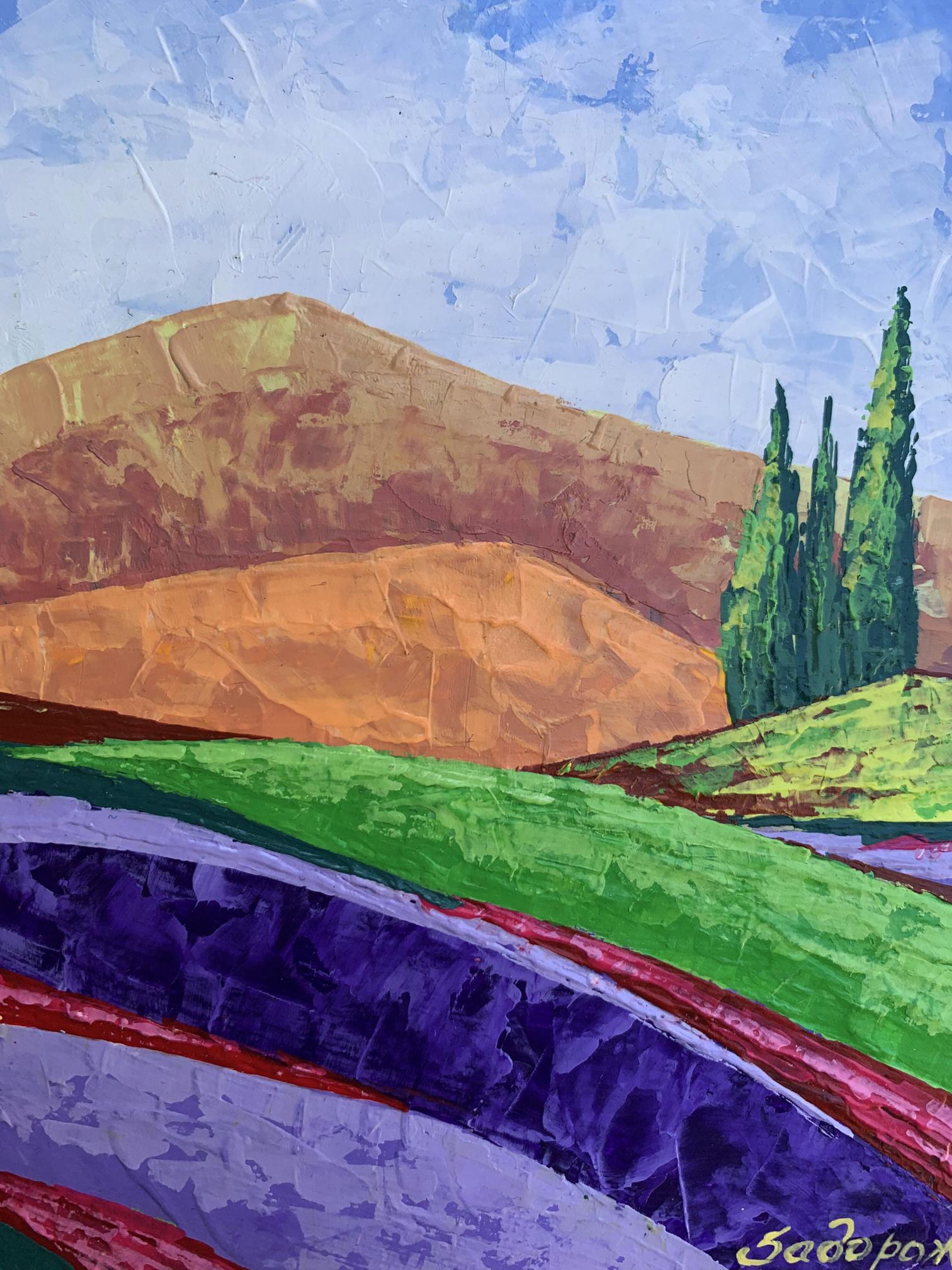 "In the Mountains" is a vivid and engaging oil painting that captures the essence of a serene and colorful mountain landscape. The artist employs a rich palette and textured brushstrokes to create a scene that is both dynamic and tranquil. The sky is painted in soft blues with hints of white, suggesting a clear, sunny day. The clouds are lightly textured, adding depth and a sense of calm to the sky. The mountains are depicted in warm tones of orange and brown, creating a striking contrast with the cool colors of the sky and fields. The use of these warm hues gives the mountains a sunlit appearance, enhancing the overall warmth of the scene. Tall, slender trees are painted in deep greens, standing prominently against the backdrop of the mountains. Their vertical form contrasts with the horizontal layers of the landscape, adding balance to the composition. The foreground fields are a vibrant mix of greens, purples, and reds. These colors are applied with thick, expressive strokes, creating a textured surface that draws the viewer’s eye across the landscape. The foreground is dominated by the colorful fields, which are painted in curved, sweeping lines that lead the viewer's eye towards the mountains and trees in the distance. The middle ground features the gently sloping hills and the line of trees, providing a sense of depth and perspective. The background is defined by the majestic mountains, which provide a sense of scale and grandeur to the composition. The sky above adds an expansive feel to the scene. The mountains are a central feature, depicted in warm, earthy tones that contrast with the cooler colors of the fields and sky. They add a sense of stability and permanence to the scene. The trees are rendered in deep greens and stand out against the warm tones of the mountains. Their vertical form adds structure and balance to the painting. The fields are a striking element, with their varied colors and bold, textured brushstrokes. They create a vibrant and dynamic foreground that complements the more subdued tones of the mountains and sky. The overall mood of "In the Mountains" is one of tranquility and natural beauty. The warm tones of the mountains and the vibrant colors of the fields evoke a sense of warmth and vitality, while the clear sky and serene landscape provide a calming effect. The painting invites the viewer to appreciate the harmony and beauty of the natural world. The painting can be interpreted as a celebration of the beauty and diversity of nature. The vibrant colors and dynamic composition convey a sense of energy and life, while the serene mountains and sky offer a sense of calm and peace. It is a reminder of the simple pleasures of observing a beautiful landscape and the harmony that can be found in nature. Overall, "In the Mountains" is a captivating depiction of a vibrant and serene landscape. The artist’s use of color, texture, and composition creates a scene that is both lively and peaceful, inviting viewers to immerse themselves in the beauty of nature.