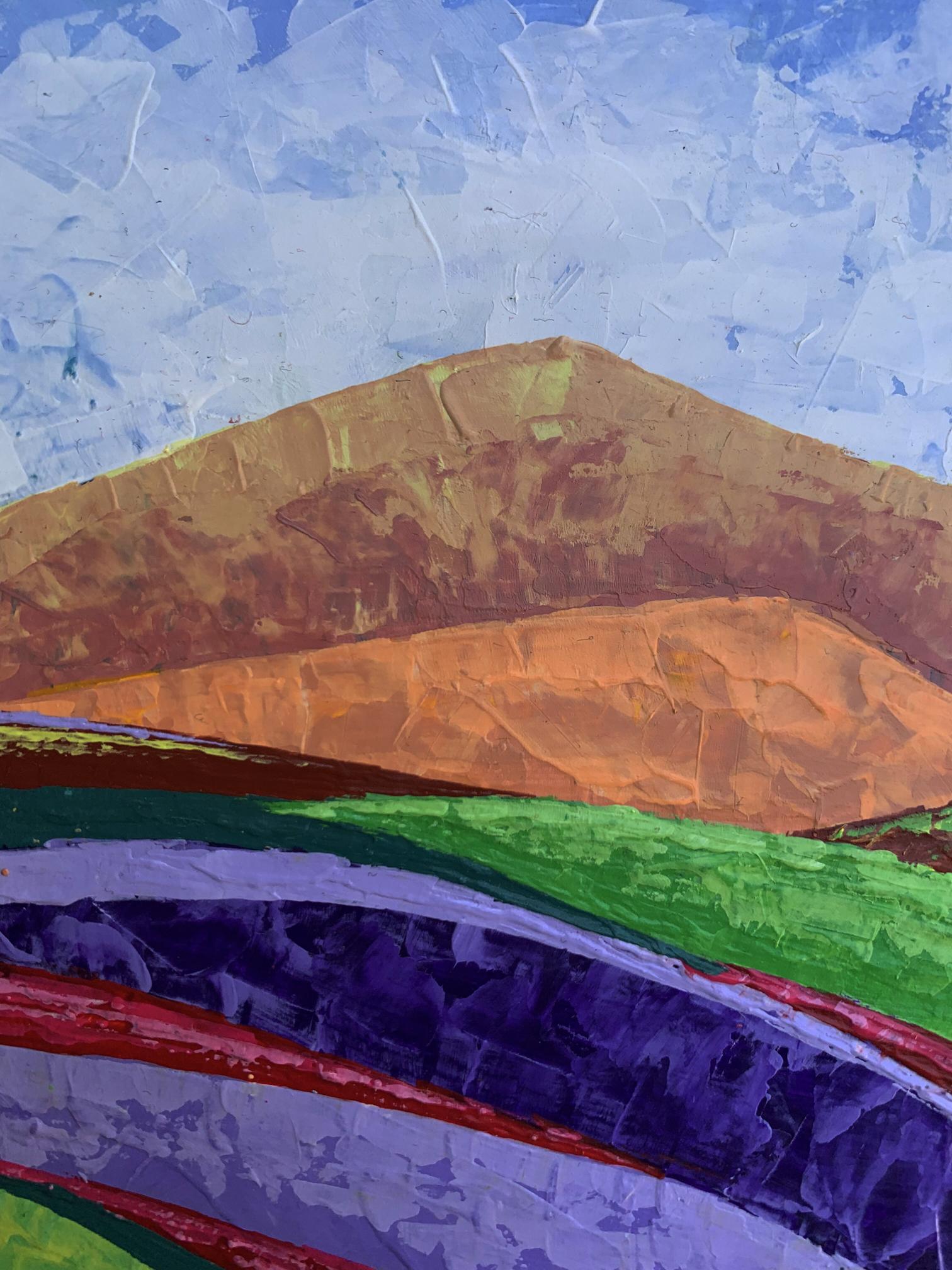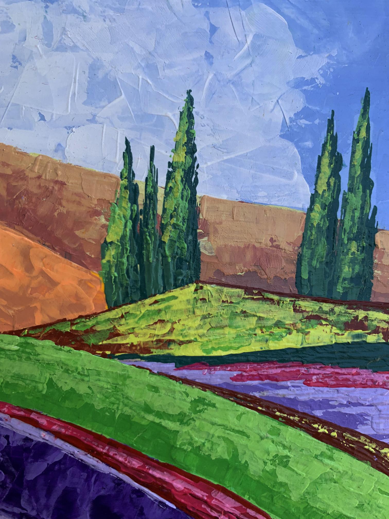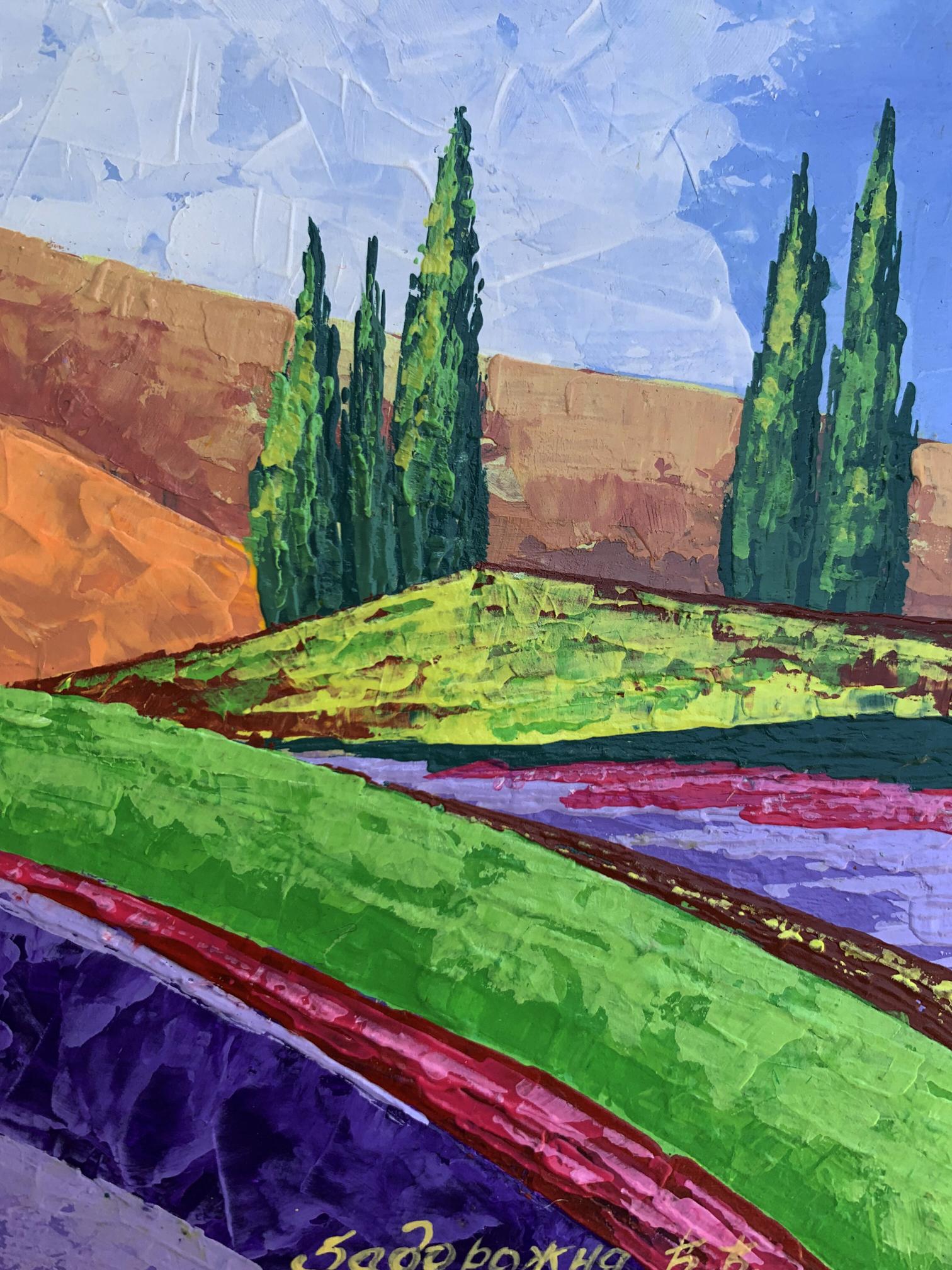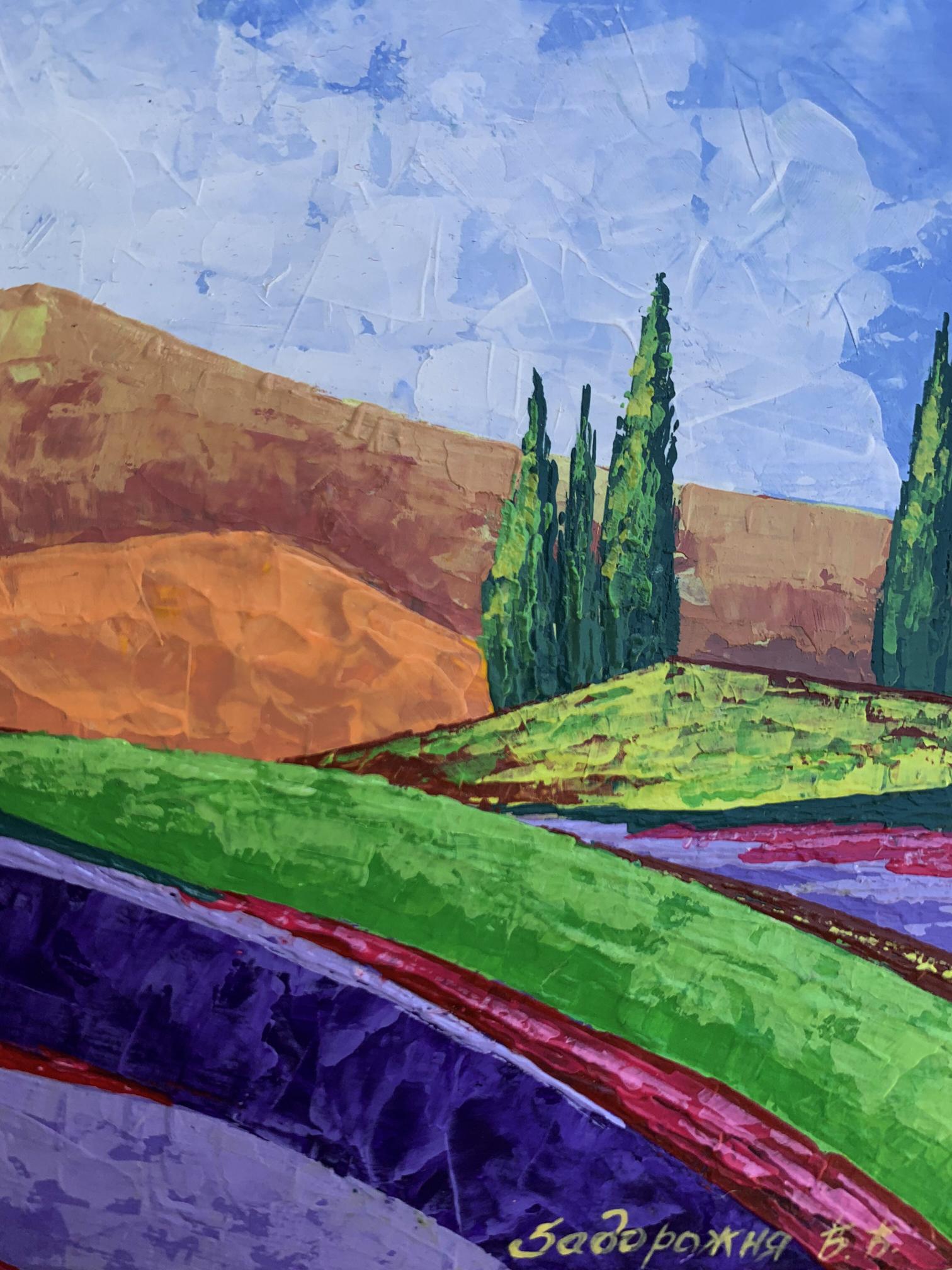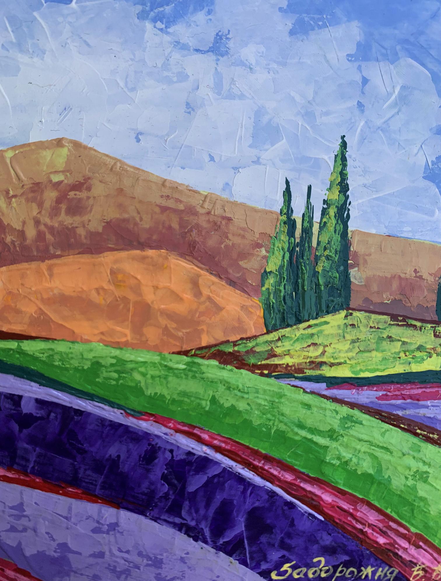 "In the Mountains" is a vivid and engaging oil painting that captures the essence of a serene and colorful mountain landscape. The artist employs a rich palette and textured brushstrokes to create a scene that is both dynamic and tranquil. The sky is painted in soft blues with hints of white, suggesting a clear, sunny day. The clouds are lightly textured, adding depth and a sense of calm to the sky. The mountains are depicted in warm tones of orange and brown, creating a striking contrast with the cool colors of the sky and fields. The use of these warm hues gives the mountains a sunlit appearance, enhancing the overall warmth of the scene. Tall, slender trees are painted in deep greens, standing prominently against the backdrop of the mountains. Their vertical form contrasts with the horizontal layers of the landscape, adding balance to the composition. The foreground fields are a vibrant mix of greens, purples, and reds. These colors are applied with thick, expressive strokes, creating a textured surface that draws the viewer’s eye across the landscape. The foreground is dominated by the colorful fields, which are painted in curved, sweeping lines that lead the viewer's eye towards the mountains and trees in the distance. The middle ground features the gently sloping hills and the line of trees, providing a sense of depth and perspective. The background is defined by the majestic mountains, which provide a sense of scale and grandeur to the composition. The sky above adds an expansive feel to the scene. The mountains are a central feature, depicted in warm, earthy tones that contrast with the cooler colors of the fields and sky. They add a sense of stability and permanence to the scene. The trees are rendered in deep greens and stand out against the warm tones of the mountains. Their vertical form adds structure and balance to the painting. The fields are a striking element, with their varied colors and bold, textured brushstrokes. They create a vibrant and dynamic foreground that complements the more subdued tones of the mountains and sky. The overall mood of "In the Mountains" is one of tranquility and natural beauty. The warm tones of the mountains and the vibrant colors of the fields evoke a sense of warmth and vitality, while the clear sky and serene landscape provide a calming effect. The painting invites the viewer to appreciate the harmony and beauty of the natural world. The painting can be interpreted as a celebration of the beauty and diversity of nature. The vibrant colors and dynamic composition convey a sense of energy and life, while the serene mountains and sky offer a sense of calm and peace. It is a reminder of the simple pleasures of observing a beautiful landscape and the harmony that can be found in nature. Overall, "In the Mountains" is a captivating depiction of a vibrant and serene landscape. The artist’s use of color, texture, and composition creates a scene that is both lively and peaceful, inviting viewers to immerse themselves in the beauty of nature.