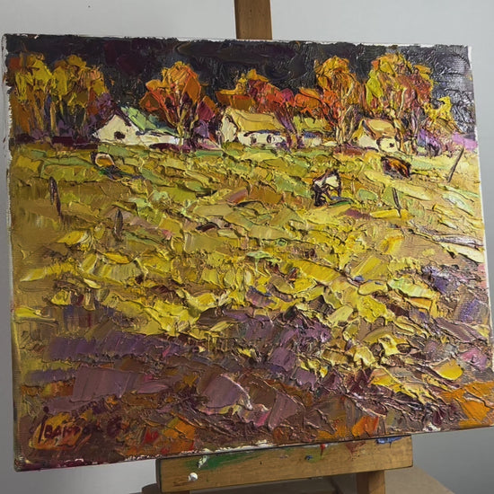 "In the Pasture" belongs to the esteemed Collection of Village Landscapes and Collection of Autumn Landscapes, highlighting the harmonious blend of rural life and the changing seasons. Each piece in these collections, including this painting, represents Kalenyuk’s exceptional talent in capturing the essence of rural tranquility and autumnal vibrancy.