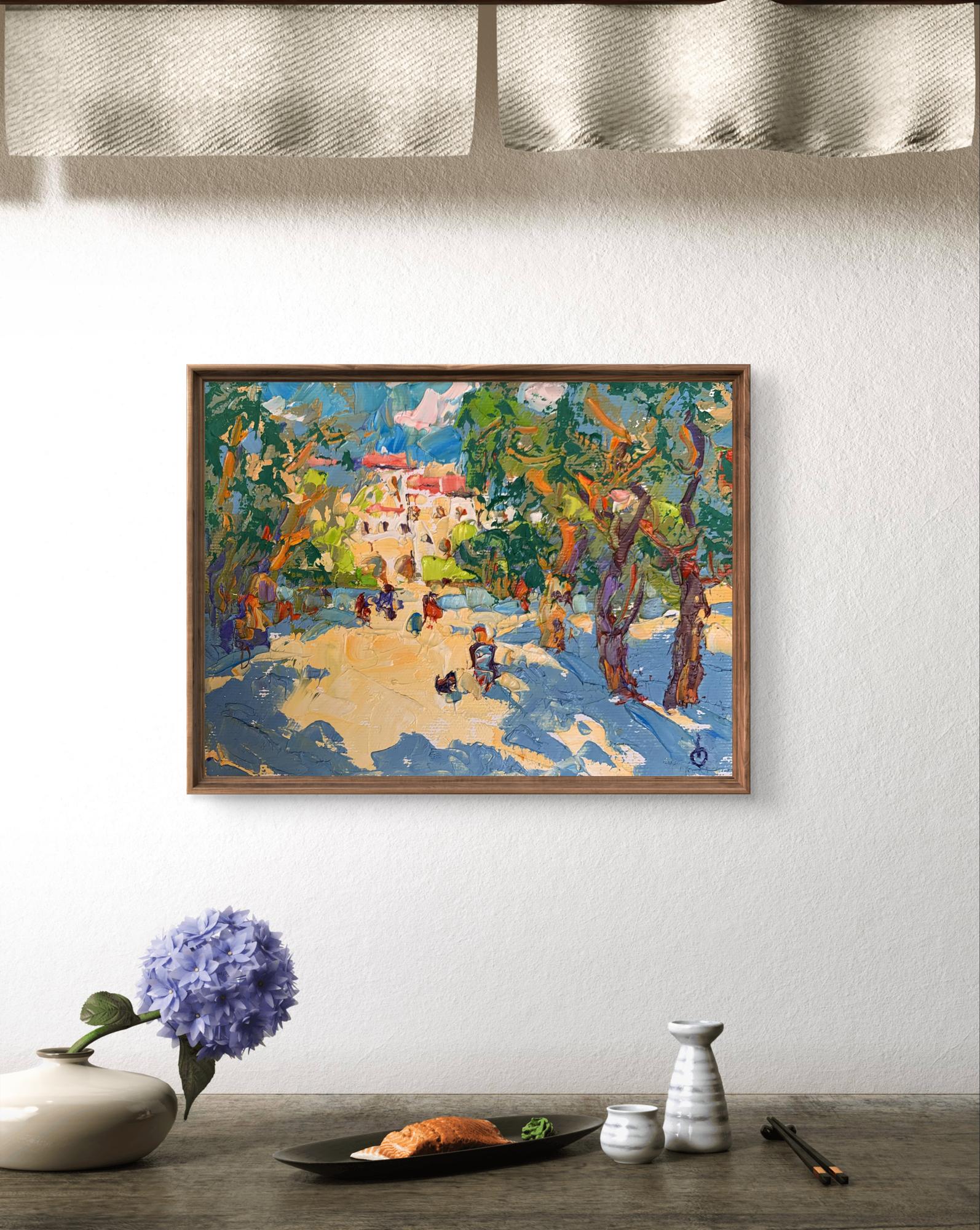 The painting "In the Shadow of a City Park" is a vibrant and impressionistic oil on canvas piece that captures the serene and lively atmosphere of a city park, filled with people enjoying their time under the shade of trees. The artist uses a bright and diverse color palette, dominated by shades of green, blue, yellow, and orange. The technique features thick, textured brushstrokes typical of the impasto style, creating a sense of depth and movement. The energetic application of paint and the use of contrasting colors give the painting a lively and engaging atmosphere. The composition is centered around a sunlit pathway in a city park, with trees on either side casting shadows over the scene. The background shows a hint of city buildings with red roofs, suggesting an urban setting beyond the greenery of the park. Figures of people are scattered throughout, engaging in various activities, adding a sense of community and liveliness. The sunlit pathway runs through the center of the painting, painted in warm yellows and oranges. The shadows cast by the trees are depicted with cool blues, creating a striking contrast and enhancing the sense of light and shade. The trees are depicted with a mix of greens, yellows, and blues, with their trunks and branches rendered in expressive, swirling brushstrokes. The dense foliage provides a canopy of shade, adding to the cool, inviting atmosphere of the park. Various figures are depicted throughout the park, painted with quick, expressive strokes. Some are sitting, some walking, and others appear to be engaged in conversation. The use of bright colors for their clothing adds spots of interest and activity to the scene. The background features glimpses of city buildings with red roofs, painted with lighter, more diffused brushstrokes, suggesting a distance and adding depth to the composition. Overall Mood. The overall mood of the painting is peaceful and joyful, capturing the essence of a leisurely day in a city park. The vibrant colors and dynamic brushstrokes convey a sense of liveliness and relaxation, inviting viewers to imagine themselves enjoying a similar scene. "In the Shadow of a City Park" can be interpreted as a celebration of urban green spaces and the moments of tranquility and community they provide. The painting captures the interplay of light and shadow, the vibrant activity of people, and the harmonious coexistence of nature and urban life. The use of bright colors and expressive brushstrokes reflects the artist's appreciation for the beauty and vitality of city parks. This painting masterfully combines elements of impressionism and realism to create a vivid and immersive depiction of a city park, using color and texture to evoke a sense of peace and enjoyment.