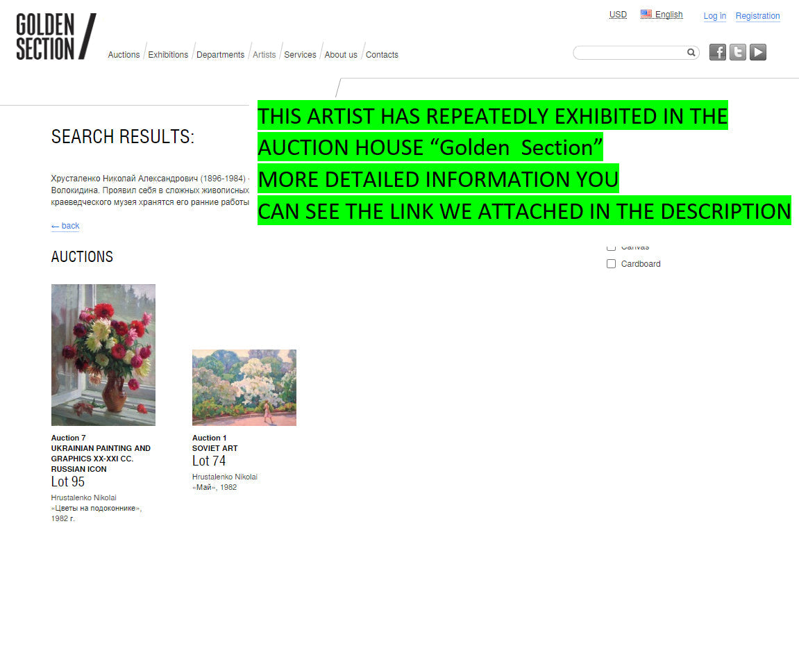 About the artists: Khrustalenko Nikolai Alexandrovich (1896-1984) - painter. Studied at the Kyiv Institute of Art (1935-1941) under F. Krichevsky and P. Volokidin. He showed himself in complex painting genres - landscapes, portraits, still lifes. His early works are kept in the funds of the Belotserkovsky Museum of Local Lore.