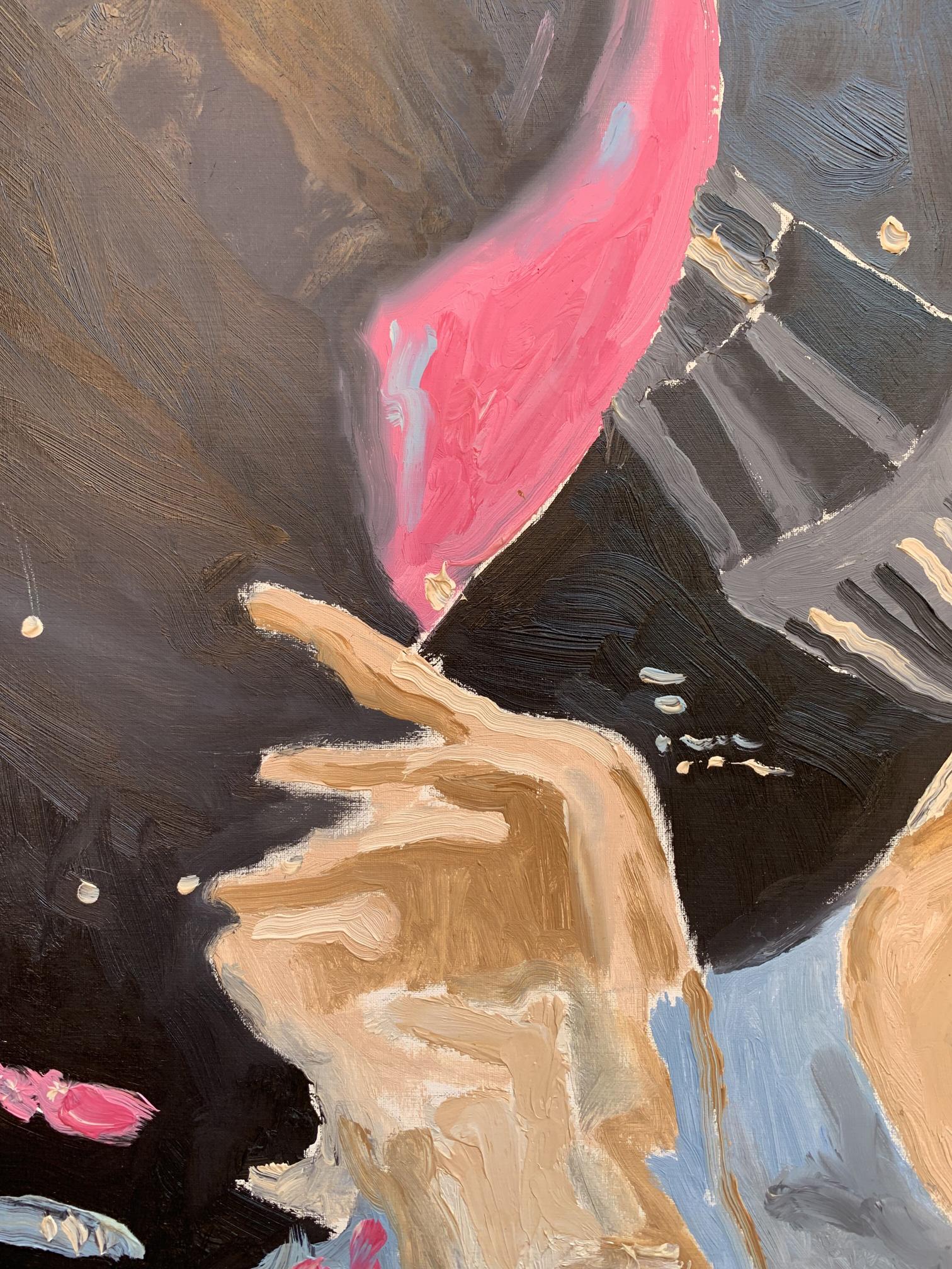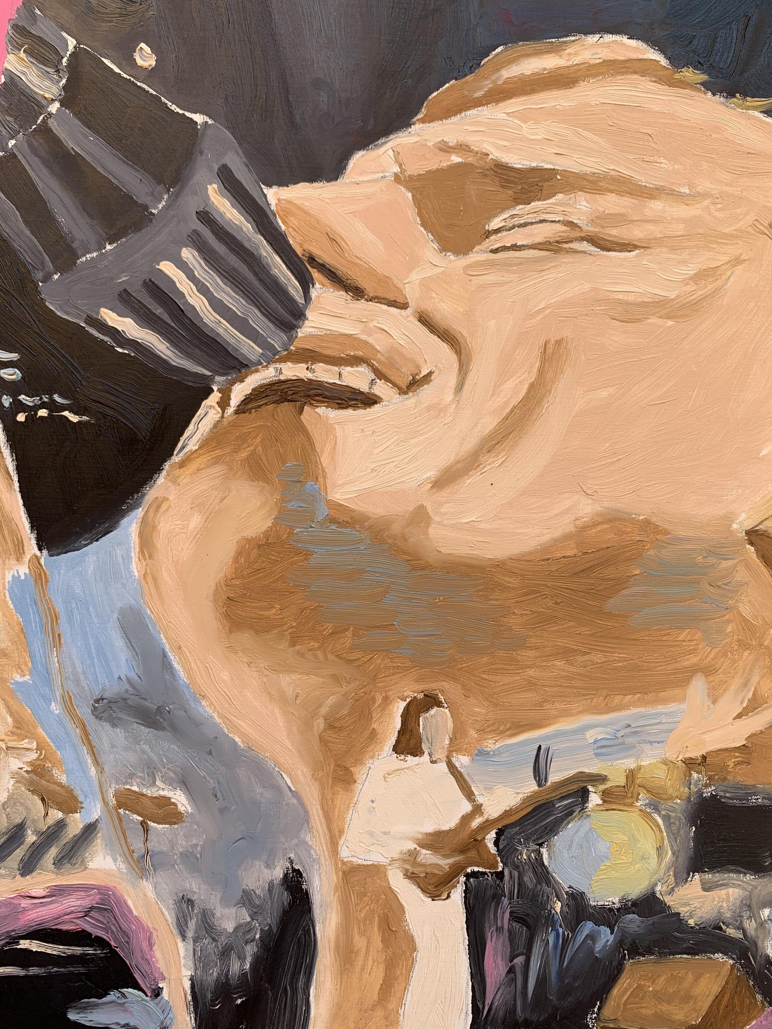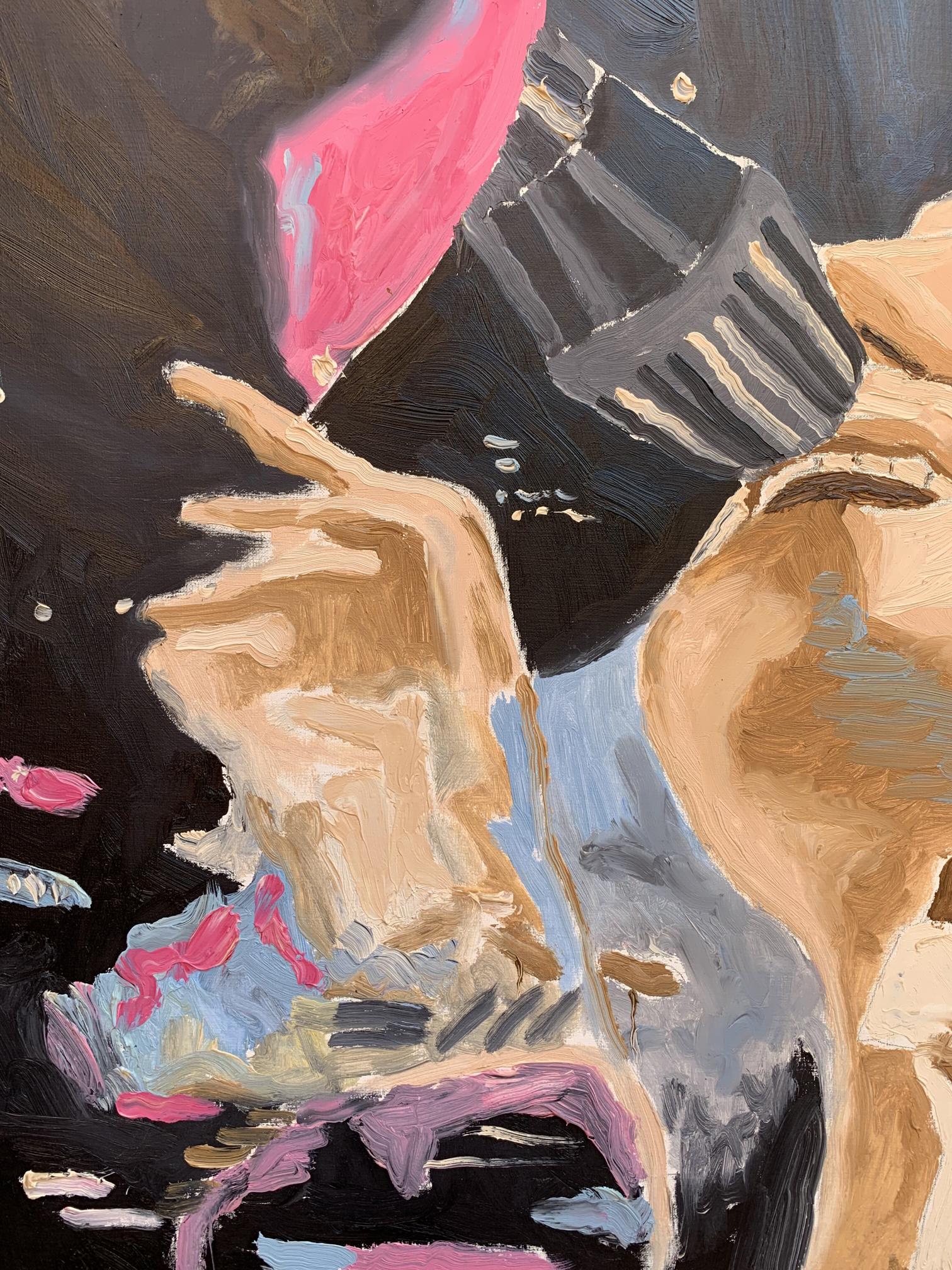 The painting "Karaoke" is an expressive and dynamic oil on canvas piece that captures the energy and passion of a live performance. The artist employs a vivid and contrasting color palette, using bold shades of black, pink, blue, and beige. The technique involves expressive and loose brushstrokes, giving the painting a sense of movement and intensity. The textures created by the thick application of paint add depth and dimension to the piece. The composition is dominated by a close-up of a singer passionately performing into a microphone. The singer's face, shown in profile, is the focal point of the painting, with exaggerated features that emphasize the emotion and energy of the performance. The background features abstract shapes and colors, suggesting stage lights and other elements of a live music setting. The singer is depicted with a sense of intense concentration and emotion, their mouth open wide as they sing into the microphone. The face is painted in shades of beige and peach, with detailed brushstrokes highlighting the contours and expressions. The microphone, rendered in dark tones with accents of light, is held close to the singer's mouth, emphasizing the connection between the performer and their music. The background is an abstract mix of dark and light colors, representing the stage environment. Swirls of pink, blue, and white suggest stage lights and the lively atmosphere of a karaoke night. The use of contrasting colors and dynamic brushstrokes creates a sense of excitement and energy, capturing the essence of a live performance. The overall mood of the painting is vibrant and exhilarating, conveying the thrill and intensity of performing music. The artist captures the raw emotion and energy of the singer, making the viewer feel as if they are part of the audience, experiencing the performance firsthand. The painting "Karaoke" is a celebration of music and performance. It captures the spirit of karaoke, where individuals express themselves through song, often with great passion and enthusiasm. The exaggerated features and bold colors highlight the dramatic and performative aspects of karaoke, making it a lively and engaging piece. This painting beautifully encapsulates the joy and intensity of a karaoke performance, using expressive brushstrokes and vibrant colors to bring the scene to life.