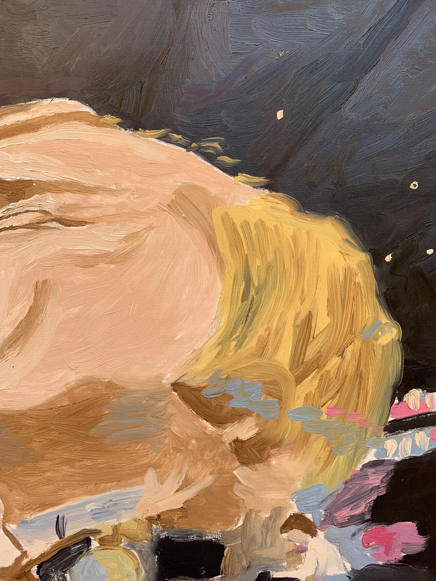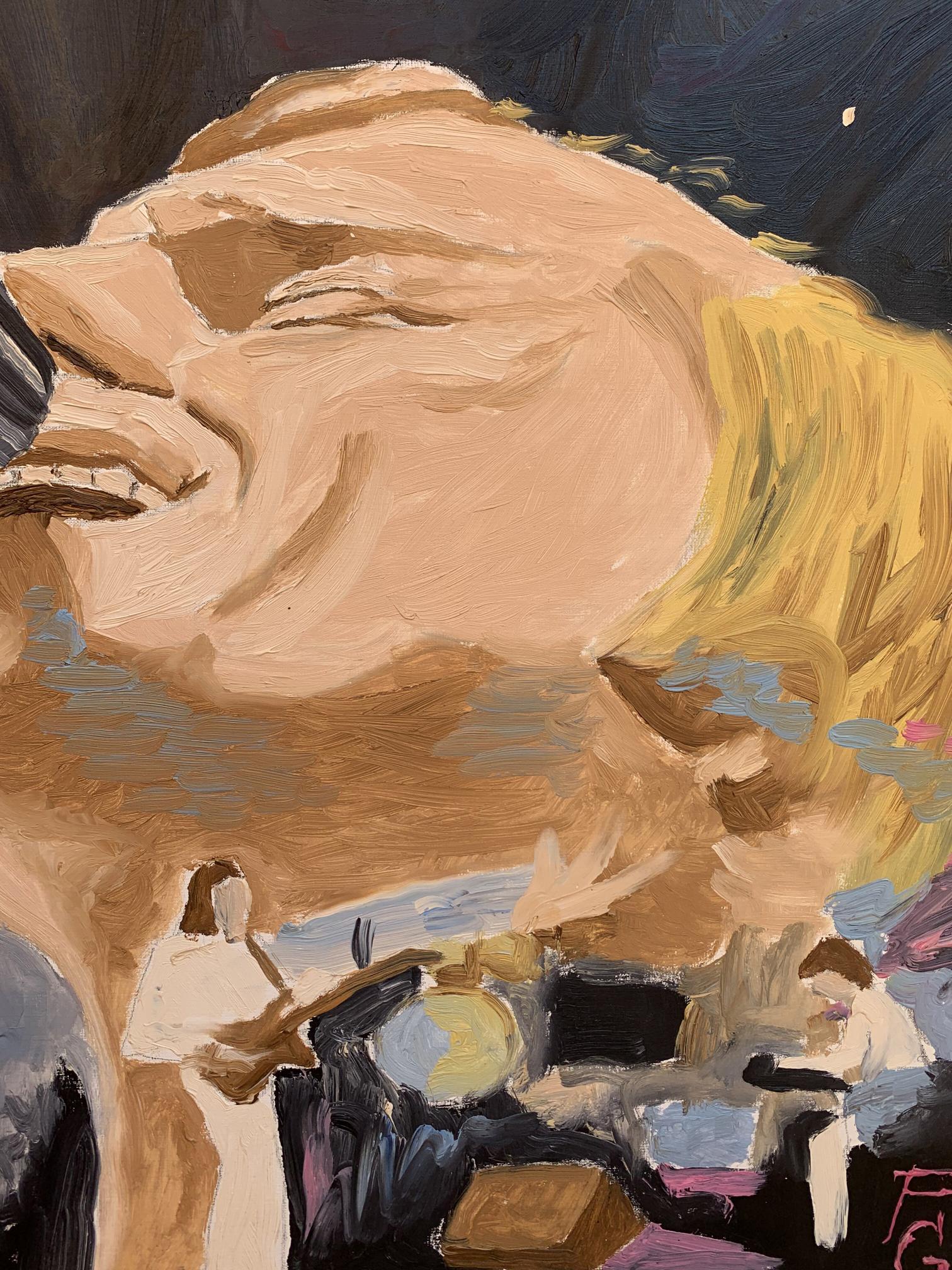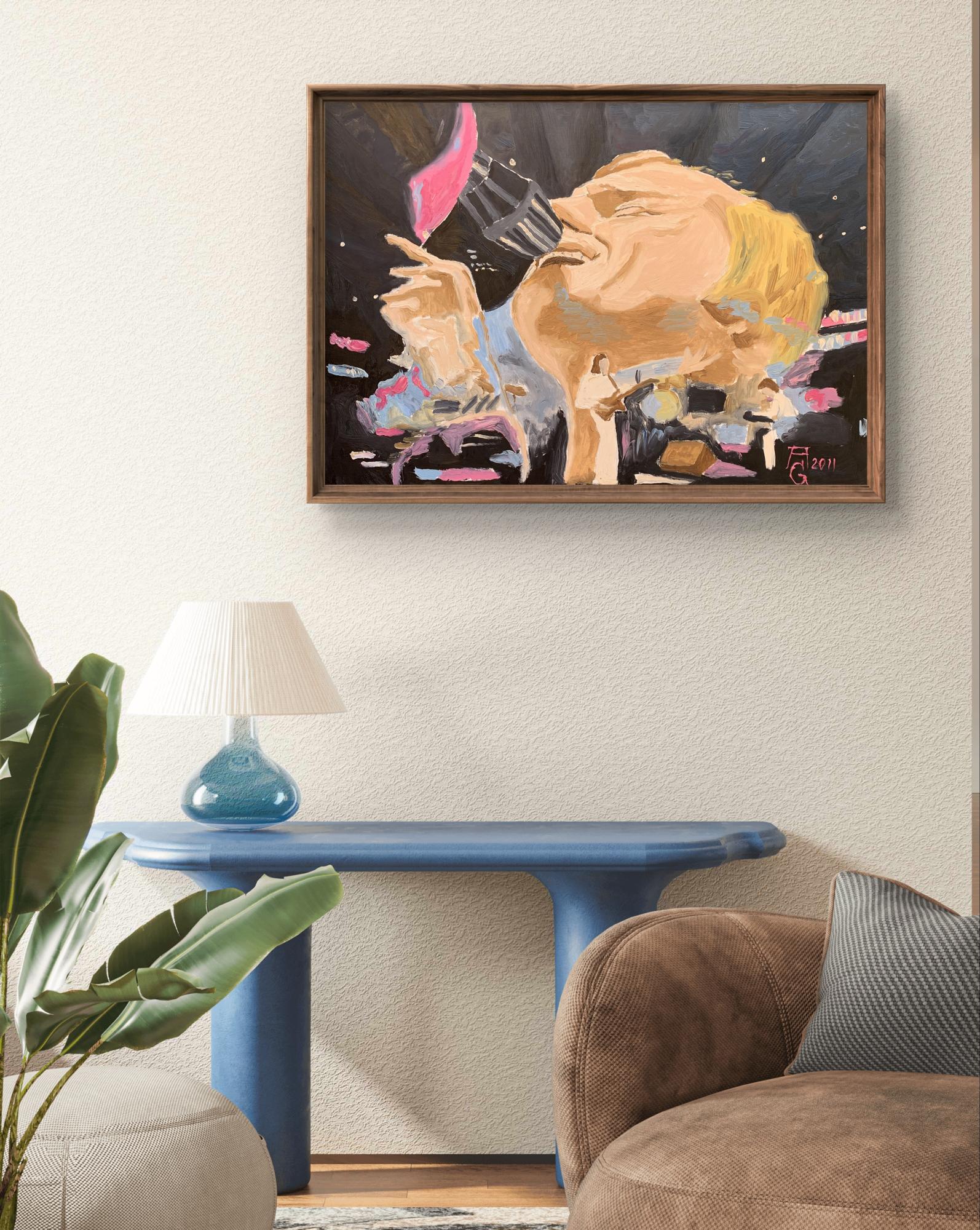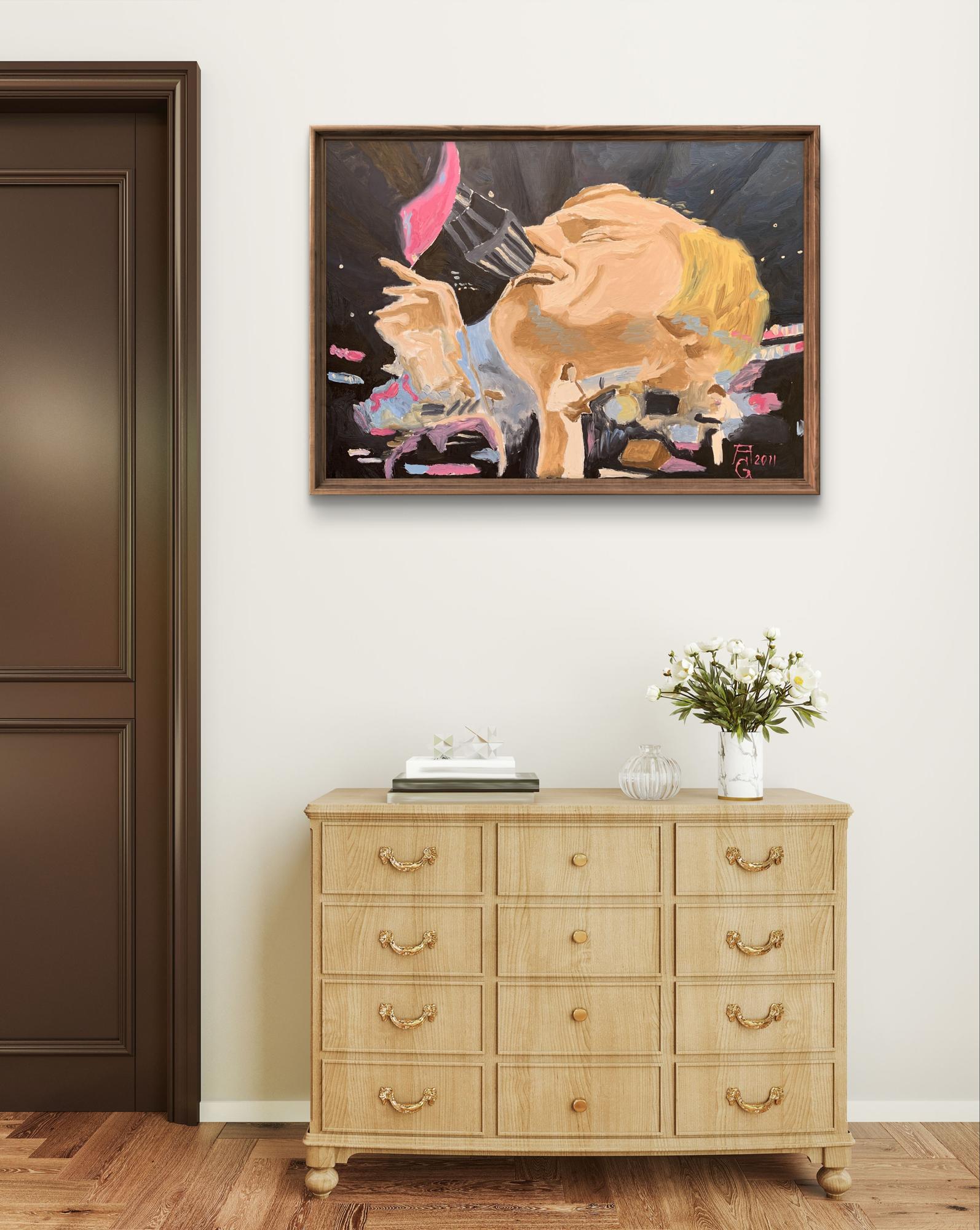 The painting "Karaoke" is an expressive and dynamic oil on canvas piece that captures the energy and passion of a live performance. The artist employs a vivid and contrasting color palette, using bold shades of black, pink, blue, and beige. The technique involves expressive and loose brushstrokes, giving the painting a sense of movement and intensity. The textures created by the thick application of paint add depth and dimension to the piece. The composition is dominated by a close-up of a singer passionately performing into a microphone. The singer's face, shown in profile, is the focal point of the painting, with exaggerated features that emphasize the emotion and energy of the performance. The background features abstract shapes and colors, suggesting stage lights and other elements of a live music setting. The singer is depicted with a sense of intense concentration and emotion, their mouth open wide as they sing into the microphone. The face is painted in shades of beige and peach, with detailed brushstrokes highlighting the contours and expressions. The microphone, rendered in dark tones with accents of light, is held close to the singer's mouth, emphasizing the connection between the performer and their music. The background is an abstract mix of dark and light colors, representing the stage environment. Swirls of pink, blue, and white suggest stage lights and the lively atmosphere of a karaoke night. The use of contrasting colors and dynamic brushstrokes creates a sense of excitement and energy, capturing the essence of a live performance. The overall mood of the painting is vibrant and exhilarating, conveying the thrill and intensity of performing music. The artist captures the raw emotion and energy of the singer, making the viewer feel as if they are part of the audience, experiencing the performance firsthand. The painting "Karaoke" is a celebration of music and performance. It captures the spirit of karaoke, where individuals express themselves through song, often with great passion and enthusiasm. The exaggerated features and bold colors highlight the dramatic and performative aspects of karaoke, making it a lively and engaging piece. This painting beautifully encapsulates the joy and intensity of a karaoke performance, using expressive brushstrokes and vibrant colors to bring the scene to life.