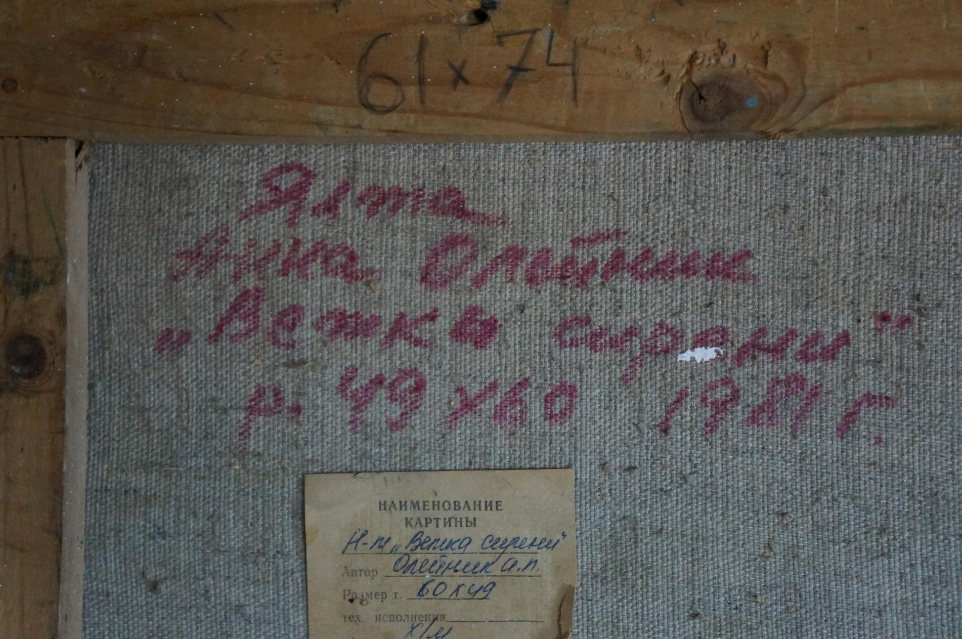 About the artist: Born July 2, 1924 in the village. Big Ostrozhok Vinnytsia region. She graduated from the Zaporizhzhya Studio of Fine Arts. Since 1945 he lives and works in Yalta. Since 1947, she worked in art workshops on design work. Since 1960, she has participated in city, regional, republican, all-union, and international exhibitions. Since 1968 she visited creative summer houses in Palanga and Sednev. Since 1977 - member of the National Union of Artists. She worked in Yalta CX for more than 50 years. Since 2004 - Honored Artist of the ARC. In 2005 she became a laureate of the contest “Public Recognition of Yalta”. In 2008 - laureate of the Prize named after A.P. Chekhov. In 2010 she received a silver medal "For excellence" of the International Fund "Cultural Heritage" (St. Petersburg). The works are in museums and private collections in Ukraine, Russia, Kazakhstan, Lithuania, Poland, Germany, England, France, Sweden, Norway, Israel, Japan, the USA, countries of the former Czechoslovakia and Yugoslavia.