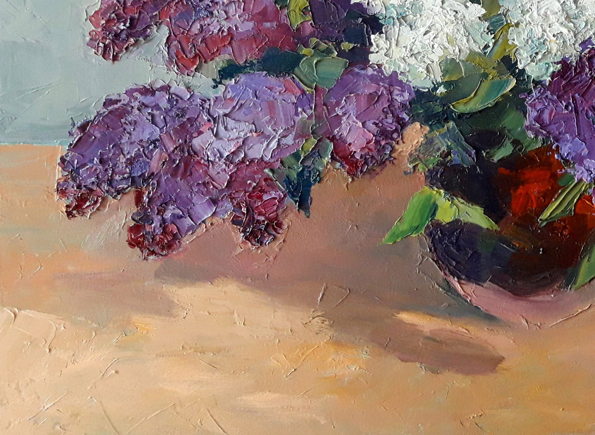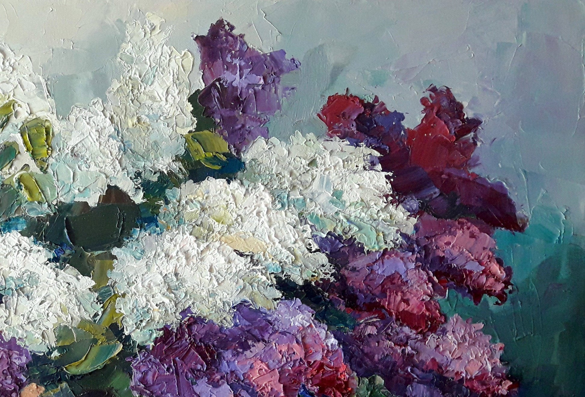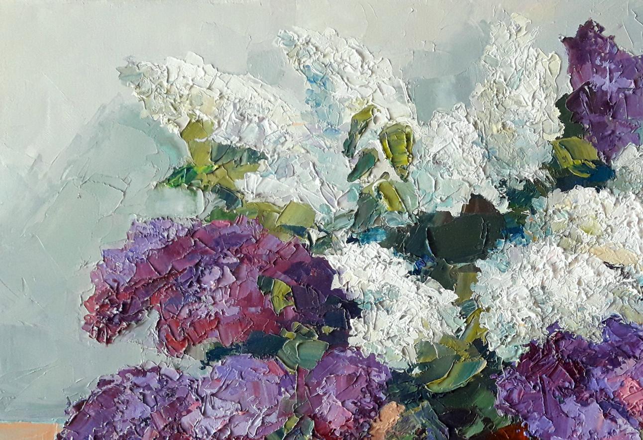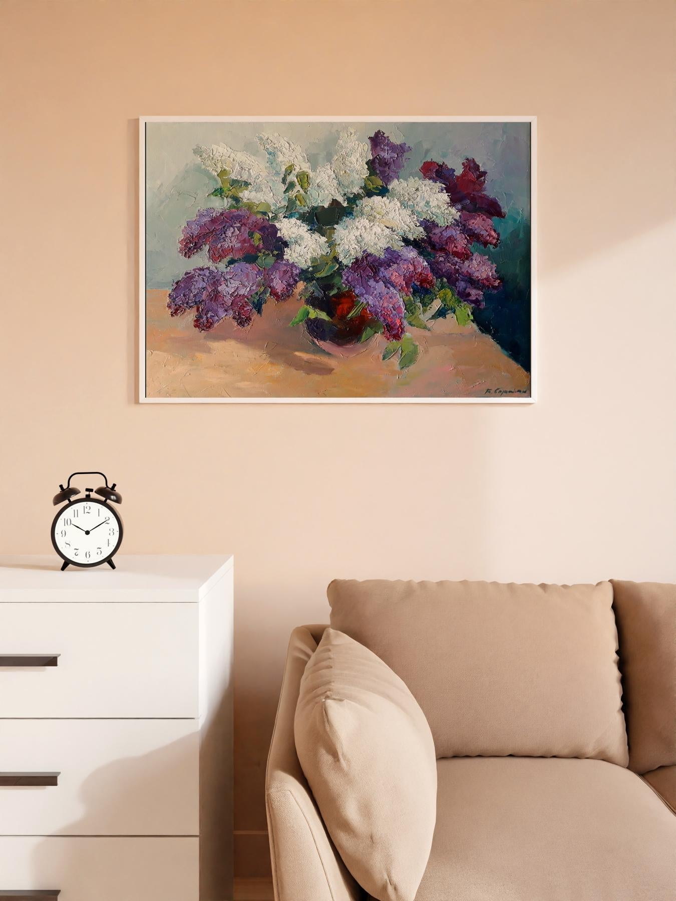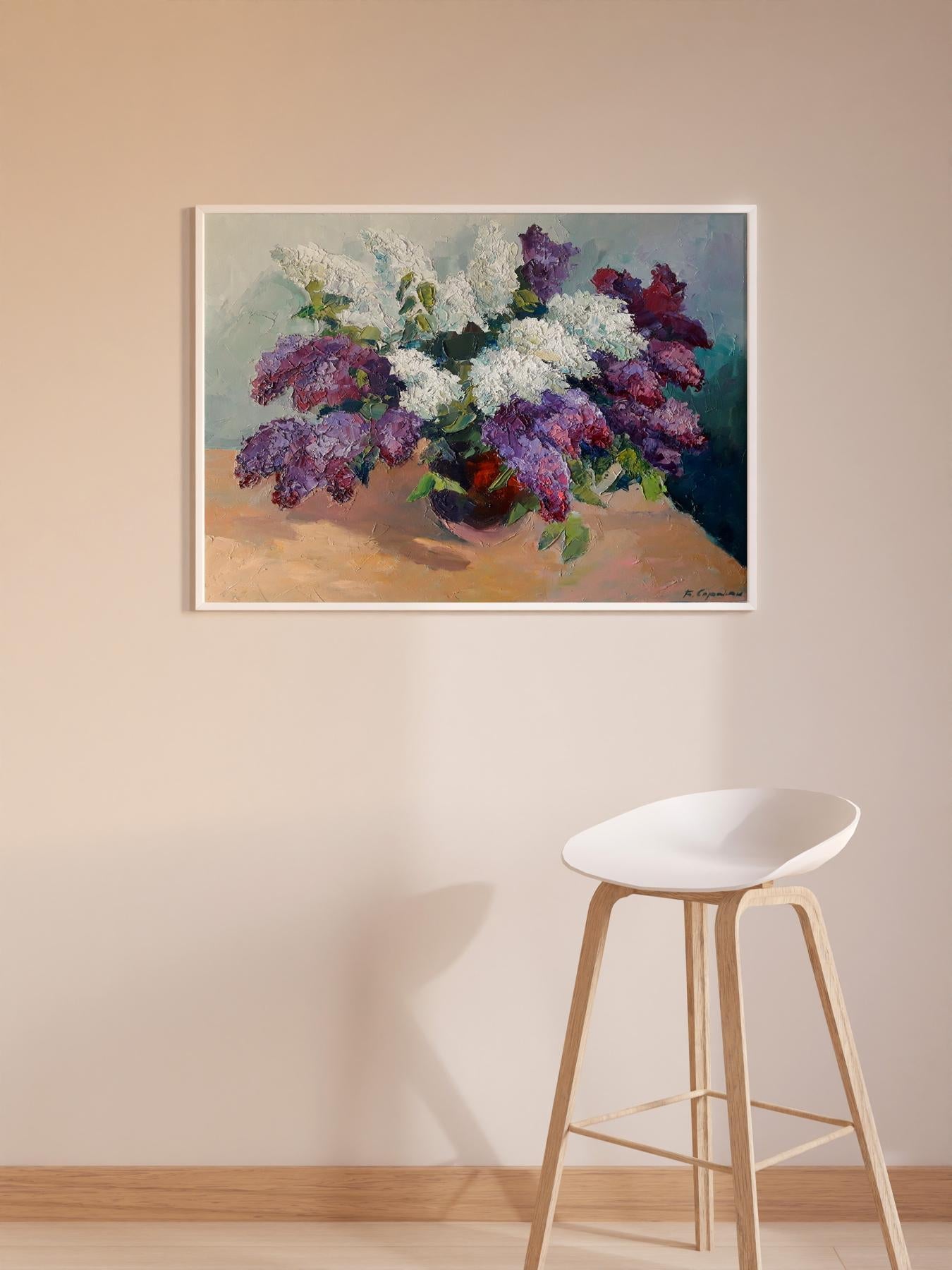 Looking for a stunning piece of art to liven up your home? Check out our oil painting "Lilac"! This vibrant and beautiful painting features a large bouquet of white and purple lilacs, with lush green leaves. It's sure to add a touch of elegance to any room.