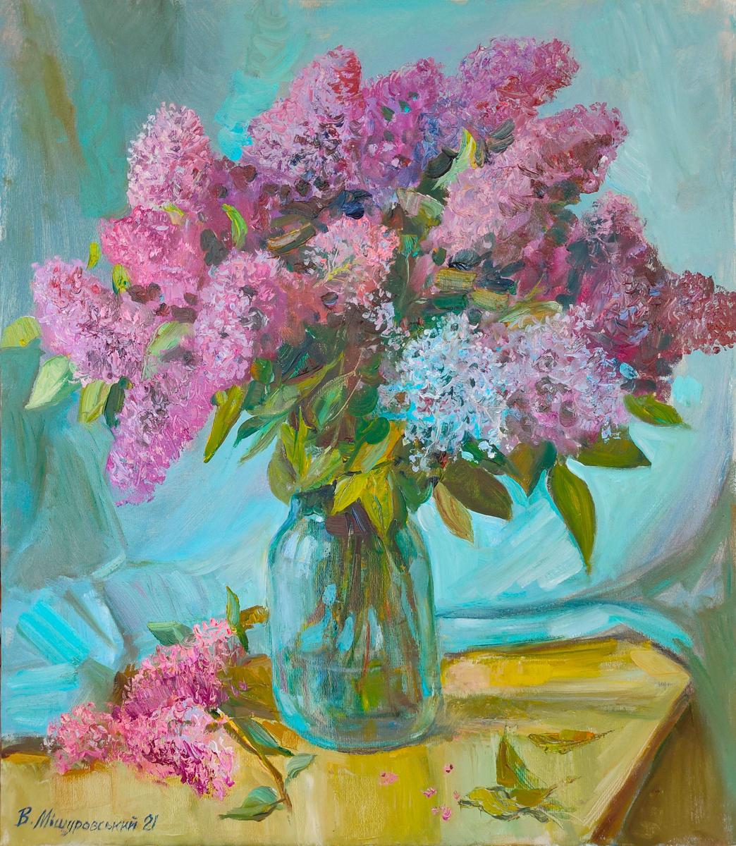 The artwork features a generous bouquet of lilacs arranged in a simple glass vase against a backdrop of soft, harmonious tones that enhance the floral display. Myshurovsky’s brushwork is both expressive and dynamic, capturing the varied hues of the lilacs from deep purples to light pinks. Each cluster of flowers is distinctly rendered, emphasizing the natural variety and beauty of the lilacs. Details such as the reflections on the vase add realism and depth to the composition, while scattered petals beneath the vase underscore the transient nature of the blossoms' peak beauty.