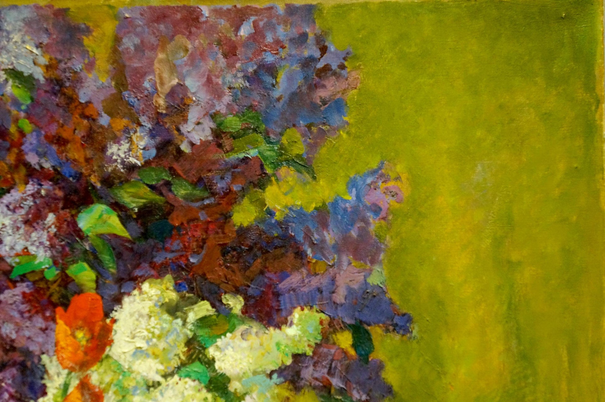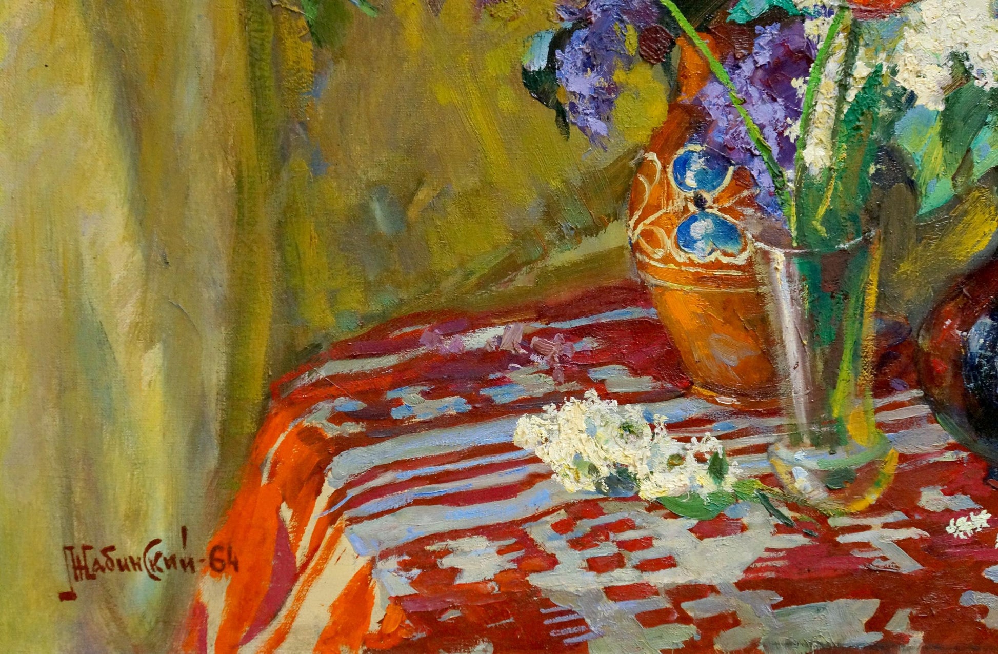 Oil painting Lilacs and tulips on the table Leonid Zhabinsky