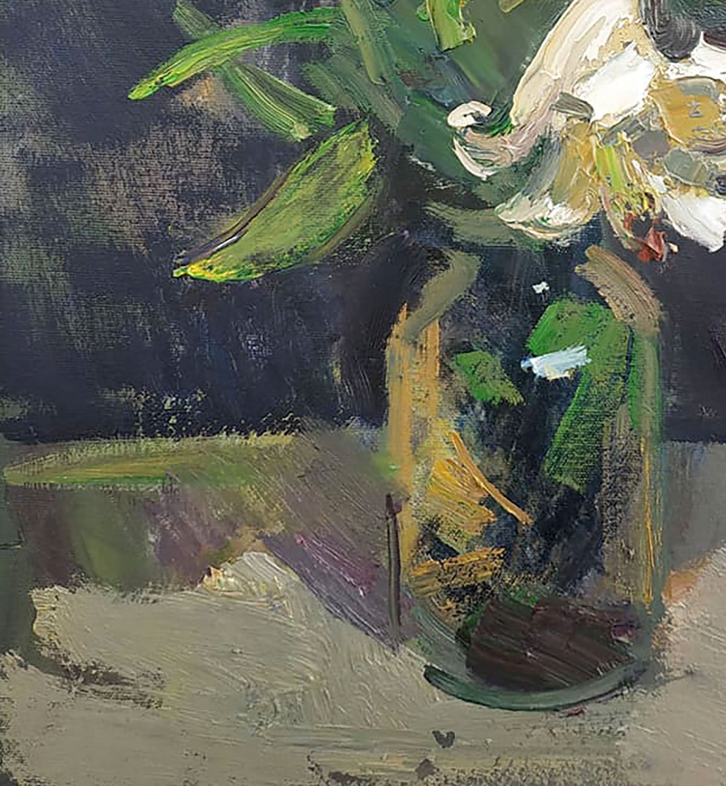 Mazur’s focus on the natural form of the lilies highlights their delicate nature, and the addition of a glass vase introduces a sense of domestic tranquility. This work invites viewers to admire the understated beauty found in everyday life, where even the most fleeting moments can evoke a deep appreciation for nature. Perfect for a Collection of Still lifes or a Collection of Painting with Flowers, "Lilies" provides a serene and contemplative atmosphere. If you're looking to Buy a Oil painting that captures the essence of nature's elegance, this piece is an ideal choice.