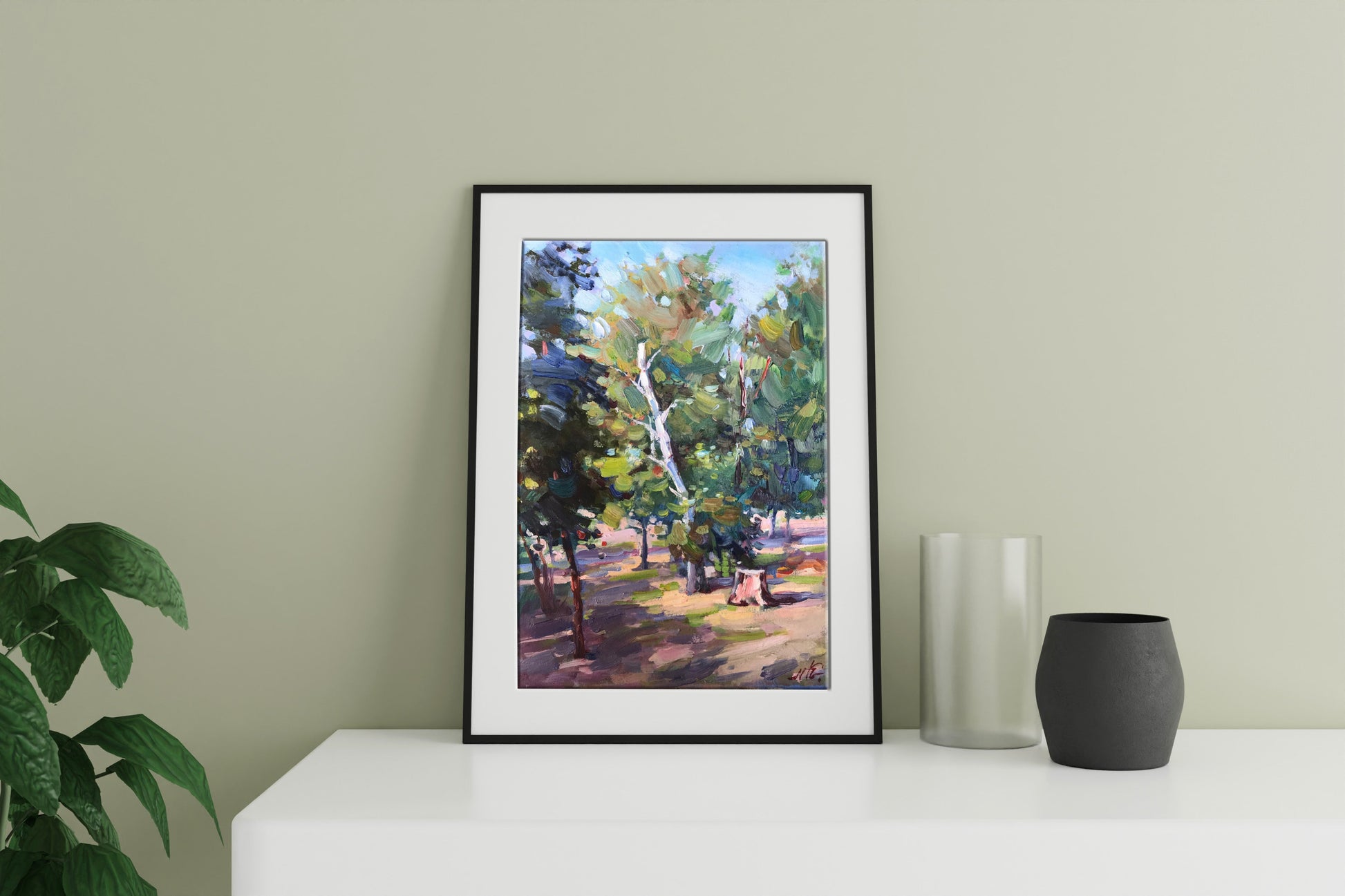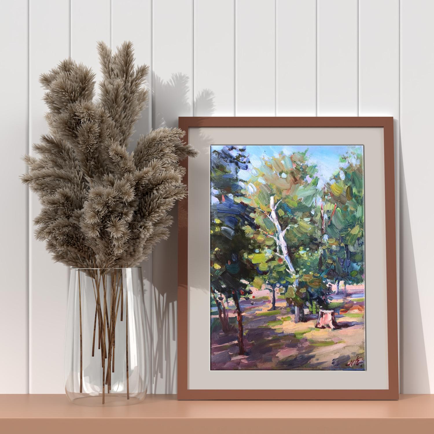 This oil painting, entitled "Lonely Birch", is a beautiful and serene work of art. It features a lovely birch tree in a meadow, with sunlight streaming down upon it. The painting is set in an idyllic arboretum or park, and the viewer can almost feel the warm sun on their face. The muted colors and peaceful setting make this painting perfect for any room in your home. It would also make a thoughtful gift for someone special in your life.