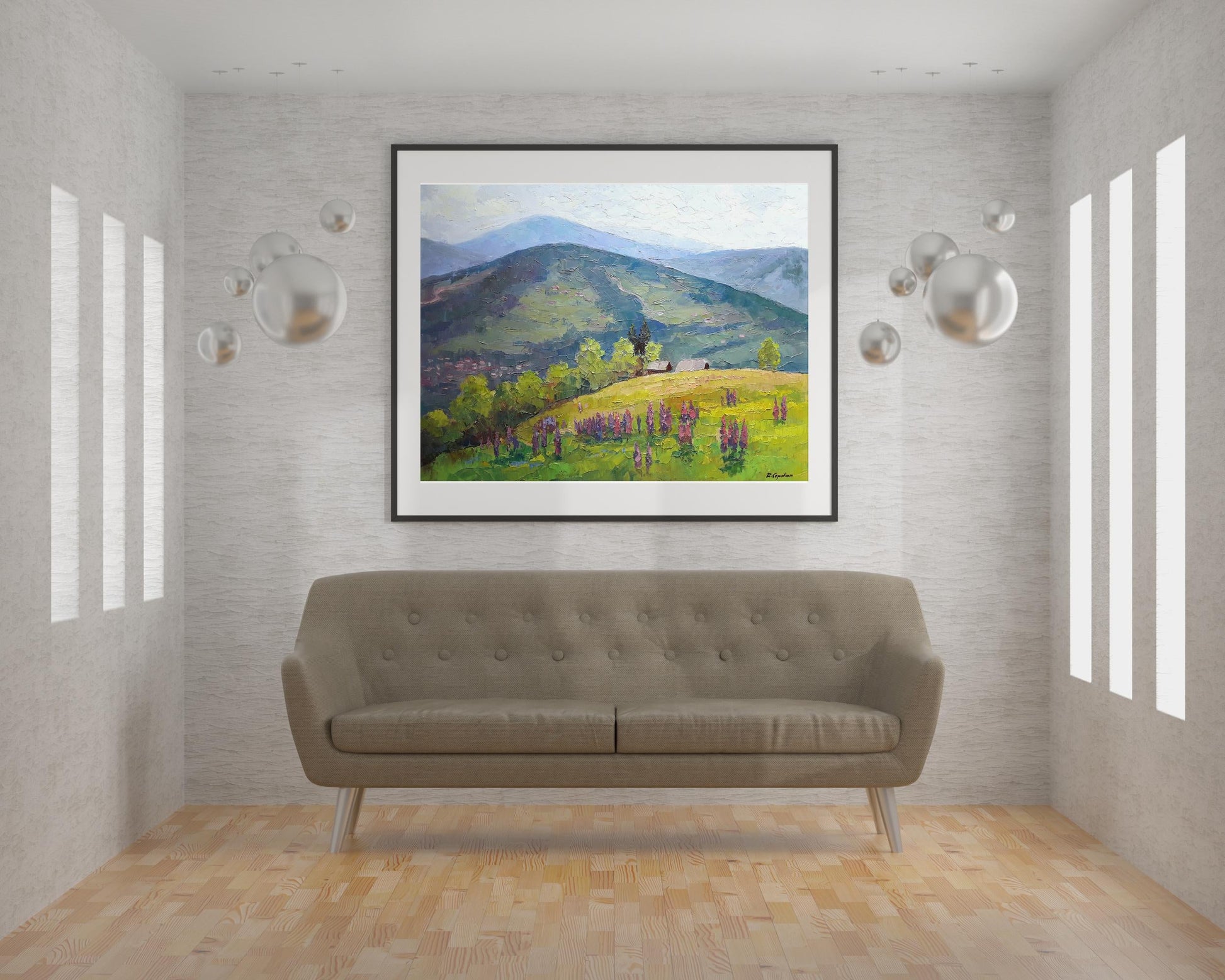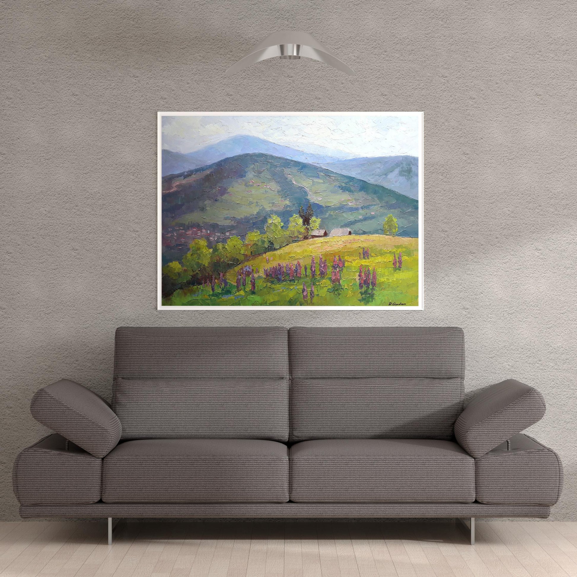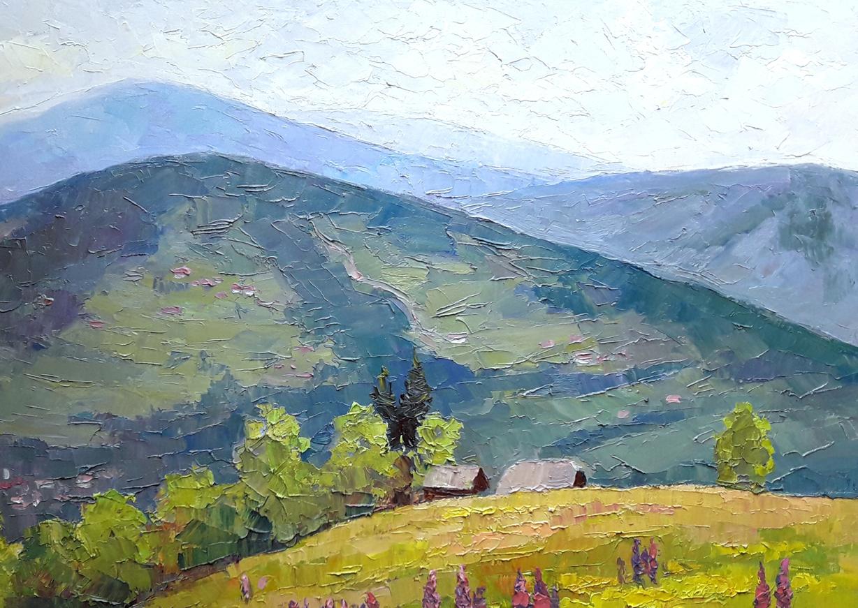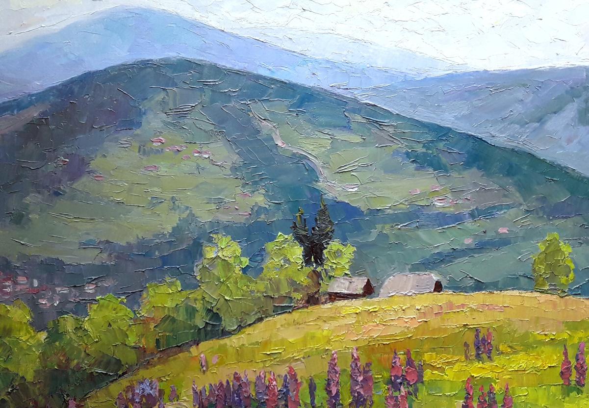Looking at the oil painting "Lupine", one can't help but feel a sense of peace and tranquility. The mountain top meadow is blanketed in a sea of beautiful flowers, with the village deep in the valley below. It's easy to imagine oneself taking a peaceful stroll through this idyllic setting.