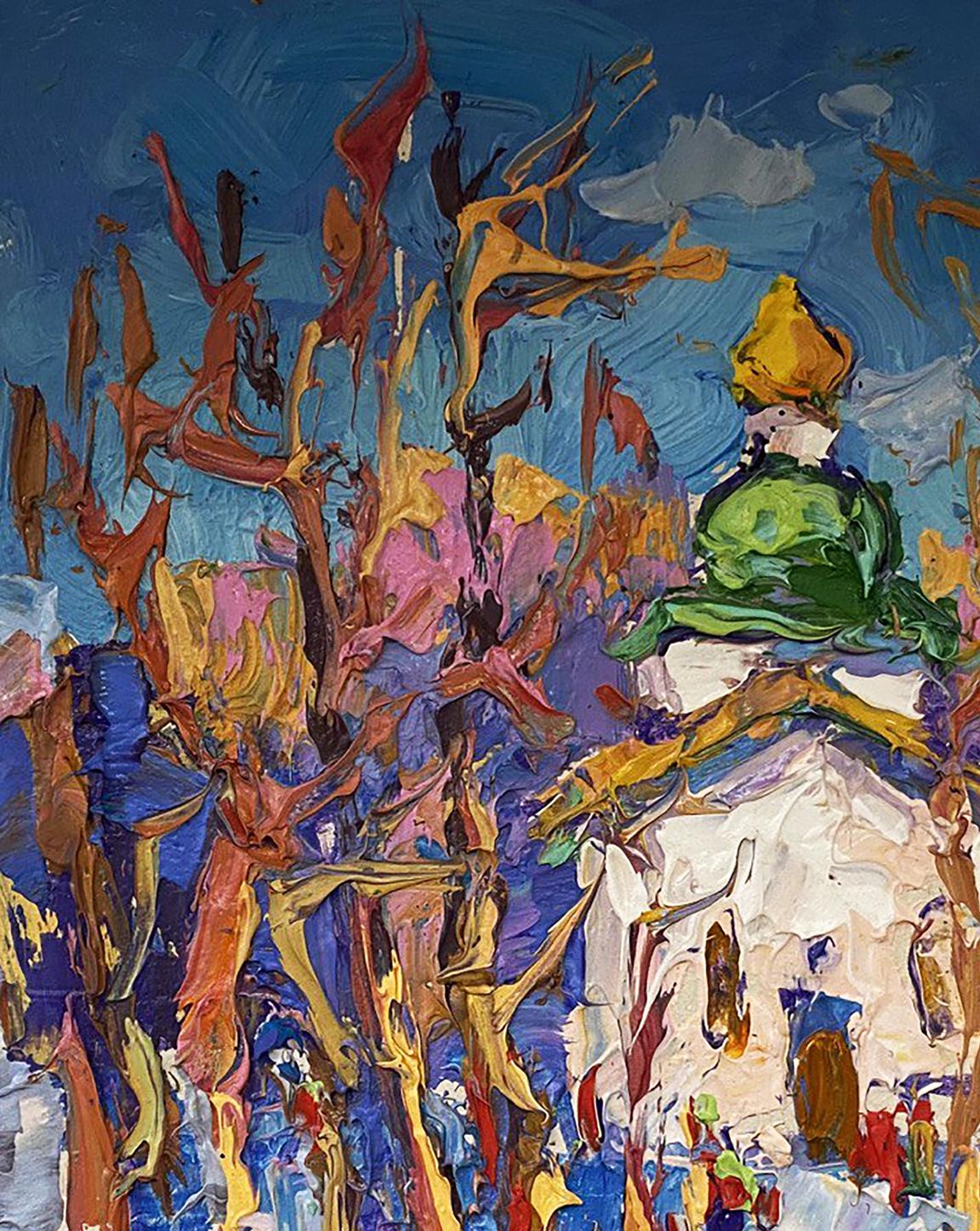The painting titled "March Snowy Days" captures the vibrant atmosphere of an early spring day, when winter's lingering snow blends with the colors of awakening nature. The scene depicts a small, picturesque chapel surrounded by bare trees and patches of snow, evoking a feeling of both renewal and tradition. The artist’s use of expressive brushstrokes and a bold color palette creates a lively, dynamic composition that conveys the transition from winter to spring. The foreground is a lively mix of white snow and patches of bright colors, representing early signs of spring breaking through the winter landscape. The snow is painted with thick, swirling strokes in shades of white, light blue, and lavender, giving it a soft and textured appearance. The scattered, colorful figures of people walking toward the chapel add a sense of life and community to the scene. The brushstrokes are bold and energetic, suggesting movement and the melting of snow as the season changes. The vibrant colors in the foreground hint at flowers and greenery beginning to emerge from beneath the snow, symbolizing new life and hope. At the center of the composition stands a quaint, white chapel with a green dome and a golden spire. The chapel’s architecture is simple yet elegant, and it serves as a focal point for the entire painting. The dome’s green color contrasts beautifully with the surrounding snow and trees, drawing the viewer’s eye to the heart of the scene. The chapel appears warm and inviting, standing out against the cooler tones of the snow and sky. Its white walls reflect the light, giving it a luminous quality that suggests the presence of warmth and spirituality amidst the cold. The background features a mix of bare trees painted in shades of orange, brown, and yellow, contrasting with the deep blue sky. The tree trunks and branches are painted with loose, flowing brushstrokes, creating a sense of movement and life. The colorful trees frame the chapel, adding depth and balance to the composition. The sky is a rich, vibrant blue with subtle hints of pink and purple, suggesting a clear, crisp day in early spring. The swirling brushstrokes in the sky add a dynamic, almost playful quality to the painting, reflecting the changing weather and the promise of warmer days ahead. "March Snowy Days" conveys a sense of renewal, hope, and the beauty of tradition. The painting captures the fleeting moment when winter begins to give way to spring, bringing with it a sense of optimism and change. The vibrant colors and dynamic brushstrokes create a joyful, uplifting atmosphere that invites the viewer to reflect on the cycles of nature and the passage of time. The artwork celebrates the resilience of both nature and community, reminding us of the quiet beauty found in everyday moments and the enduring presence of cultural and spiritual traditions. It evokes a feeling of peace and harmony, capturing the essence of a serene, snowy day in March, filled with the promise of spring.