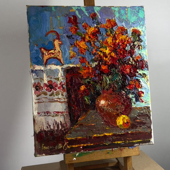 Embark on a visual journey with "Marigolds and goat" a captivating oil painting by the renowned Ivanyuk Oksana. This masterpiece is a celebration of color, texture, and life, portraying the enchanting beauty of marigold flowers with an exquisite touch.