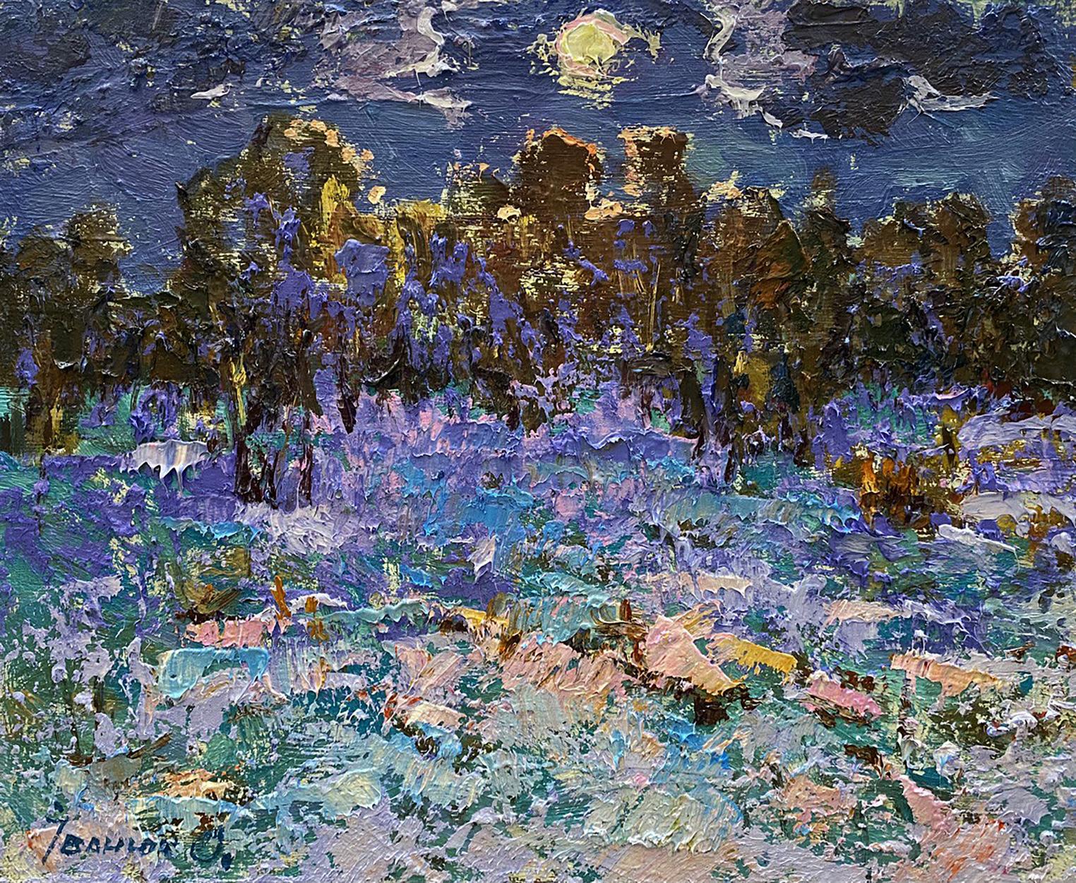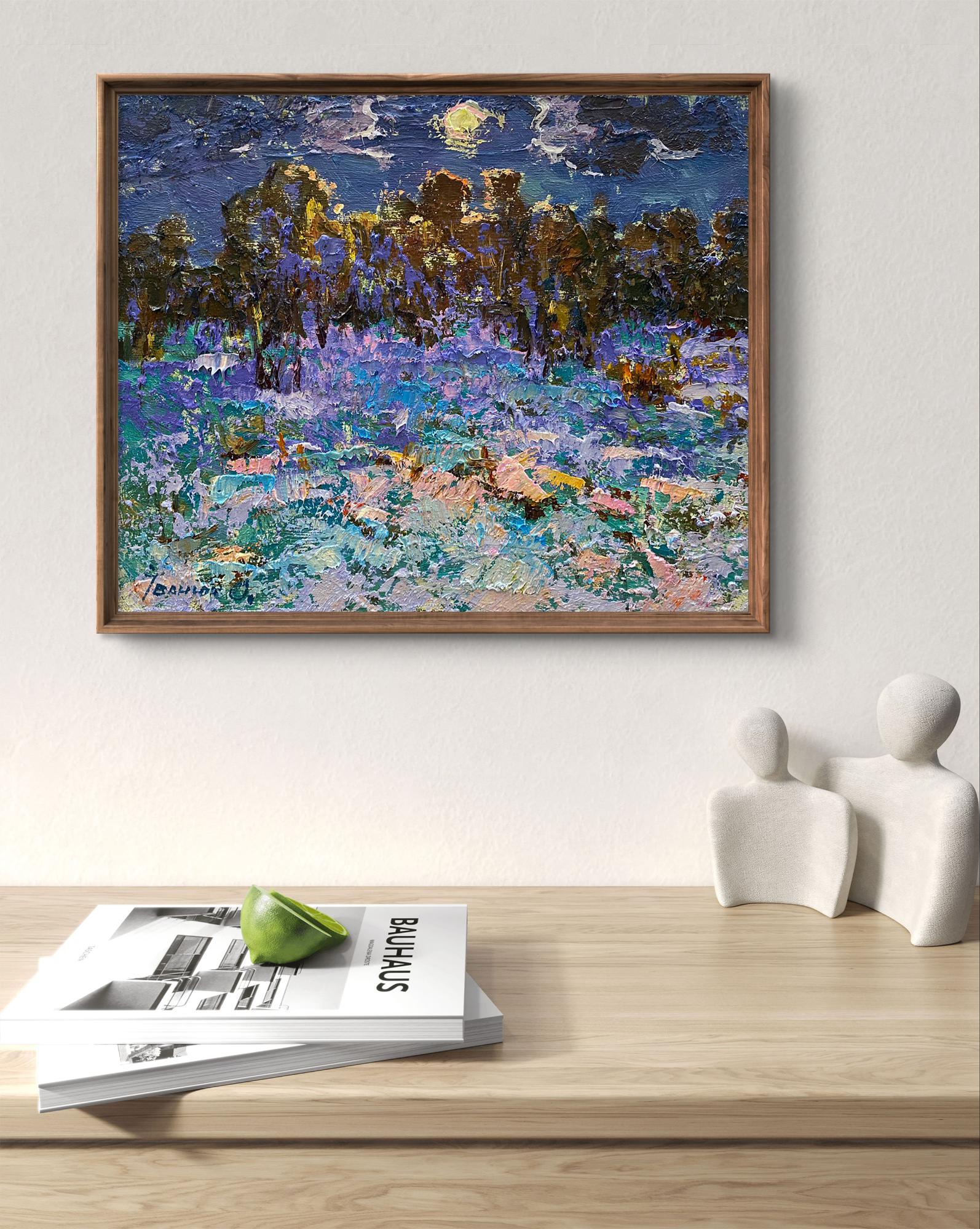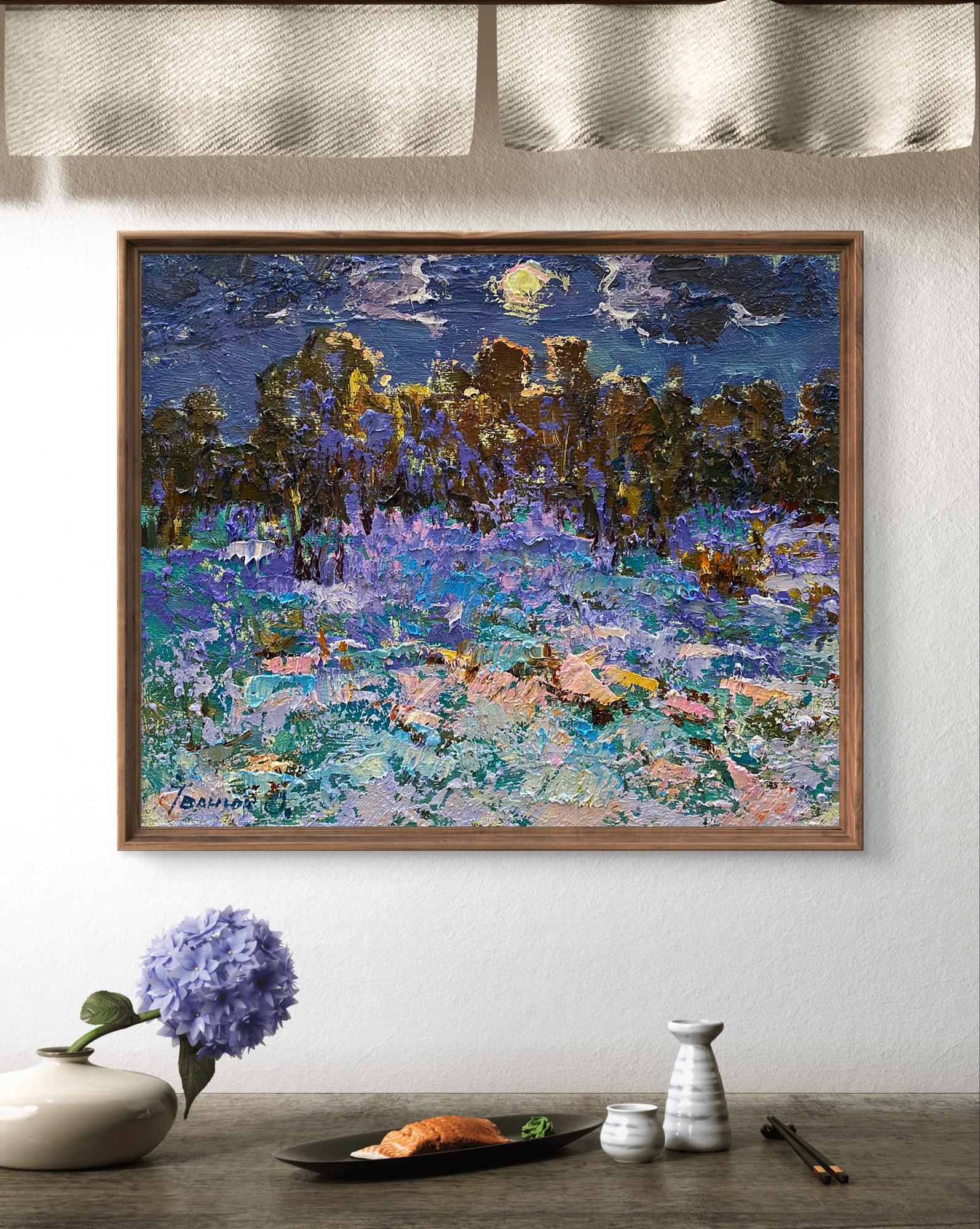 The painting "Moonlit Night" presents a mystical nighttime scene where the moonlight gently illuminates a peaceful landscape. The artist captures the magic of a moonlit night through a blend of soft, muted tones and bold, textured brushstrokes. The composition evokes a sense of calm and mystery, highlighting the interplay between light and shadow in nature. The sky occupies the upper portion of the painting, depicted in deep shades of blue, navy, and indigo. Clouds streak across the sky, painted with rough, textured strokes, partially obscuring the full moon that shines through. The moonlight casts a soft glow, creating a gentle, ethereal light that illuminates the trees and landscape below. In the background, a dense forest of tall trees stretches across the horizon. The trees are painted in dark, earthy tones of brown, green, and purple, with hints of golden light reflecting off their trunks and branches. The textured brushwork gives the trees a rough, organic feel, adding depth and mystery to the scene. The light appears to filter through the branches, creating a shimmering effect that enhances the magical atmosphere. The foreground is a moonlit field, painted with a vivid mix of blues, purples, and pinks, suggesting that the ground is covered in frost or snow. The artist uses impasto technique, applying thick layers of paint to create texture and dimension, making the field appear rough and uneven. The use of pastel tones such as lavender, turquoise, and soft pink adds a dreamlike quality to the landscape. Scattered throughout the field are bright patches of light and color, suggesting rocks, patches of grass, or flowers catching the moonlight. The delicate balance between cool and warm tones enhances the contrast between the cold night air and the warmth of the moon's glow. A solitary white figure, possibly a wolf or a deer, can be seen wandering through the landscape, adding a sense of life and movement to the otherwise still scene. The presence of this animal suggests a connection to nature and the untamed wilderness. The painting’s signature in blue is visible in the bottom left corner, subtly blending with the cool tones of the foreground. The painting "Moonlit Night" is a breathtaking depiction of a peaceful, moonlit landscape, blending impressionistic techniques with abstract textures. The artist’s use of color, light, and texture creates a magical and mysterious atmosphere, reminding viewers of the beauty of nature under the moon's soft light. The work evokes feelings of tranquility, mystery, and awe, inviting the viewer to immerse themselves in the quiet splendor of a moonlit night.