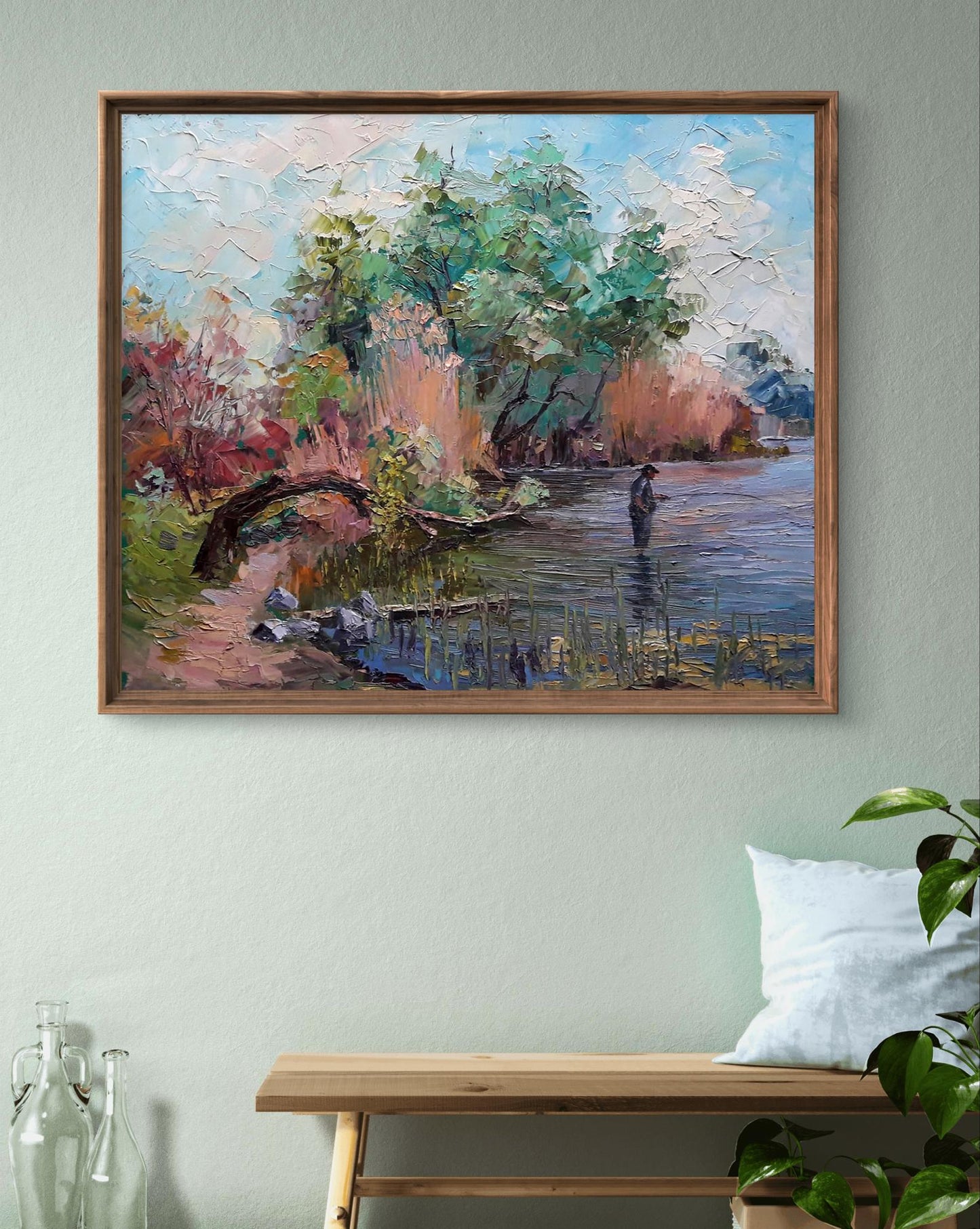 The painting "Morning Fishing" captures a serene and peaceful moment by the riverbank, where a lone fisherman stands immersed in the tranquil water. The scene is set in the early hours of the day, with soft light filtering through the lush greenery and reflecting gently on the water’s surface. The surrounding nature is depicted with vibrant yet harmonious hues, showcasing the awakening of the landscape under the soft morning light.The artist skillfully portrays the calmness of the river and the stillness of the air, which are only disturbed by the ripples created by the fisherman. The trees and bushes, painted with thick, textured brushstrokes, appear to sway gently in the breeze. The overhanging branch from a nearby tree arches gracefully over the water, creating a natural frame that draws the viewer's eye towards the fisherman. The reeds and grasses along the shore add depth to the composition, emphasizing the untouched beauty of nature.The fisherman, dressed in muted tones, stands as a quiet figure of patience and contemplation. His presence in the painting evokes a sense of solitude and mindfulness, highlighting the timeless tradition of fishing as both a practice and a form of meditation. The act of fishing here symbolizes a connection to nature, a return to simple pleasures, and a break from the noise and distractions of everyday life.Through "Morning Fishing," the artist aims to convey a message of peace, harmony, and the importance of finding moments of stillness in nature. The painting invites viewers to appreciate the quiet beauty of early mornings, where time seems to slow down, and the world feels more serene. It also celebrates the bond between humans and the natural world, encouraging viewers to seek solace and renewal in nature’s embrace.