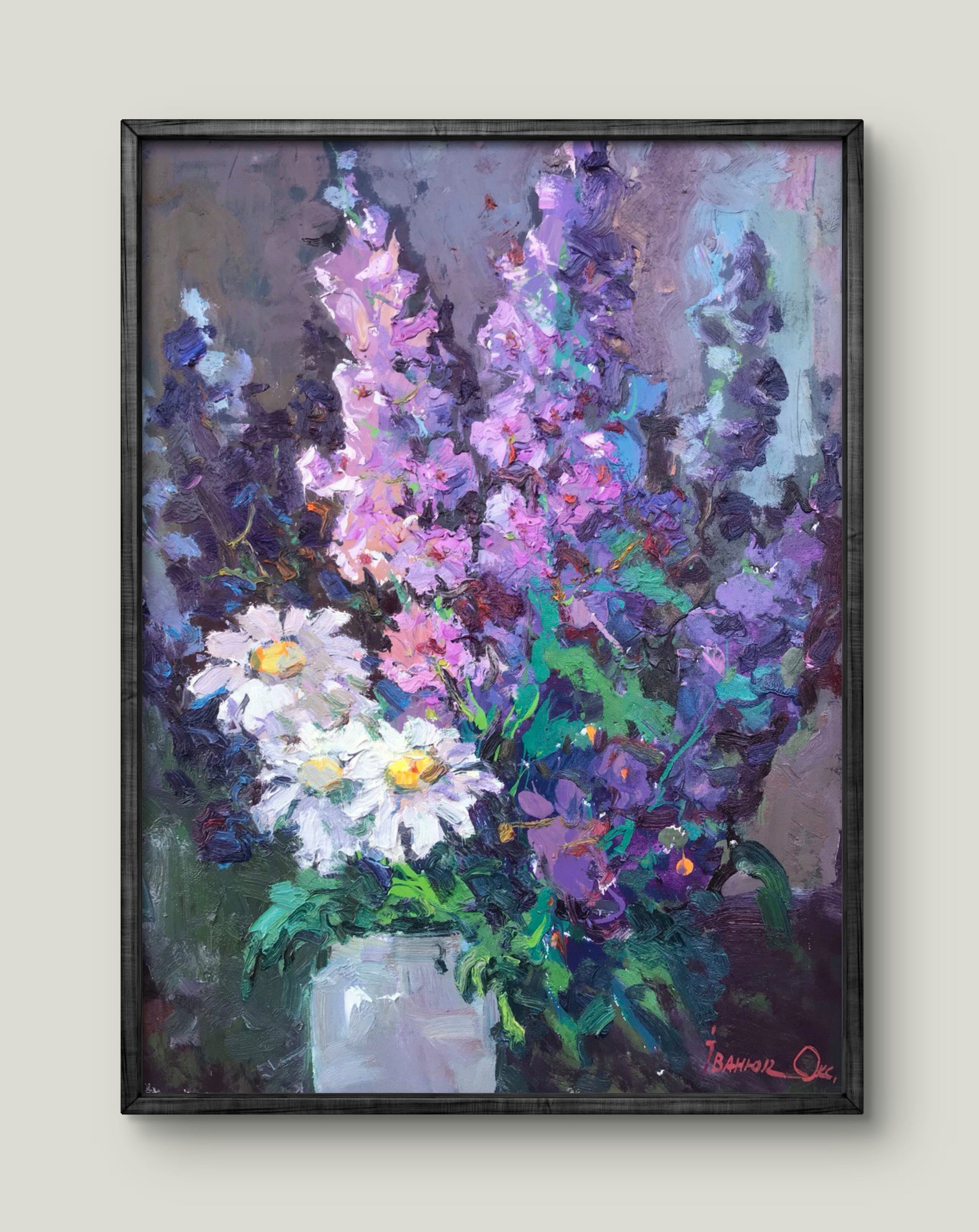 Step into the enchanting world of spring with "Morning Flowers," a radiant oil painting by the renowned artist Ivanyuk Oksana. This masterpiece beautifully captures the essence of a spring morning, presenting a large bouquet of lilac flowers that seem to whisper tales of freshness and new beginnings. The meticulously detailed white daisies add a touch of luminosity, creating a vivid contrast that enlivens the entire scene.