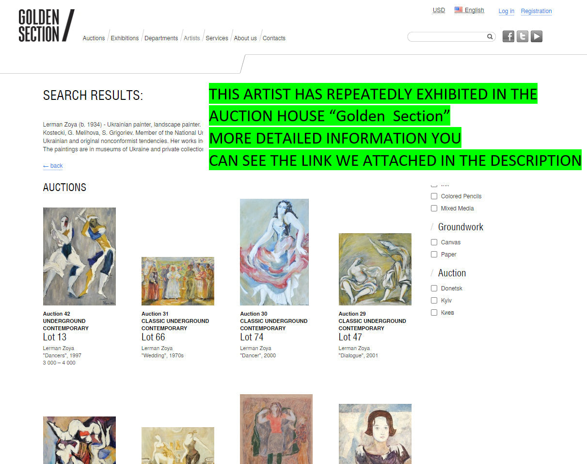 About the artists: Lerman Zoya (b. 1934) - Ukrainian painter, landscape painter. Born in Kyiv. She graduated from the Kyiv Institute of Art (1957) V. Kostecki, G. Melihova, S. Grigoriev. Member of the National Union Artists of Ukraine. One of the brightest representatives of Ukrainian and original nonconformist tendencies. Her works include a unique comparison of the ideology of "severe" and lyricism. The paintings are in museums of Ukraine and private collections around the world.