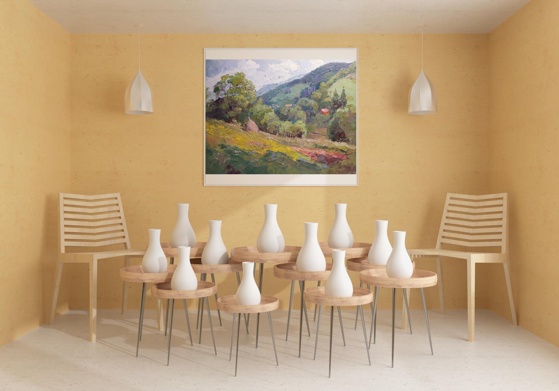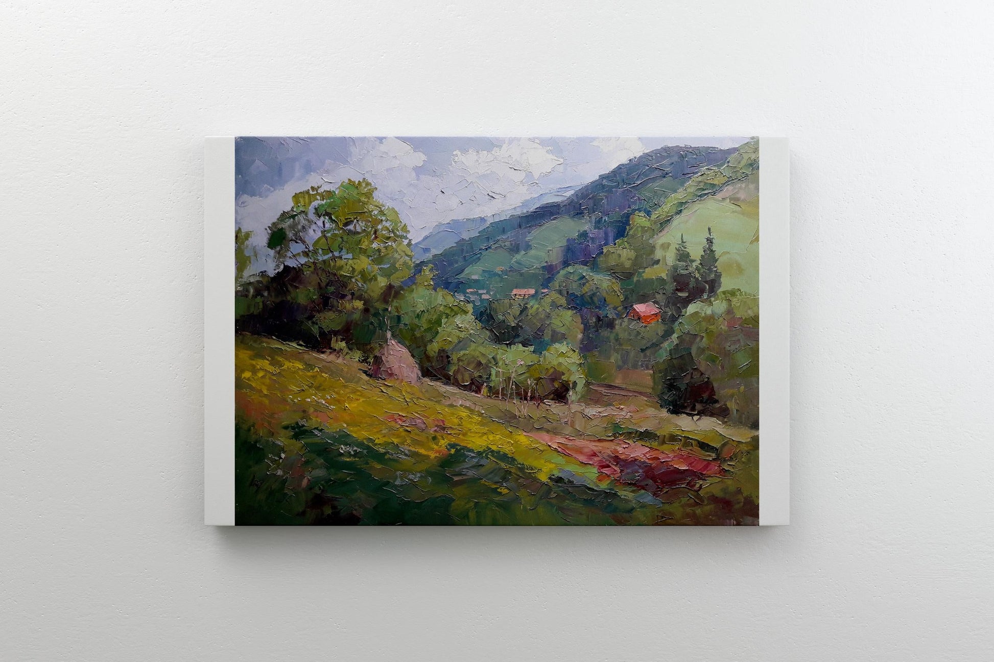 Looking at this oil painting, you can almost feel the cool mountain air and smell the pine trees. The artist has expertly captured the majesty of the mountains, from the snow-capped peaks to the deep valleys. The mountain meadow is a riot of color, with wildflowers blooming amidst the green grass. The forest is a dense tangle of trees, their leaves rustling in the wind. Every detail in this painting is carefully rendered, from the smallest flower to the tallest tree. It's easy to get lost in this painting, imagining yourself exploring the amazing landscapes depicted therein. hang it in your home, it will bring a touch of nature's beauty into your everyday life.