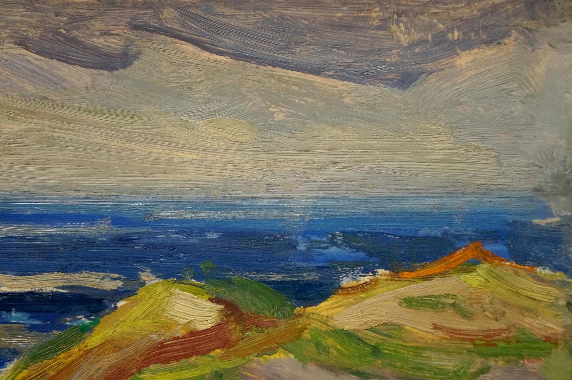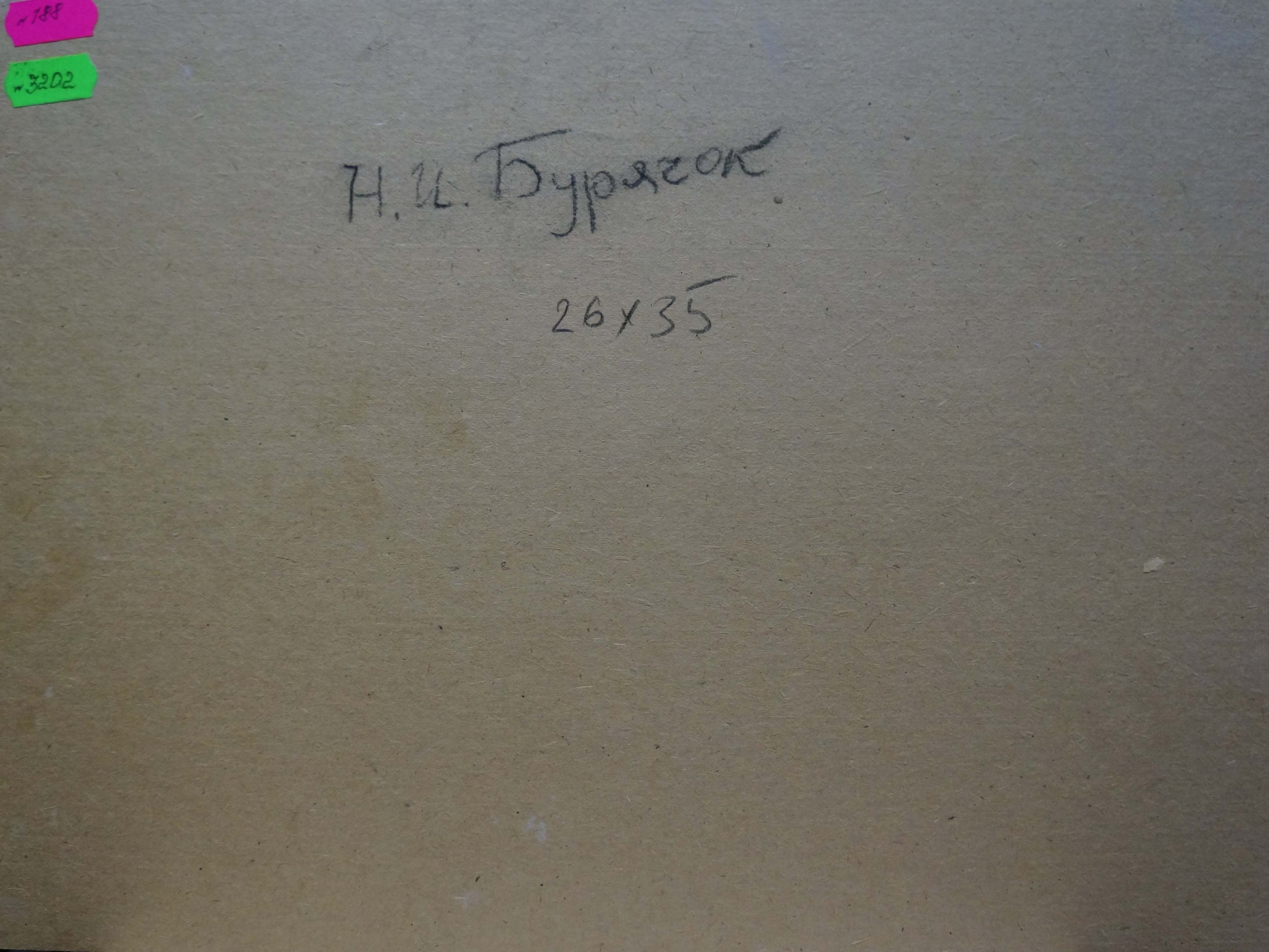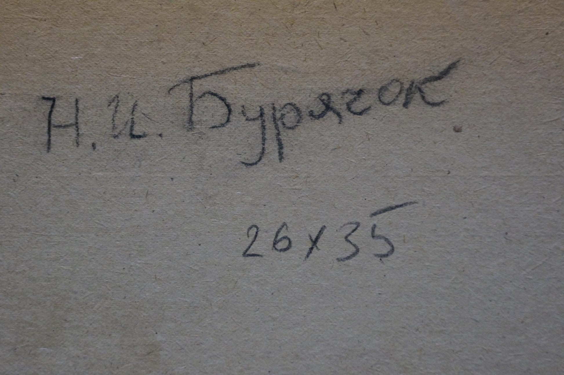 About the artist: Born on August 05 (18?), 1911, in Kiev. Son of I. Buryachka. Studied at the Kiev Art Institute (1940), at the Academy of Arts in Latvia (1945-50). Teachers in the specialty: L. Svemp and V. Skulme. Architect, painter, restorer, art critic. He used subjects of folk arts and crafts, expanding the boundaries of the genre, as well as landscape works, in which he synthesized the traditions of Russian painting. His work is characterized by laconicism. He worked as an artist in the House of Culture at the Bolshevik plant (1933-1935). As a decorator, he took part in the design of the performances of the Kiev Opera, the Kiev Theater of Musical Comedy and the Youth Theater. Major works - "Self-portrait", "Courtyard of St. Sophia of Kiev" (1957), "Summer", "View of the Hem" (1958), "Dahlias" (1959), "Sea Waves" (1960), "Flowers on the Window", “House in Sednev” (1962), “Winter Landscape in the Crimea” (1963). Participated in the painting of ceiling lamps in the Palace of Culture of the Koksokhimsky Combine in the city of Horlivka, Donetsk region (1951), in the development of the project of the Triumphal Arch of the reunification of Russia and Ukraine in Kiev, completed a panel (sketch and its embodiment) in the House of Culture in Novaya Kakhovka, Kherson region (1956) ... Participated in the restoration of frescoes in St. Sophia Cathedral and the restoration of the Bakhchisarai Palace in the Crimea (1957-1963). He created a number of mosaic panels in various cities of Ukraine: school number 22 in the city of Kremenchug, Poltava region (1965); front wall of the restaurant of the airport "Zhulyany" in Kiev (1970). Lived and worked in Kiev, died on January 13, 1977.