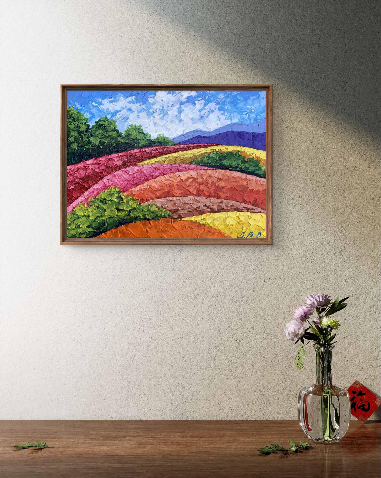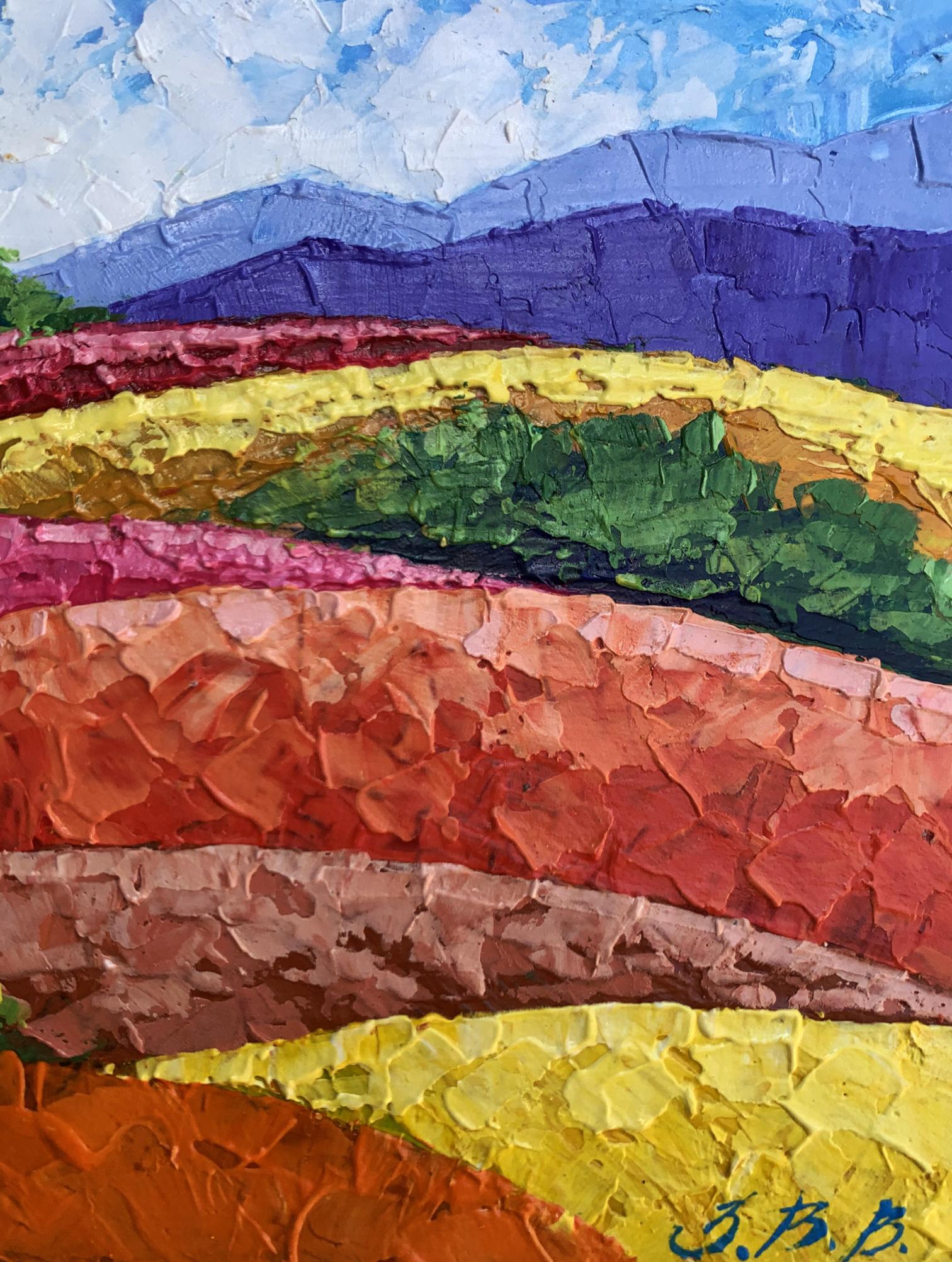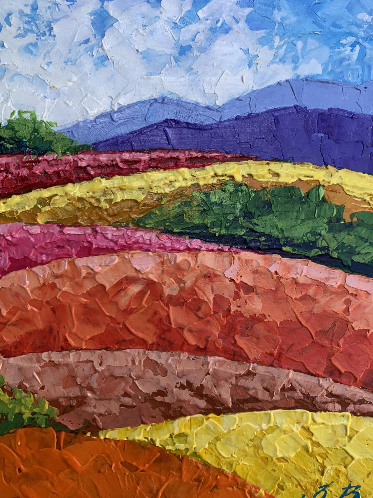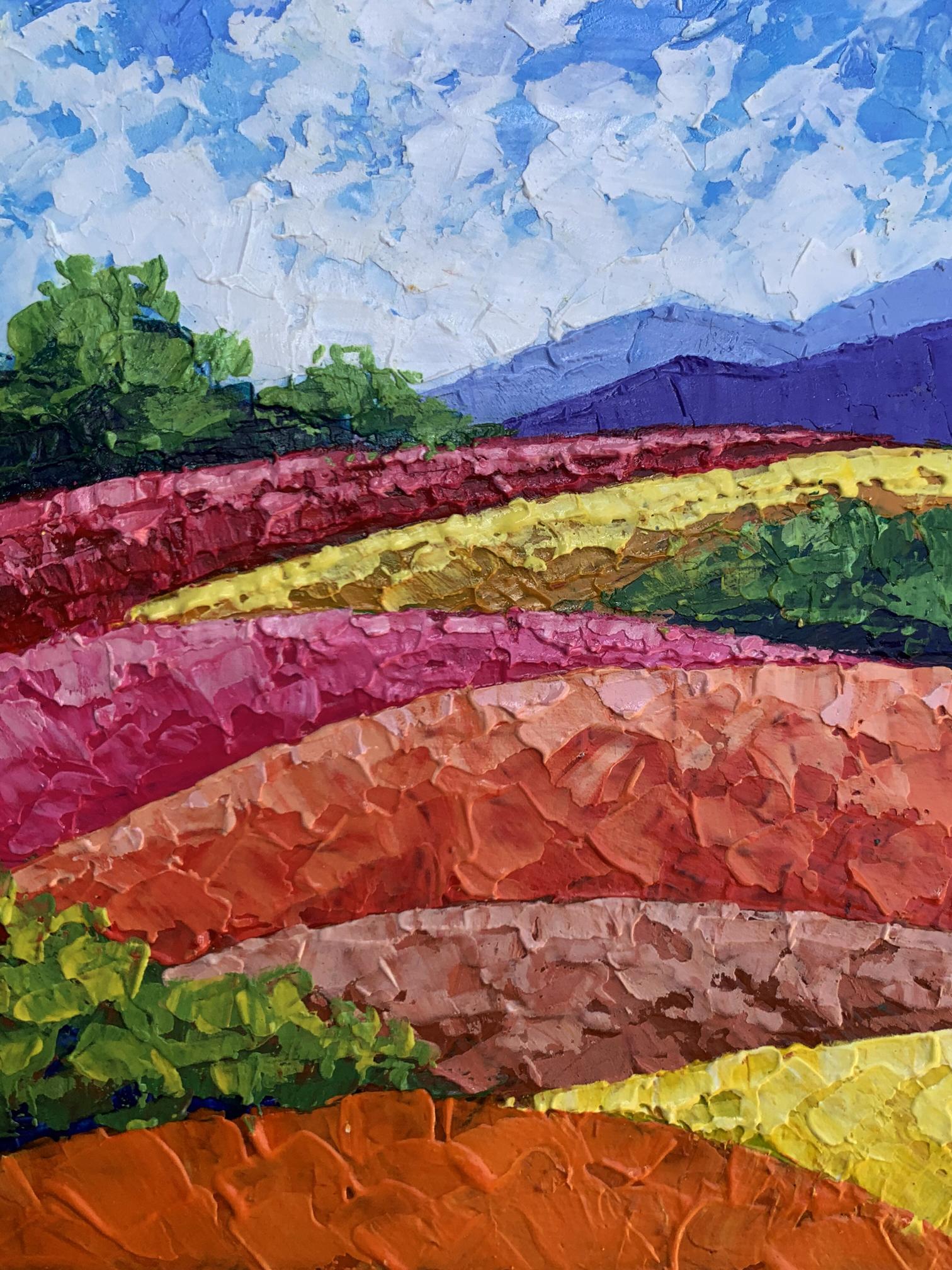"Mountains and Plains" is a vibrant oil painting that captures the beauty of a colorful landscape, showcasing the harmonious coexistence of nature's diverse elements. The artwork beautifully blends vivid colors and textured brushstrokes to create a dynamic and captivating scene. The painting employs a bright and lively color palette to bring the landscape to life. The sky is painted in a clear blue with soft, wispy clouds, creating a serene and uplifting atmosphere. The artist uses smooth, blended brushstrokes to depict the sky, giving it a sense of depth and tranquility. The mountains in the background are rendered in cool purples and blues, providing a striking contrast to the warm colors of the foreground. The use of layered brushstrokes adds texture and dimension to the mountains, making them appear majestic and distant. The plains are a mosaic of vibrant colors, including rich greens, bright yellows, and warm oranges and reds. The artist employs bold, impasto brushstrokes to create a sense of movement and texture, giving the plains a dynamic and lively appearance. The composition of "Mountains and Plains" is thoughtfully designed to guide the viewer's eye across the landscape. The painting is divided into horizontal layers, each representing different elements of the landscape. This creates a sense of depth and perspective, drawing the viewer's eye from the foreground to the background. The gradual transition of colors from warm to cool creates a harmonious balance and enhances the visual appeal of the painting. The artist skillfully uses color gradation to lead the viewer's eye through the scene. The use of textured brushstrokes adds depth and dimension to the painting, making the landscape feel more tangible and real. The varied textures create a rich visual experience, inviting the viewer to explore every detail. The plains, with their vibrant colors and dynamic brushstrokes, are the highlight of the painting. The artist captures the beauty and diversity of the natural landscape, celebrating the richness of the earth. The distant mountains provide a sense of scale and grandeur, enhancing the overall composition. The cool colors of the mountains create a striking contrast to the warm colors of the plains, adding depth and balance to the scene. The clear, blue sky with soft clouds adds a sense of peace and tranquility to the painting. The sky serves as a backdrop, unifying the different elements of the landscape and creating a cohesive scene. The mood of "Mountains and Plains" is one of joy and celebration. The vibrant colors and dynamic brushstrokes evoke a sense of energy and vitality, while the serene sky and majestic mountains add a touch of tranquility and harmony. The painting invites viewers to appreciate the beauty of nature and the richness of the landscape. "Mountains and Plains" can be interpreted as a tribute to the beauty and diversity of the natural world. The artist's use of color and texture captures the essence of the landscape, celebrating the vibrant and dynamic nature of the earth. The painting encourages viewers to pause and appreciate the stunning beauty of the natural environment, reminding them of the wonders that surround them. Overall, "Mountains and Plains" is a captivating representation of a colorful landscape. The artist's masterful use of color and texture creates a vivid and immersive scene that captures the viewer's imagination and evokes a sense of wonder and appreciation for the beauty of the natural world.