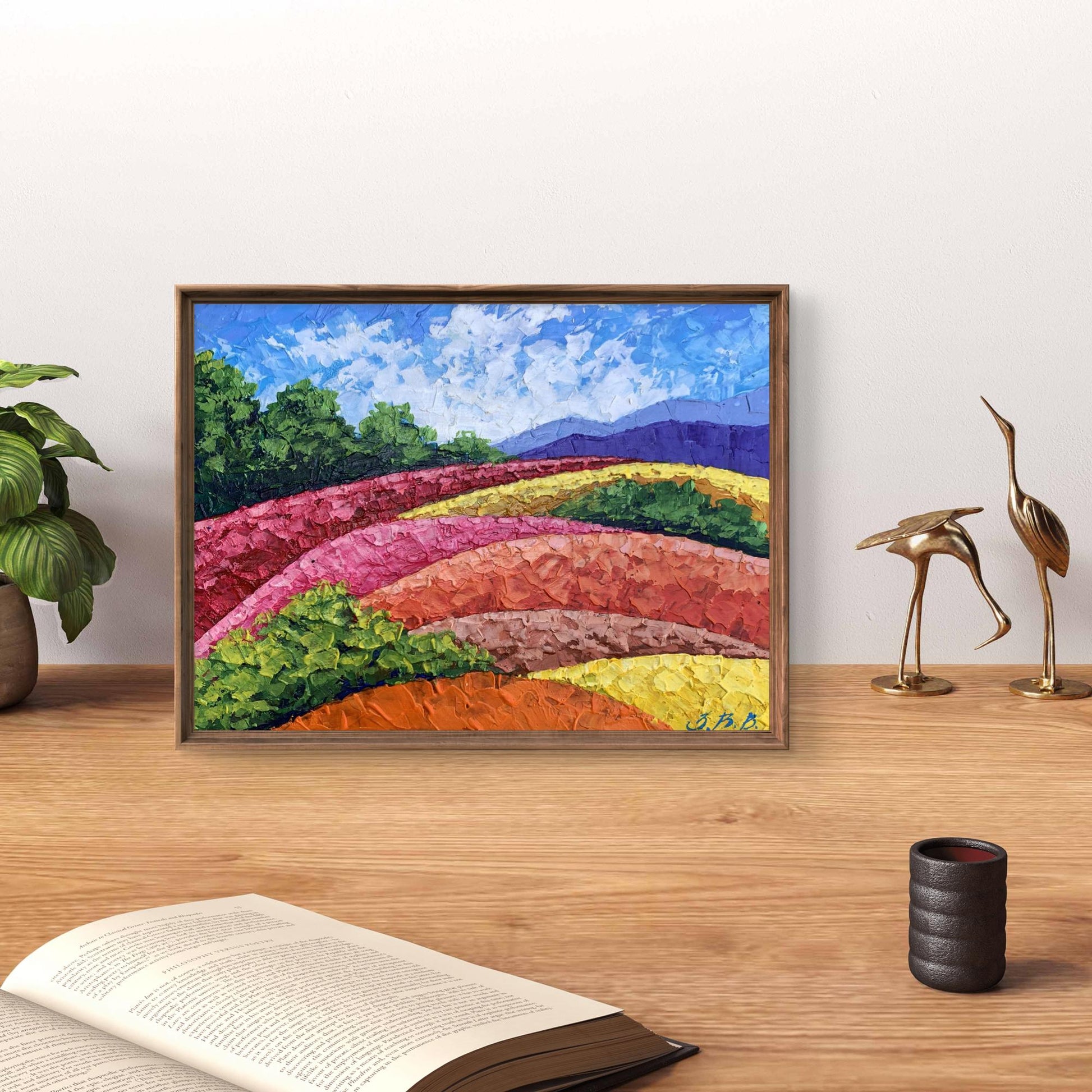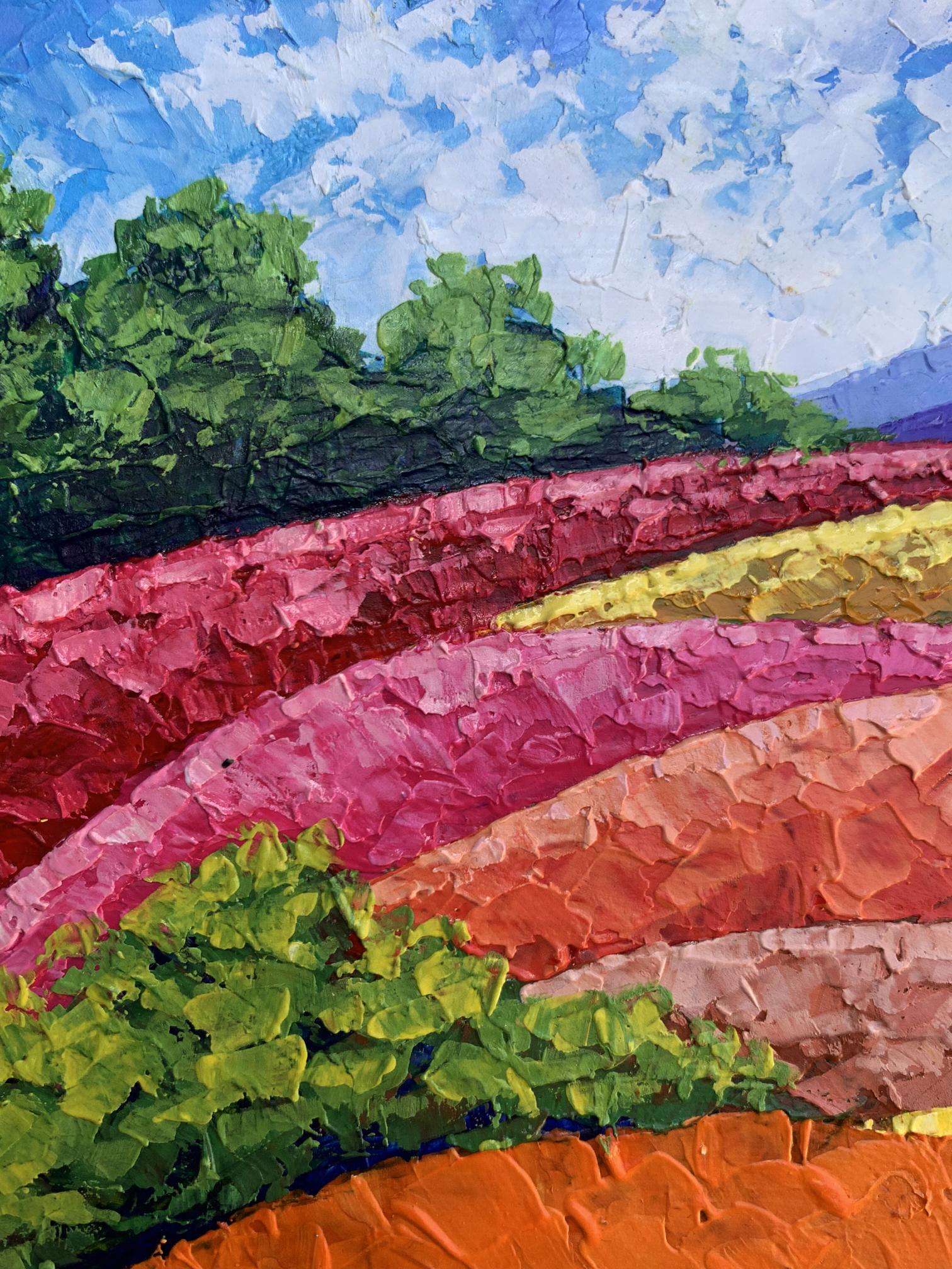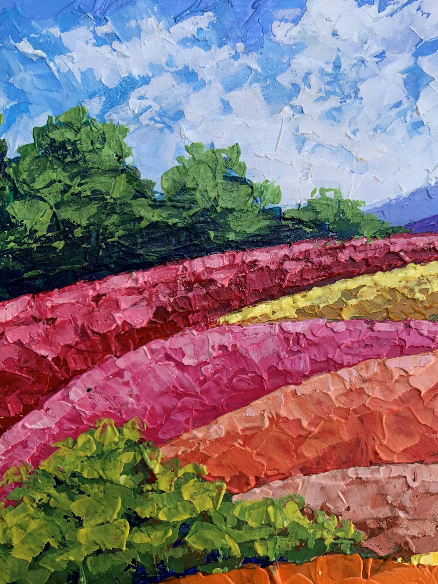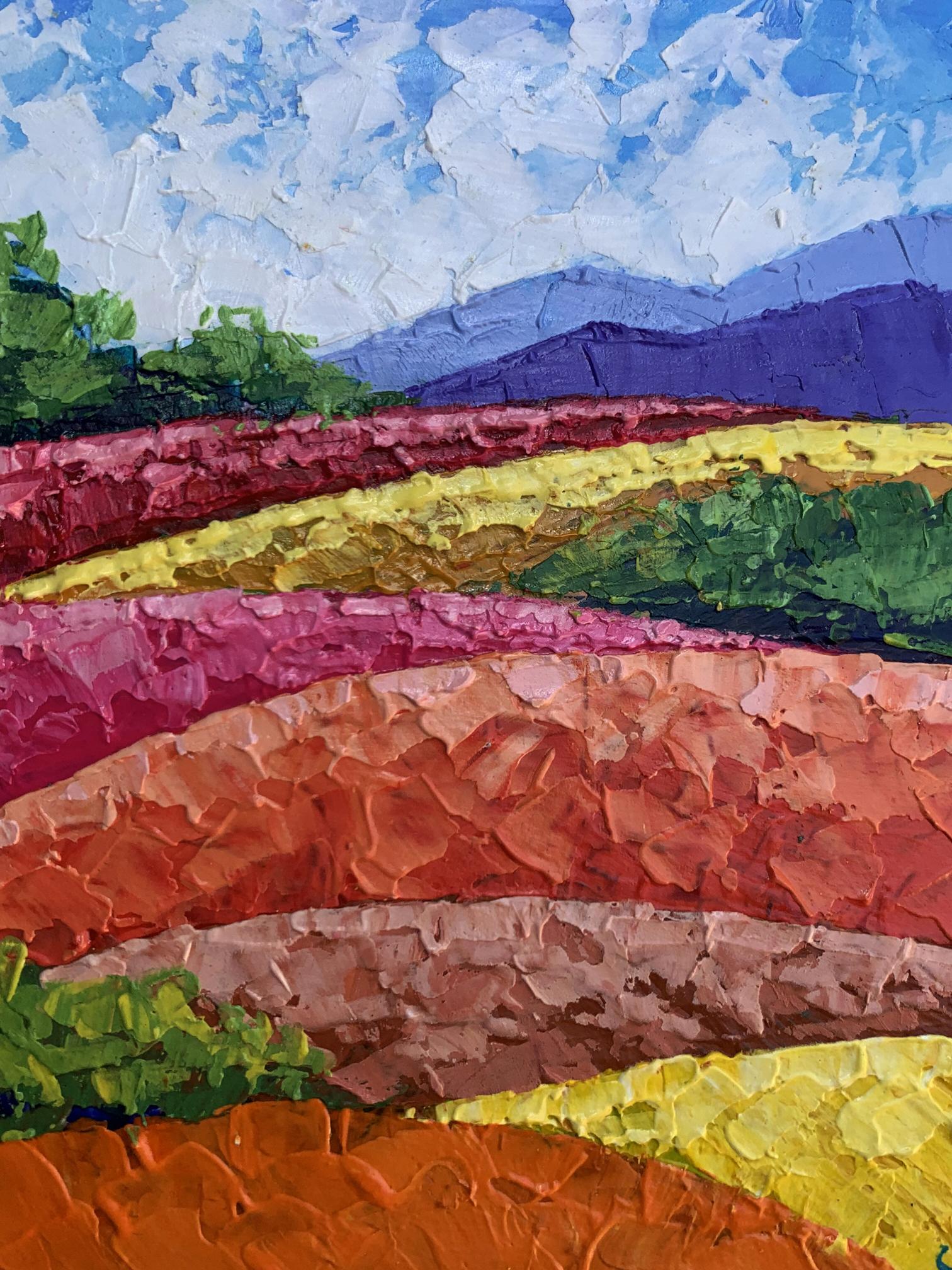 "Mountains and Plains" is a vibrant oil painting that captures the beauty of a colorful landscape, showcasing the harmonious coexistence of nature's diverse elements. The artwork beautifully blends vivid colors and textured brushstrokes to create a dynamic and captivating scene. The painting employs a bright and lively color palette to bring the landscape to life. The sky is painted in a clear blue with soft, wispy clouds, creating a serene and uplifting atmosphere. The artist uses smooth, blended brushstrokes to depict the sky, giving it a sense of depth and tranquility. The mountains in the background are rendered in cool purples and blues, providing a striking contrast to the warm colors of the foreground. The use of layered brushstrokes adds texture and dimension to the mountains, making them appear majestic and distant. The plains are a mosaic of vibrant colors, including rich greens, bright yellows, and warm oranges and reds. The artist employs bold, impasto brushstrokes to create a sense of movement and texture, giving the plains a dynamic and lively appearance. The composition of "Mountains and Plains" is thoughtfully designed to guide the viewer's eye across the landscape. The painting is divided into horizontal layers, each representing different elements of the landscape. This creates a sense of depth and perspective, drawing the viewer's eye from the foreground to the background. The gradual transition of colors from warm to cool creates a harmonious balance and enhances the visual appeal of the painting. The artist skillfully uses color gradation to lead the viewer's eye through the scene. The use of textured brushstrokes adds depth and dimension to the painting, making the landscape feel more tangible and real. The varied textures create a rich visual experience, inviting the viewer to explore every detail. The plains, with their vibrant colors and dynamic brushstrokes, are the highlight of the painting. The artist captures the beauty and diversity of the natural landscape, celebrating the richness of the earth. The distant mountains provide a sense of scale and grandeur, enhancing the overall composition. The cool colors of the mountains create a striking contrast to the warm colors of the plains, adding depth and balance to the scene. The clear, blue sky with soft clouds adds a sense of peace and tranquility to the painting. The sky serves as a backdrop, unifying the different elements of the landscape and creating a cohesive scene. The mood of "Mountains and Plains" is one of joy and celebration. The vibrant colors and dynamic brushstrokes evoke a sense of energy and vitality, while the serene sky and majestic mountains add a touch of tranquility and harmony. The painting invites viewers to appreciate the beauty of nature and the richness of the landscape. "Mountains and Plains" can be interpreted as a tribute to the beauty and diversity of the natural world. The artist's use of color and texture captures the essence of the landscape, celebrating the vibrant and dynamic nature of the earth. The painting encourages viewers to pause and appreciate the stunning beauty of the natural environment, reminding them of the wonders that surround them. Overall, "Mountains and Plains" is a captivating representation of a colorful landscape. The artist's masterful use of color and texture creates a vivid and immersive scene that captures the viewer's imagination and evokes a sense of wonder and appreciation for the beauty of the natural world.