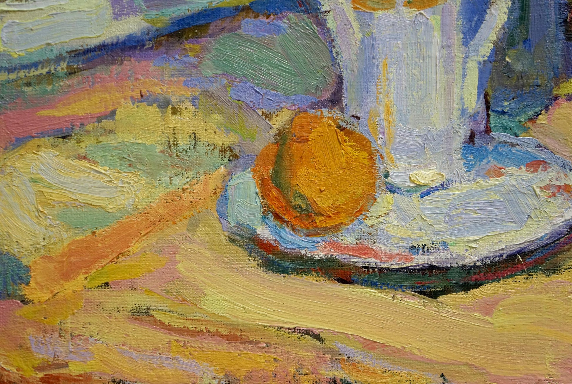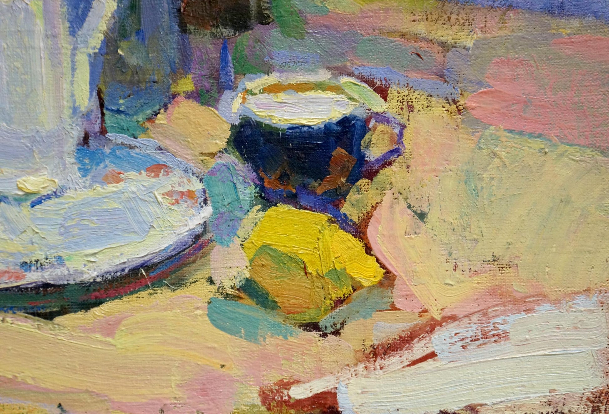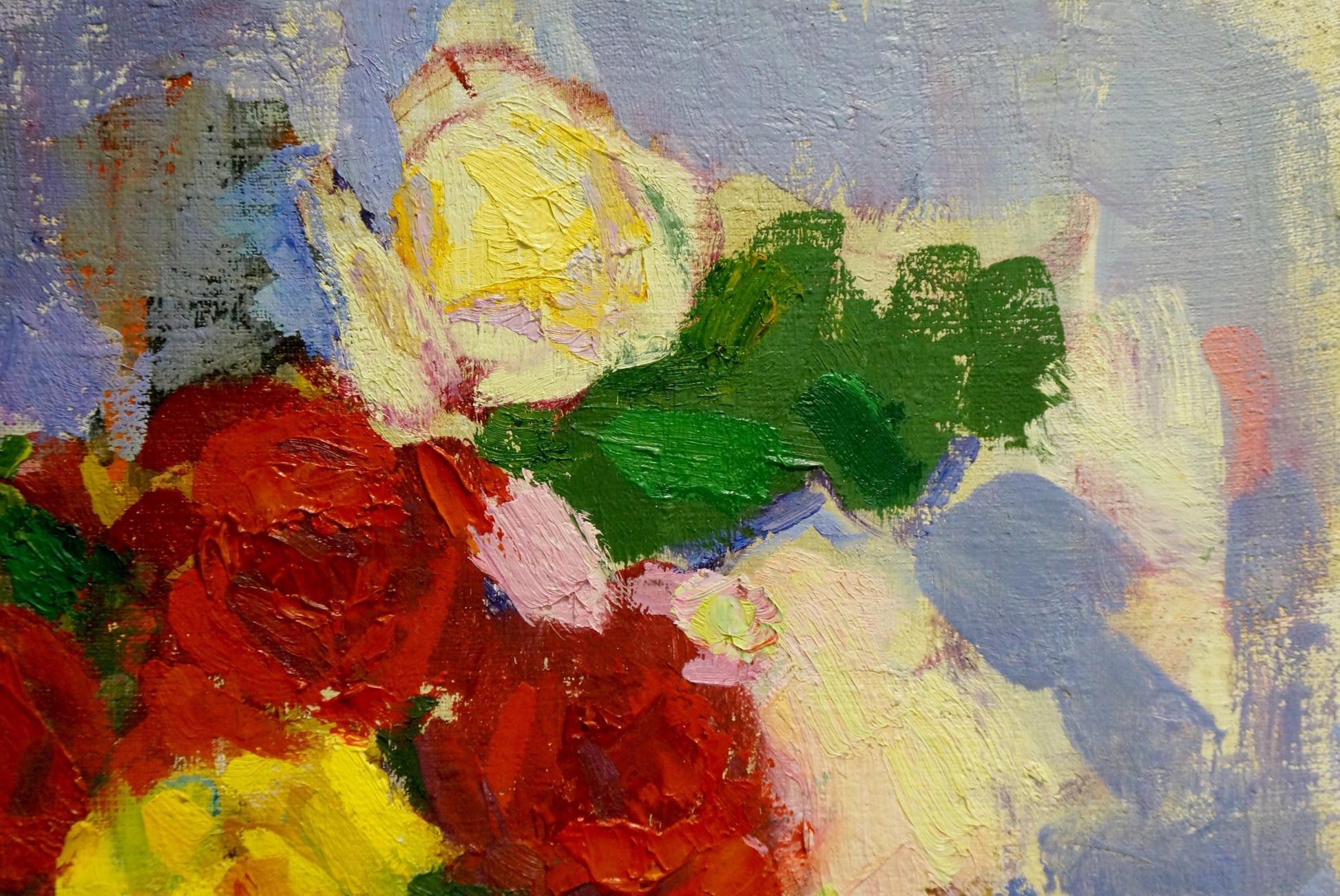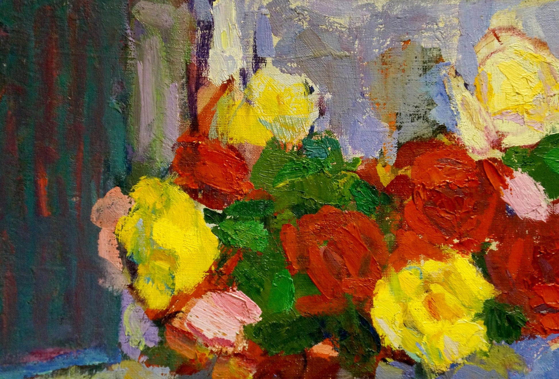 Oil painting Multicolored roses and lemon tea Leonid Zaborovsky