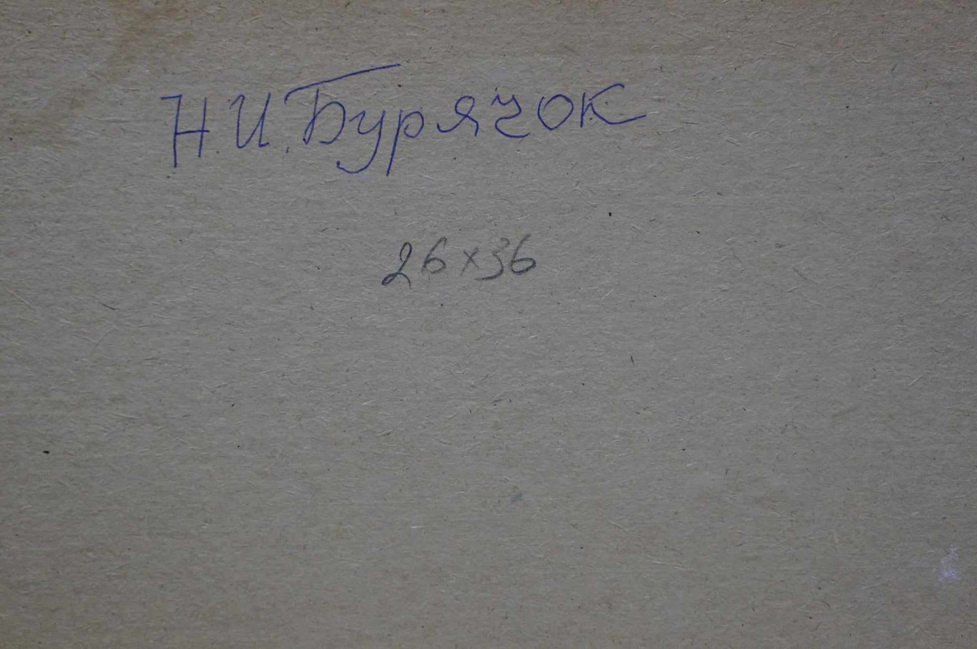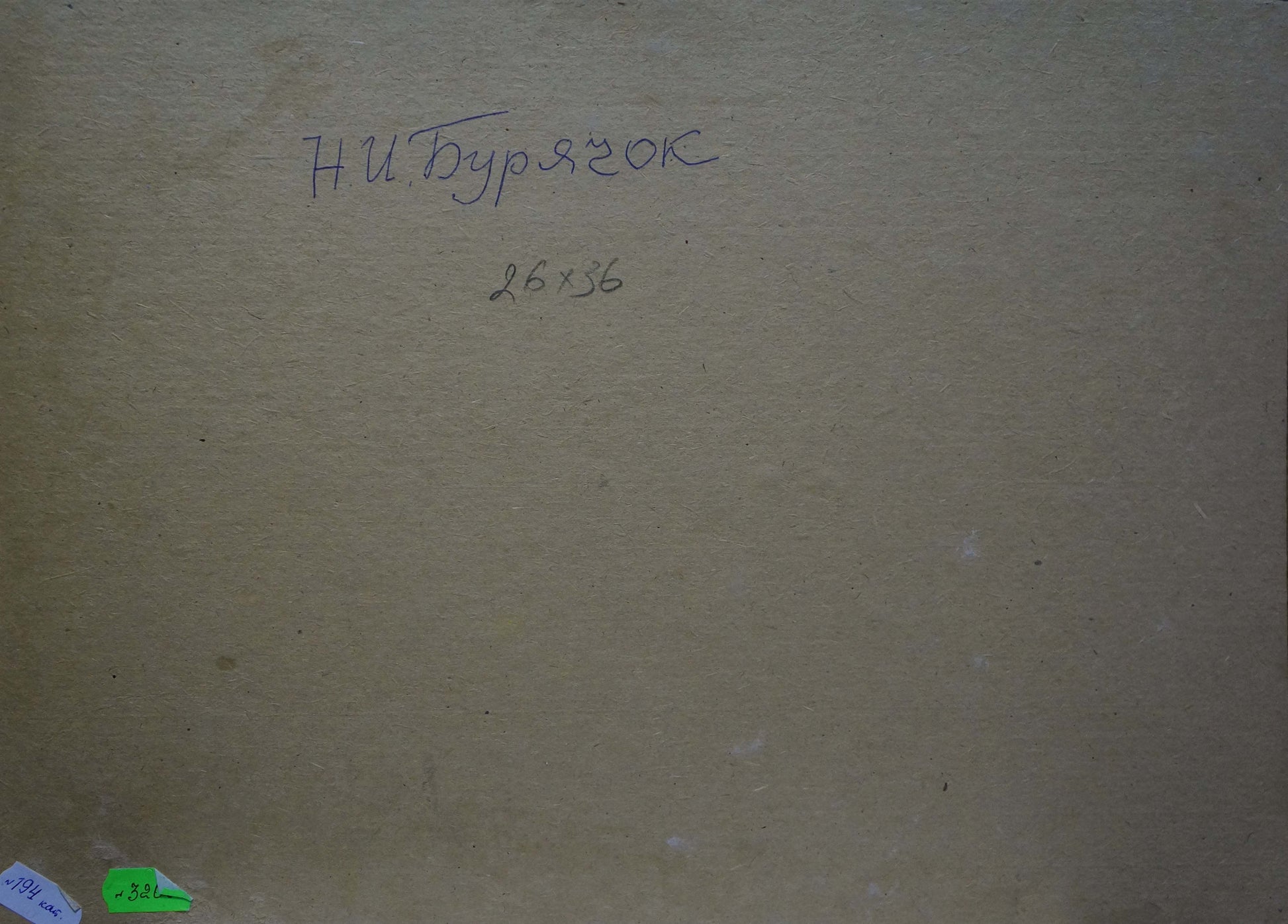 About the artist: Born on August 05 (18?), 1911, in Kiev. Son of I. Buryachka. Studied at the Kiev Art Institute (1940), at the Academy of Arts in Latvia (1945-50). Teachers in the specialty: L. Svemp and V. Skulme. Architect, painter, restorer, art critic. He used subjects of folk arts and crafts, expanding the boundaries of the genre, as well as landscape works, in which he synthesized the traditions of Russian painting. His work is characterized by laconicism. He worked as an artist in the House of Culture at the Bolshevik plant (1933-1935). As a decorator, he took part in the design of the performances of the Kiev Opera, the Kiev Theater of Musical Comedy and the Youth Theater. Major works - "Self-portrait", "Courtyard of St. Sophia of Kiev" (1957), "Summer", "View of the Hem" (1958), "Dahlias" (1959), "Sea Waves" (1960), "Flowers on the Window", “House in Sednev” (1962), “Winter Landscape in the Crimea” (1963). Participated in the painting of ceiling lamps in the Palace of Culture of the Koksokhimsky Combine in the city of Horlivka, Donetsk region (1951), in the development of the project of the Triumphal Arch of the reunification of Russia and Ukraine in Kiev, completed a panel (sketch and its embodiment) in the House of Culture in Novaya Kakhovka, Kherson region (1956) ... Participated in the restoration of frescoes in St. Sophia Cathedral and the restoration of the Bakhchisarai Palace in the Crimea (1957-1963). He created a number of mosaic panels in various cities of Ukraine: school number 22 in the city of Kremenchug, Poltava region (1965); front wall of the restaurant of the airport "Zhulyany" in Kiev (1970). Lived and worked in Kiev, died on January 13, 1977.