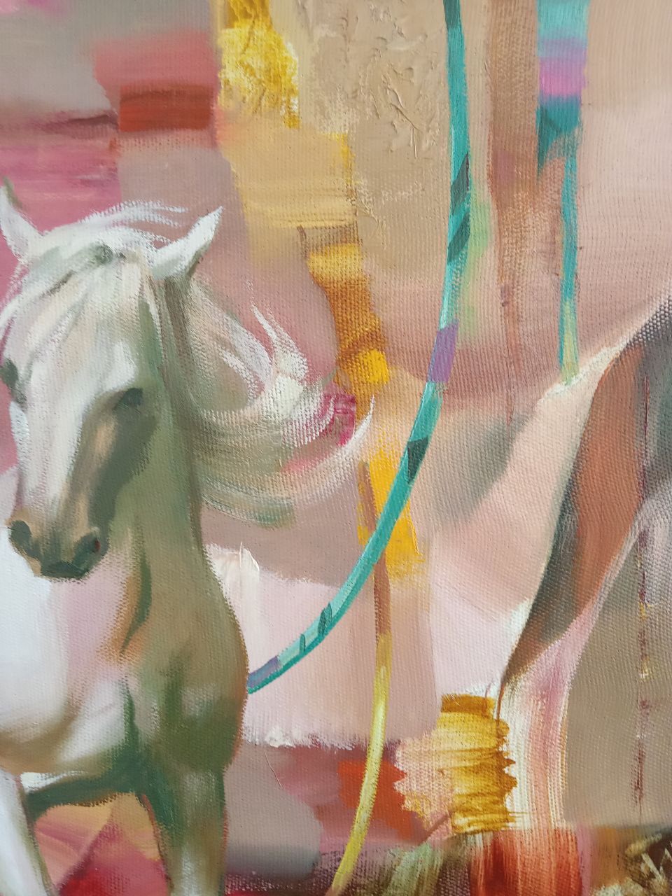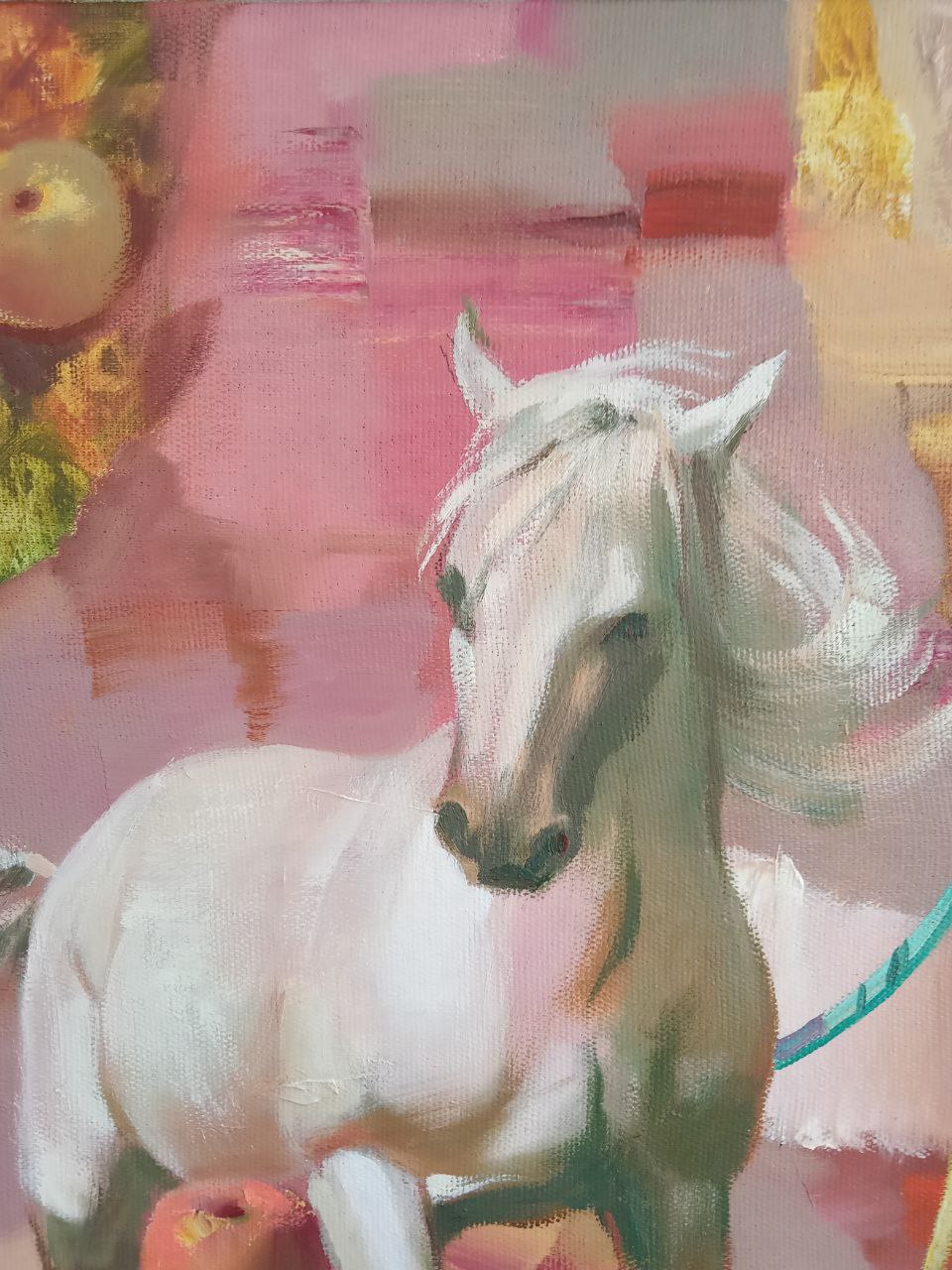 Start your day off right with a little bit of magic! This stunning oil painting, "New Day" features a beautiful white horse amidst a field of flowers and fruit. The colors are bright and cheerful, sure to give you a boost of positive energy. The abstract background adds an element of mystery and intrigue. Whether you hang it in your bedroom, living room, or office, this painting is sure to add a touch of class and beauty.