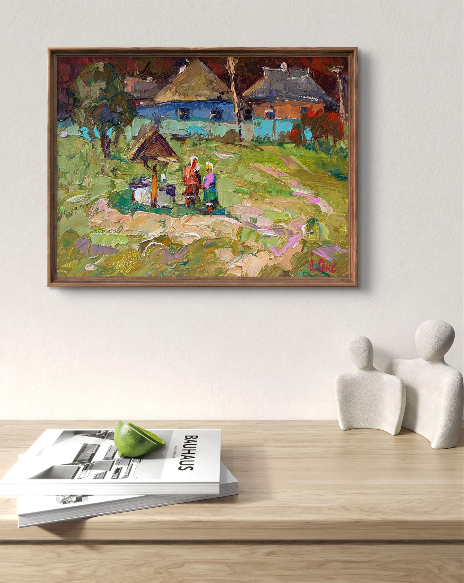 The painting titled "News Between People" captures a lively rural scene, depicting a casual social interaction between villagers gathered near a well. The artist beautifully portrays the spirit of community life, where exchanging news and stories is a natural part of daily routines. The composition, with its vibrant colors and dynamic brushstrokes, brings the simple joys of rural life to the forefront, emphasizing human connection and the timeless tradition of storytelling. The foreground features a small well with a wooden roof, a central element of the scene. The well is painted in earthy tones of brown and beige, with thick, expressive brushstrokes adding texture and depth. The roof structure shows signs of wear, suggesting it is a well-used and familiar gathering spot for the villagers. Next to the well, two women are depicted in conversation. One woman is dressed in a red-orange shawl, while the other wears a bright blue and green outfit with a yellow headscarf, adding vibrant splashes of color to the scene. The women are engaged in a lively discussion, their postures suggesting familiarity and ease. Their interaction evokes a sense of warmth, community, and the shared experiences of rural life. The middle ground is dominated by grassy fields and paths leading to the houses in the background. The grass is painted in various shades of green, with hints of pink and yellow, giving the landscape a lush and fertile appearance. The winding paths, painted in soft pastel tones, guide the viewer’s eye toward the village houses, creating a sense of depth and movement in the painting. Scattered across the field are small patches of wildflowers and vegetation, painted with quick, textured brushstrokes that add vibrancy and richness to the landscape. In the background, traditional village houses with thatched roofs are nestled among trees and foliage. The houses are painted in shades of blue, grey, and brown, with hints of orange and red, adding contrast to the green landscape. The variety of colors in the houses suggests a lively, diverse village community. Tall trees with dark green and brown foliage frame the houses, adding structure and balance to the composition. The trees are painted with loose, expressive brushstrokes, giving them a natural, organic feel. Above the village, the sky is painted in soft pastel tones of lavender, grey, and light pink, suggesting a calm, overcast day or the early morning light. The subtle sky tones create a serene, peaceful atmosphere that complements the lively interaction in the foreground. "News Between People" evokes a sense of community, warmth, and tradition. The painting captures a moment of human connection, emphasizing the importance of social interaction in rural life. The scene reminds the viewer of the timeless ritual of gathering to exchange news, share stories, and strengthen bonds within a community.