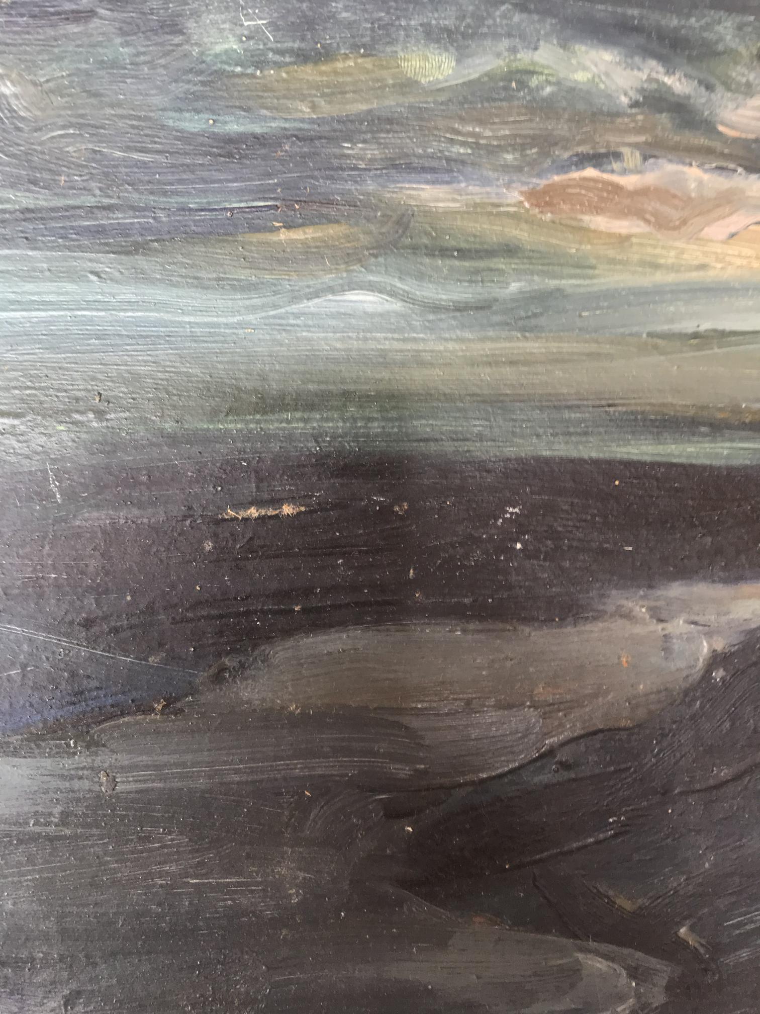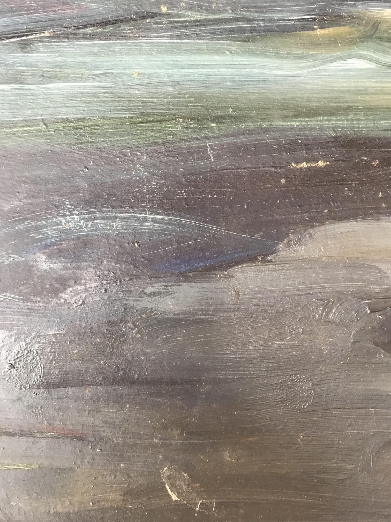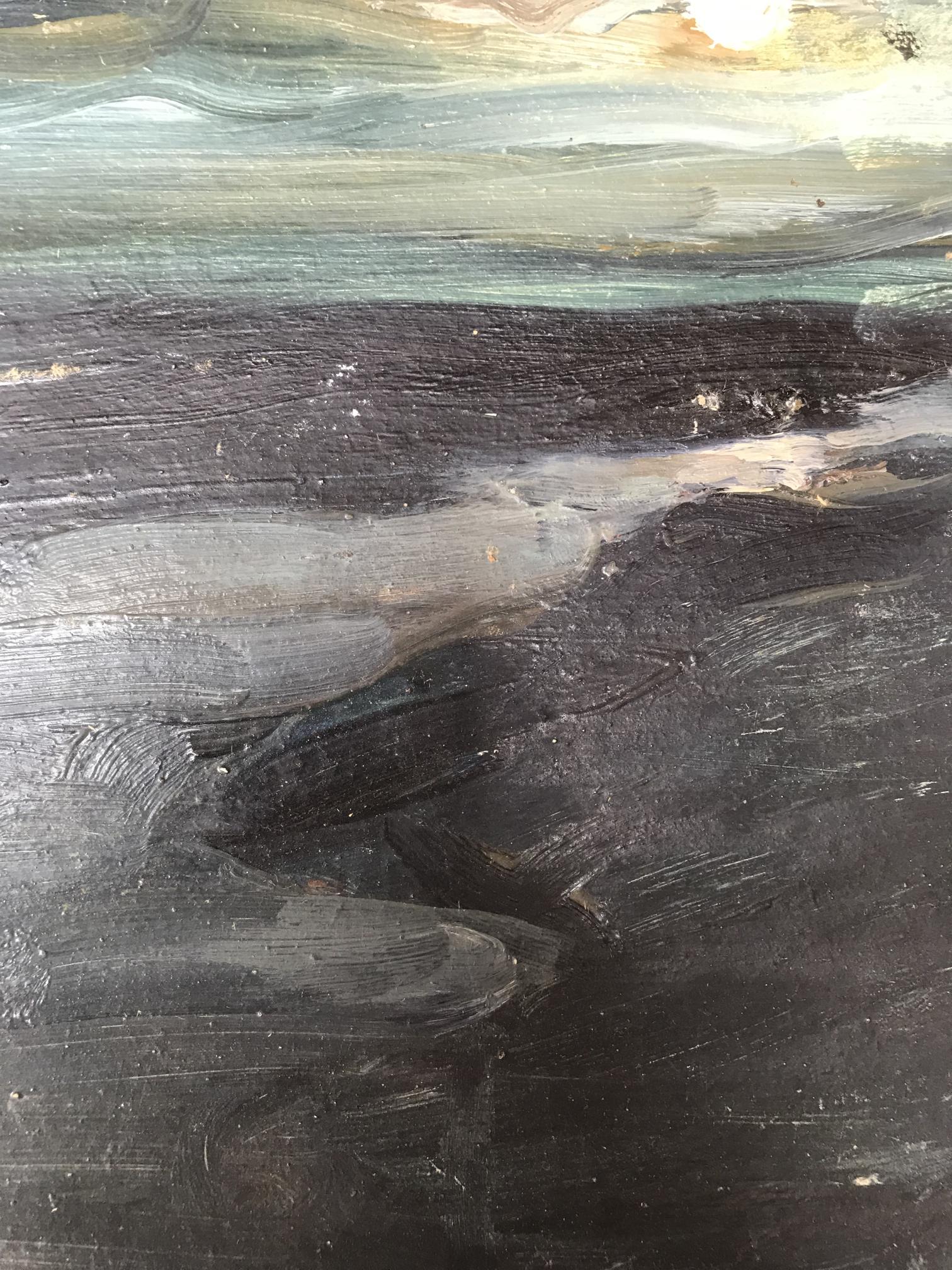 This oil painting is a beautiful and evocative nightscape. The dark night sky is filled with swirling clouds, and the moon peeks out from behind them. The river in the foreground reflects the ethereal light of the moon, creating a tranquil and atmospheric scene.