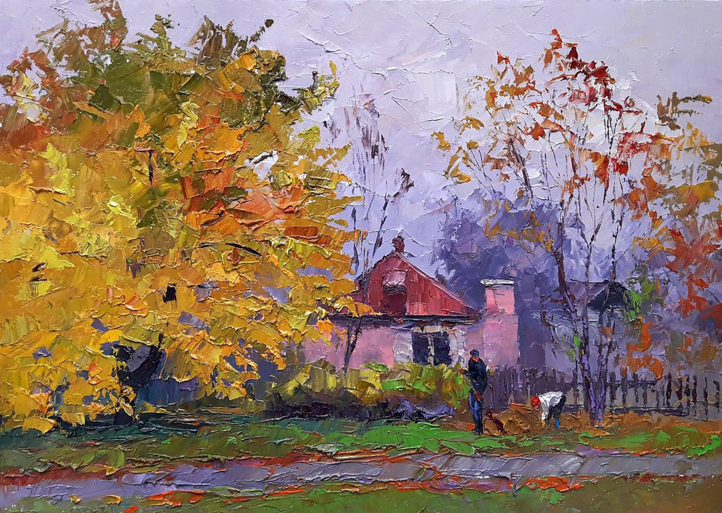 Step into the heart of autumn with "November autumn," a striking oil painting on canvas that captures the essence of village life amidst the season's change. This piece vividly portrays a segment of a village street, where a cozy house nestles behind a modest fence, embraced by the fiery hues of autumnal trees. In a scene filled with warmth and activity, the residents are depicted engaging in the quintessential autumn task of gathering fallen leaves, bringing a sense of motion and life to the tranquil setting.