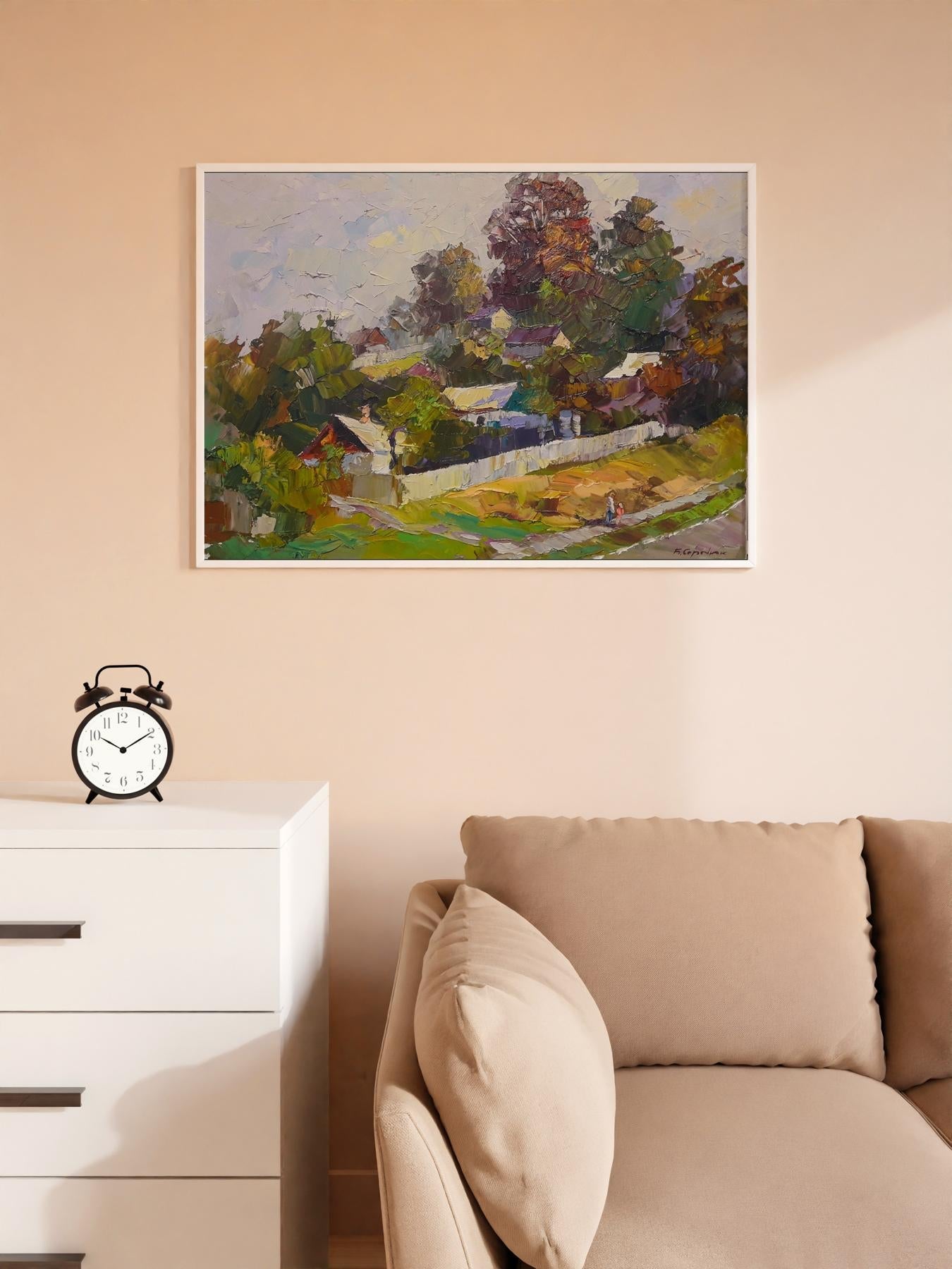 Looking at this oil painting, it's easy to feel as if you've been transported to another time and place- namely, an idyllic autumn afternoon in a quaint village. The view from the hilltop gives you a sweeping glimpse of the area, with its dense gardens and charming homes. The colors are warm and inviting, making you feel right at home.