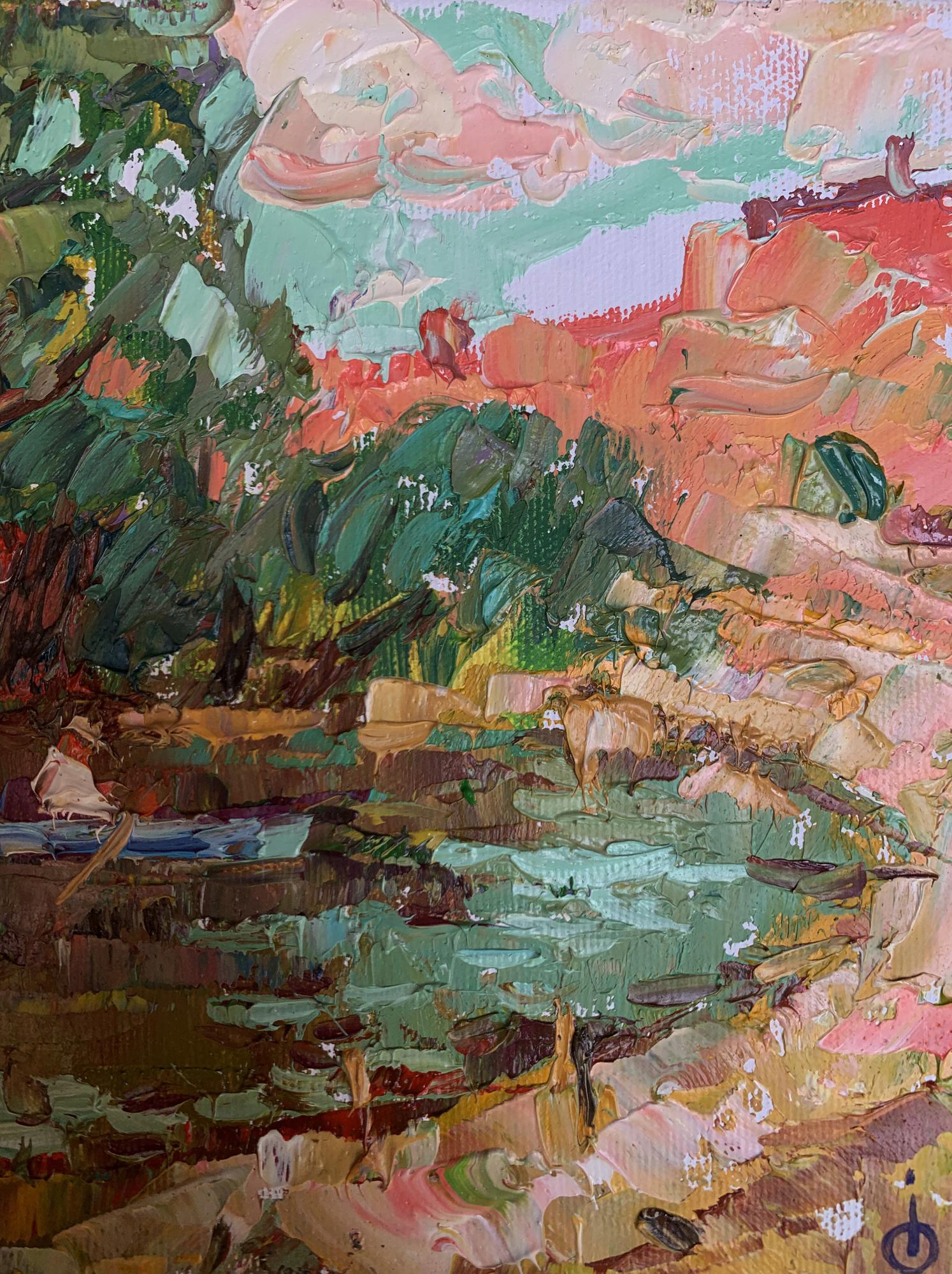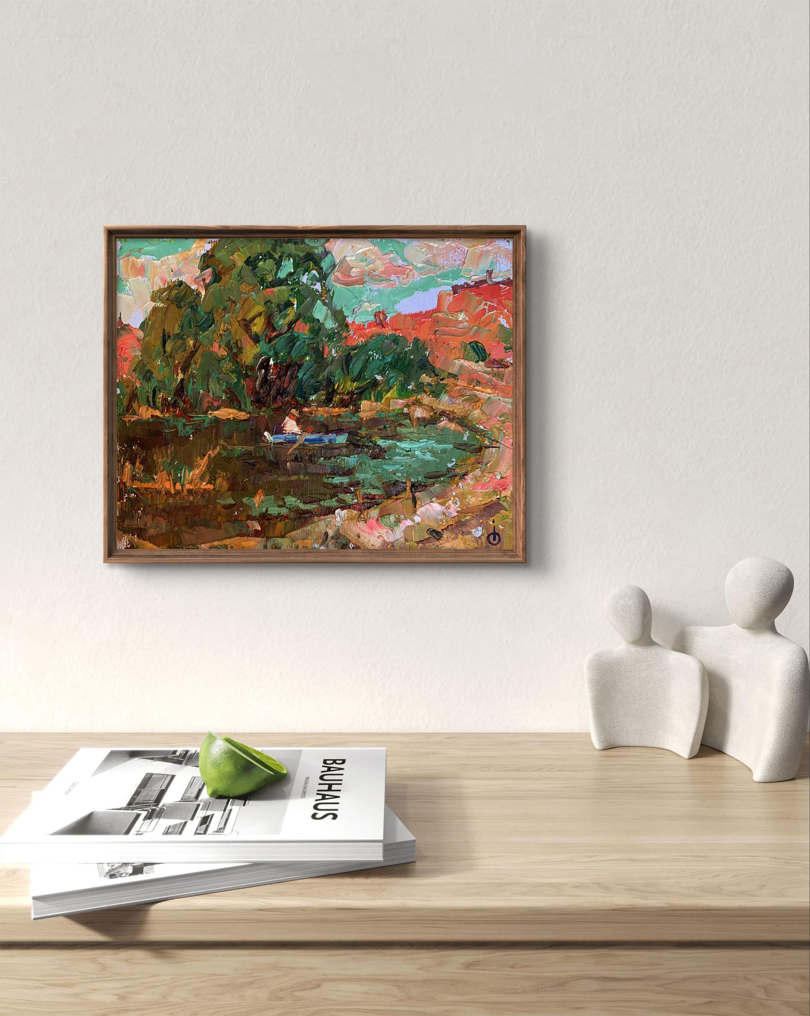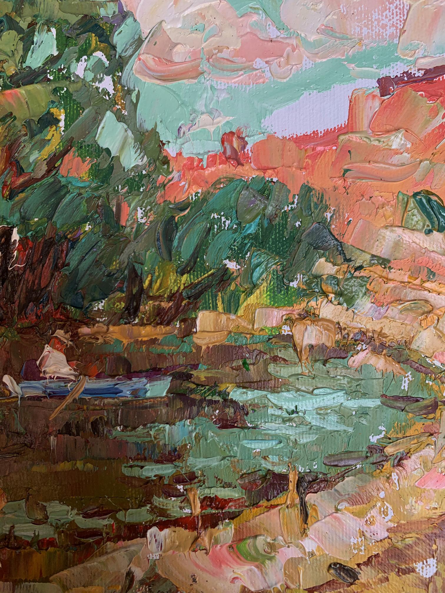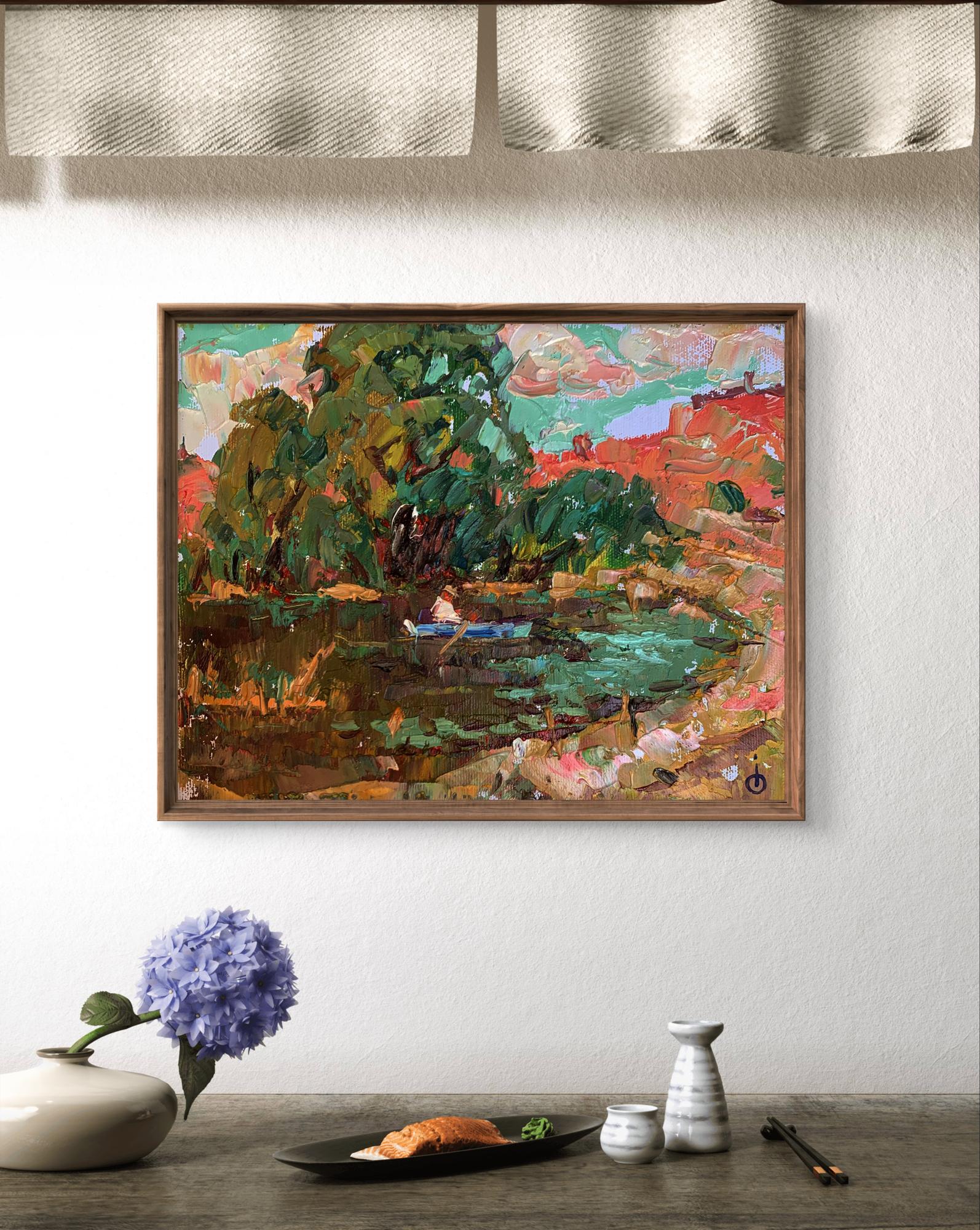 The painting "On a Blue Boat" is a vibrant and expressive oil on canvas piece that captures the serene and idyllic moment of a person rowing a blue boat on a tranquil river, surrounded by lush vegetation and under a colorful sky. The artist employs a rich and dynamic color palette, with dominant shades of green, blue, red, and brown. The technique is characterized by thick, textured brushstrokes typical of the impasto style, which create a sense of depth and movement. The use of bold, contrasting colors and energetic brushwork gives the painting a lively and immersive atmosphere. The composition is centered around a small blue boat on a river, with dense, colorful foliage in the background and vibrant reflections on the water's surface. The scene is framed by the lush vegetation on both sides, creating a sense of intimacy and focus on the central elements. The blue boat is positioned near the center of the painting, with two figures rowing. The boat is rendered in shades of blue, standing out against the earthy tones of the water and vegetation. The rowers are painted with expressive brushstrokes, capturing their movement and effort. The river is depicted with a mix of deep greens, browns, and blues, reflecting the colors of the surrounding foliage and sky. The textured brushstrokes suggest the movement of the water and the ripples created by the boat. The background features dense foliage with trees and bushes painted in a mix of greens, yellows, and browns, with accents of red and pink. The vibrant colors and dynamic brushstrokes capture the lushness and vitality of the landscape. The sky is a dramatic blend of pastel colors—pinks, purples, and light blues—creating a striking contrast with the greenery below. The swirling clouds add a sense of movement and energy, enhancing the overall dynamic feel of the painting. The overall mood of the painting is peaceful and joyful, capturing the simple pleasures of rowing on a river on a beautiful day. The vibrant colors and dynamic brushstrokes convey a sense of liveliness and contentment, inviting viewers to immerse themselves in the scene. "On a Blue Boat" can be interpreted as a celebration of nature's beauty and the enjoyment of outdoor activities. The painting captures a moment of leisure and connection with nature, reflecting the harmony between humans and their environment. The use of bright colors and expressive brushstrokes reflects the artist's emotional response to the scene, conveying a sense of happiness and appreciation for the natural world. This painting masterfully combines elements of realism and expressionism to create a vivid and immersive depiction of a peaceful moment on the river, using color and texture to evoke a sense of tranquility and joy.