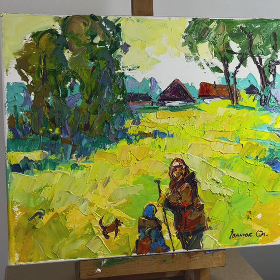 This painting is a splendid addition to any collection, particularly those focusing on Village Landscapes and Nature Landscapes, offering a unique glimpse into Ivanyuk's vivid portrayal of dynamic human experiences within serene settings. "On the Run" is ideal for collectors and art lovers who value paintings rich in narrative and expressive force, available for acquisition in our Online Art Gallery Store. This piece is not just a visual delight but a narrative tableau that invites viewers to ponder the stories and emotions that course through the quiet expanses of rural life.