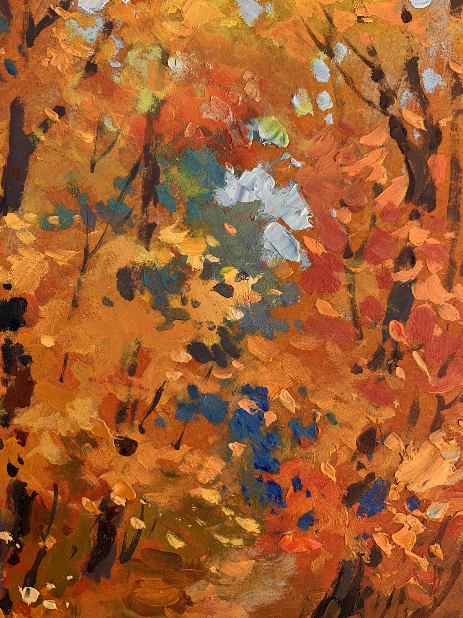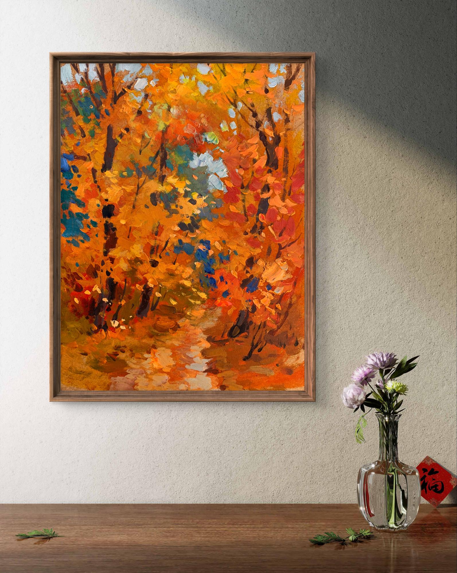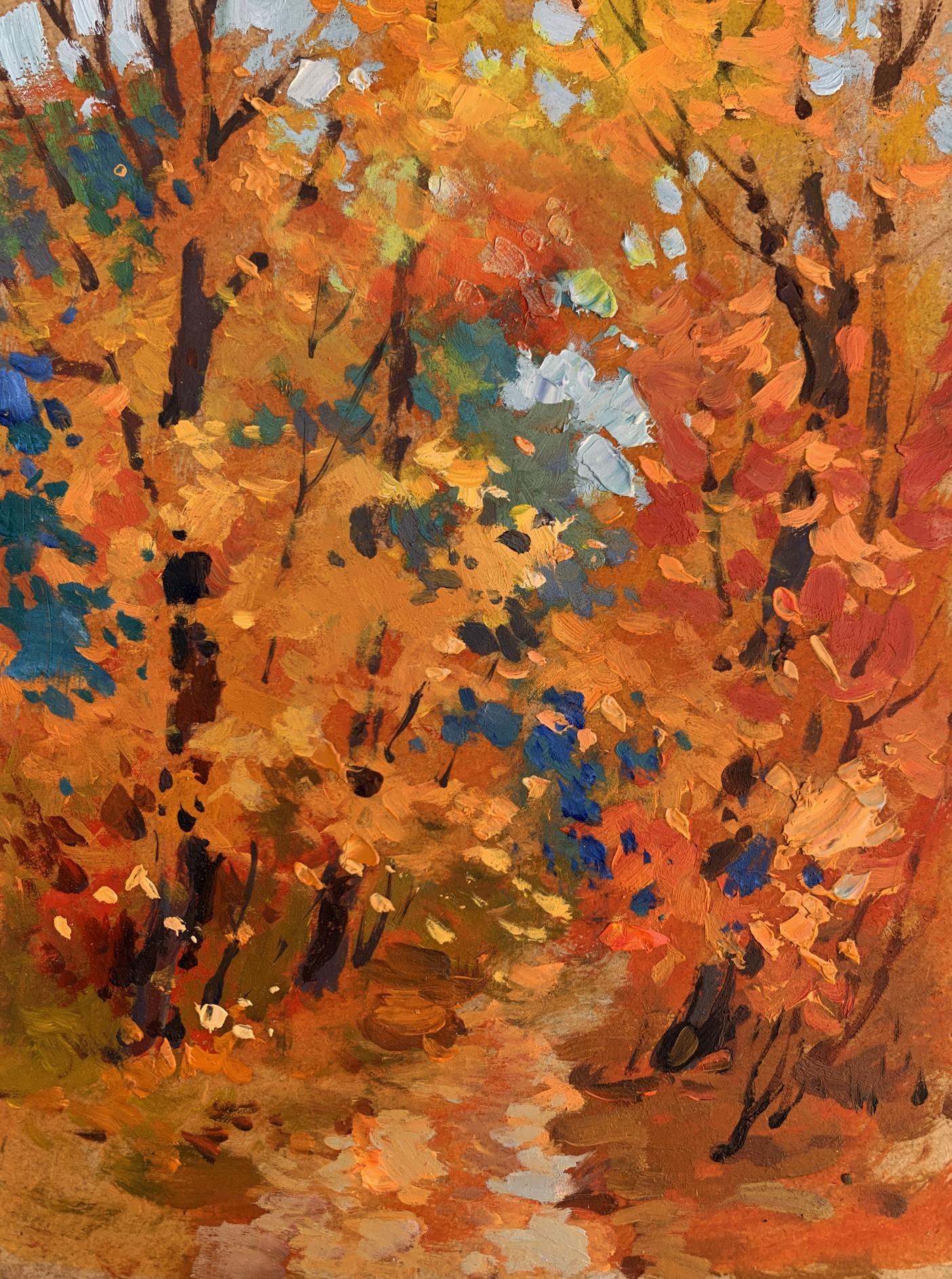 The painting "Orange Autumn Forest" captures the warm and vibrant beauty of a forest in the height of autumn. Executed in oil on cardboard, the work immerses the viewer in a world of rich, glowing colors, where nature displays its most striking seasonal transformation. The composition draws the eye along a winding path that disappears into the dense trees, creating a sense of mystery and inviting the viewer to explore further.The scene is dominated by a fiery palette of orange, red, and gold, reflecting the vivid hues of autumn foliage. The leaves, painted with dynamic, expressive brushstrokes, seem to dance in the gentle breeze, filling the air with the vitality of the season. Interspersed among the warm tones are cooler accents of blue and green, adding depth and contrast to the composition. These colors suggest patches of the sky peeking through the canopy or the lingering green of late summer.The trees, with their slender, dark trunks, create a vertical rhythm that contrasts with the swirling motion of the leaves. The rough textures of the trunks and branches, painted with bold, confident strokes, ground the composition and provide a striking framework for the vibrant colors. The interplay of light and shadow enhances the three-dimensional quality of the forest, creating a sense of immersion and realism despite the abstracted details.The path at the center of the scene, painted in soft earth tones, acts as a guiding element, drawing the viewer into the heart of the forest. Its irregular, meandering form adds a sense of natural spontaneity, mirroring the untamed beauty of the environment. The light along the path suggests that it is illuminated by dappled sunlight filtering through the trees, creating a warm and inviting atmosphere.Through "Orange Autumn Forest," the artist seeks to celebrate the fleeting yet profound beauty of autumn—a season of transformation and reflection. The painting captures the essence of nature’s vitality and reminds the viewer of the cyclical rhythms of life. The dynamic brushstrokes and vibrant colors convey a sense of movement and energy, emphasizing the life and spirit within the forest.This work resonates as an invitation to pause and appreciate the splendor of the natural world, encouraging moments of mindfulness and connection with the environment. By immersing the viewer in this glowing, autumnal scene, the artist evokes feelings of warmth, nostalgia, and awe for the beauty of the changing seasons