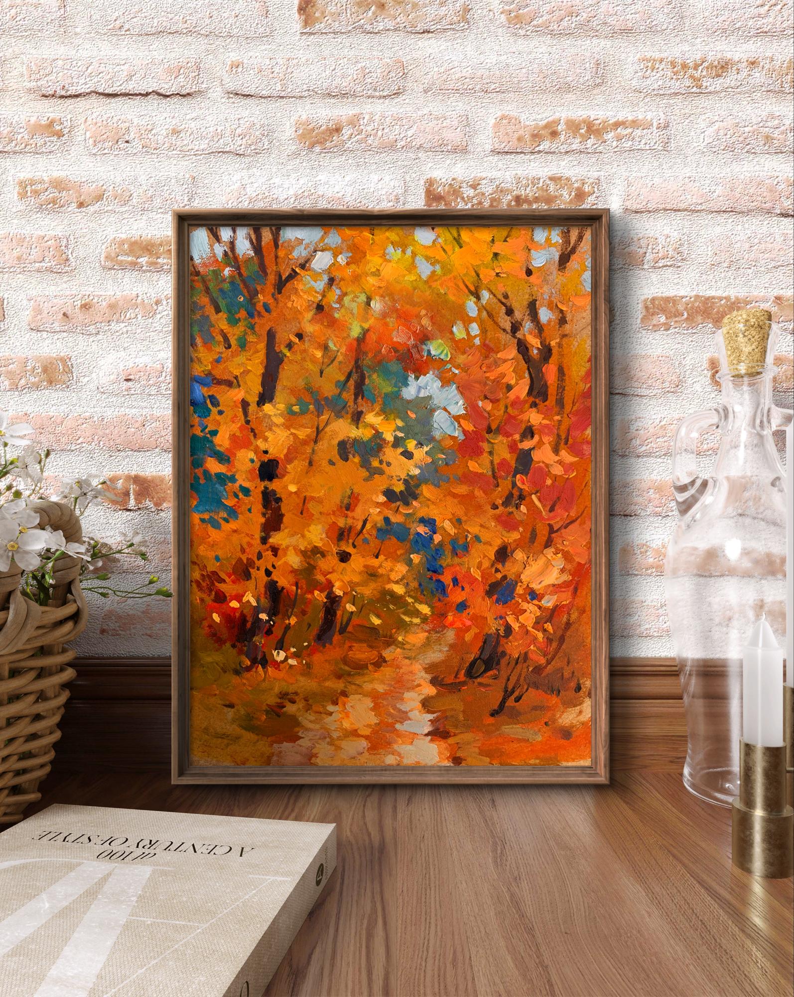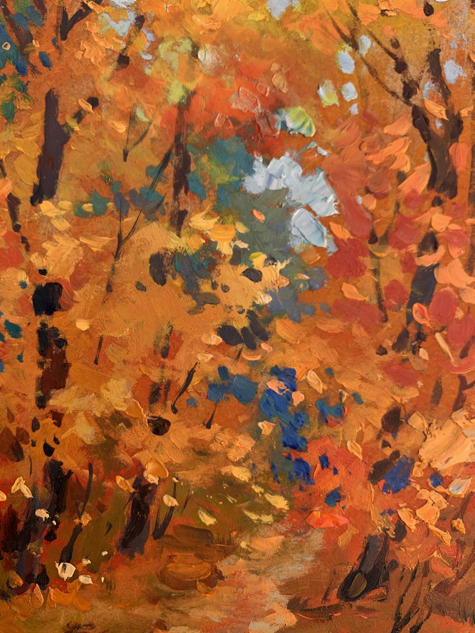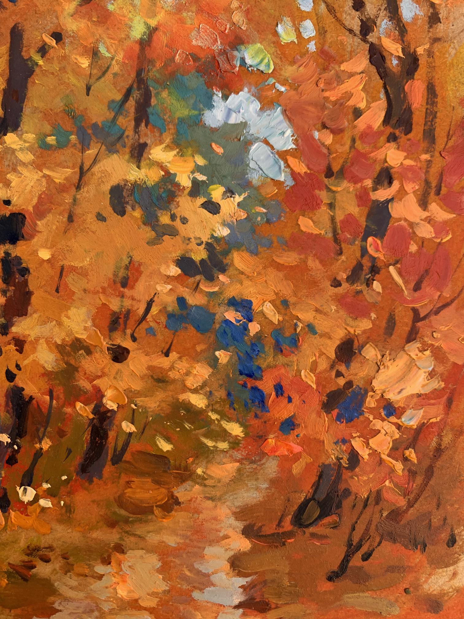The painting "Orange Autumn Forest" captures the warm and vibrant beauty of a forest in the height of autumn. Executed in oil on cardboard, the work immerses the viewer in a world of rich, glowing colors, where nature displays its most striking seasonal transformation. The composition draws the eye along a winding path that disappears into the dense trees, creating a sense of mystery and inviting the viewer to explore further.The scene is dominated by a fiery palette of orange, red, and gold, reflecting the vivid hues of autumn foliage. The leaves, painted with dynamic, expressive brushstrokes, seem to dance in the gentle breeze, filling the air with the vitality of the season. Interspersed among the warm tones are cooler accents of blue and green, adding depth and contrast to the composition. These colors suggest patches of the sky peeking through the canopy or the lingering green of late summer.The trees, with their slender, dark trunks, create a vertical rhythm that contrasts with the swirling motion of the leaves. The rough textures of the trunks and branches, painted with bold, confident strokes, ground the composition and provide a striking framework for the vibrant colors. The interplay of light and shadow enhances the three-dimensional quality of the forest, creating a sense of immersion and realism despite the abstracted details.The path at the center of the scene, painted in soft earth tones, acts as a guiding element, drawing the viewer into the heart of the forest. Its irregular, meandering form adds a sense of natural spontaneity, mirroring the untamed beauty of the environment. The light along the path suggests that it is illuminated by dappled sunlight filtering through the trees, creating a warm and inviting atmosphere.Through "Orange Autumn Forest," the artist seeks to celebrate the fleeting yet profound beauty of autumn—a season of transformation and reflection. The painting captures the essence of nature’s vitality and reminds the viewer of the cyclical rhythms of life. The dynamic brushstrokes and vibrant colors convey a sense of movement and energy, emphasizing the life and spirit within the forest.This work resonates as an invitation to pause and appreciate the splendor of the natural world, encouraging moments of mindfulness and connection with the environment. By immersing the viewer in this glowing, autumnal scene, the artist evokes feelings of warmth, nostalgia, and awe for the beauty of the changing seasons