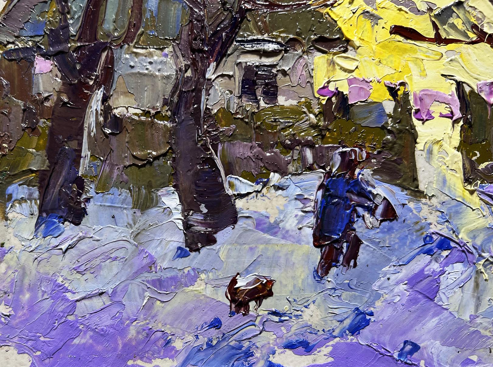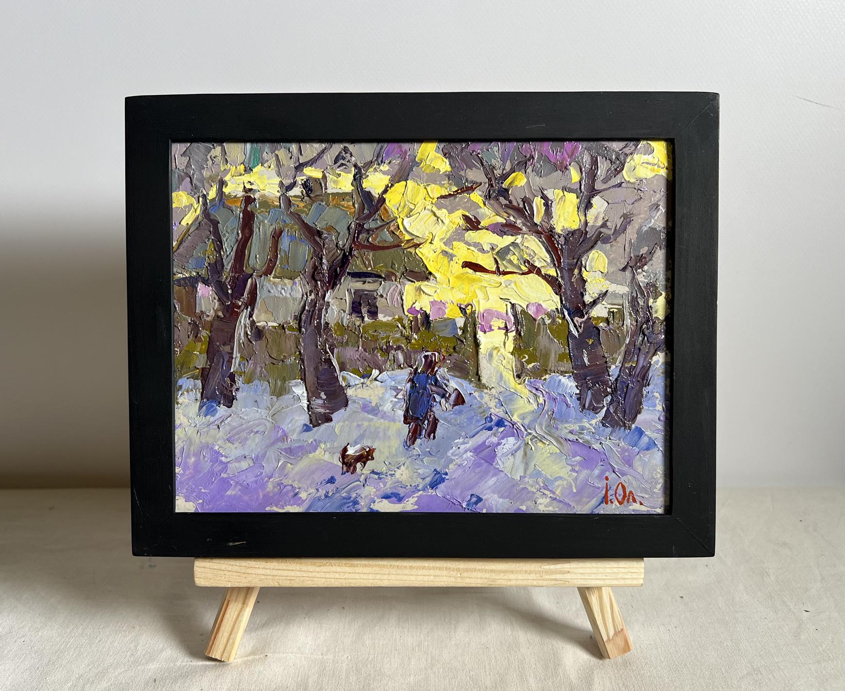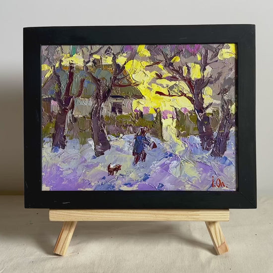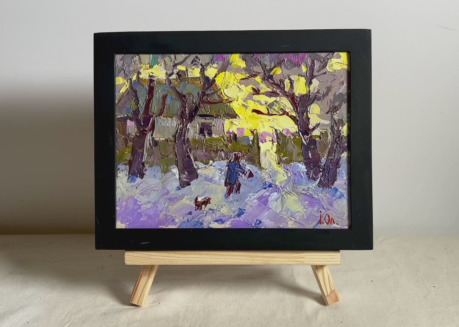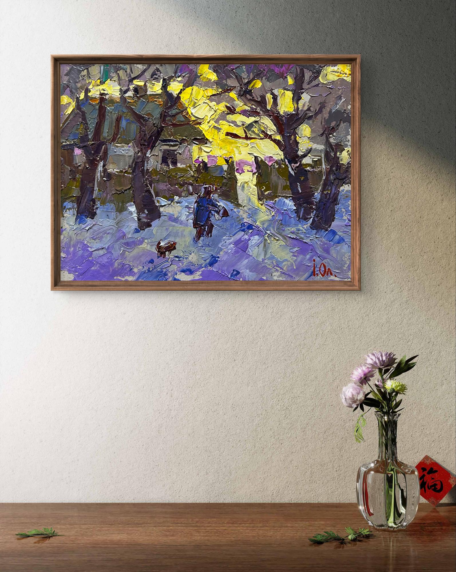 The painting "Over the Evening" depicts a serene and nostalgic scene of a quiet neighborhood at dusk, capturing the transition from day to night. The artist uses a bold palette knife technique with thick layers of oil paint, creating a textured, impressionistic landscape that brings warmth and life to the canvas. In the center of the composition, a figure, dressed in a deep blue coat, is walking along a snowy path, accompanied by a small dog. The figure seems to be heading home, creating a narrative of everyday life, evoking a feeling of peace and simplicity. The dog adds a playful, heartwarming element, emphasizing companionship and comfort. The foreground is dominated by shades of purple, blue, and white, representing the snow-covered ground, with long, soft shadows cast by the trees. The strokes of paint are dynamic and expressive, adding movement to the scene, as if capturing the last light reflecting off the snow. The trees on either side of the path are painted in deep browns and purples, with bare branches reaching toward the sky. The branches are interspersed with splashes of yellow light, suggesting that the sunset's glow is filtering through the trees, creating a warm and inviting atmosphere. The background is illuminated by a radiant burst of golden light, symbolizing the warm glow of evening lights coming from houses or street lamps. The soft yellow, pink, and green tones contrast beautifully with the cool purples and blues in the foreground, creating a balanced and harmonious composition. The mood of the painting is calm and reflective, evoking a sense of nostalgia and comfort. It invites the viewer to imagine a peaceful walk home after a long day, with the warmth of home and companionship waiting at the end of the journey. The signature in the bottom right corner identifies the artist, showcasing their unique ability to capture the essence of light and shadow, everyday life, and emotional resonance through bold textures and vibrant color contrasts. "Over the Evening" would make a perfect addition to a collection of impressionistic works that highlight the beauty of simple, quiet moments.