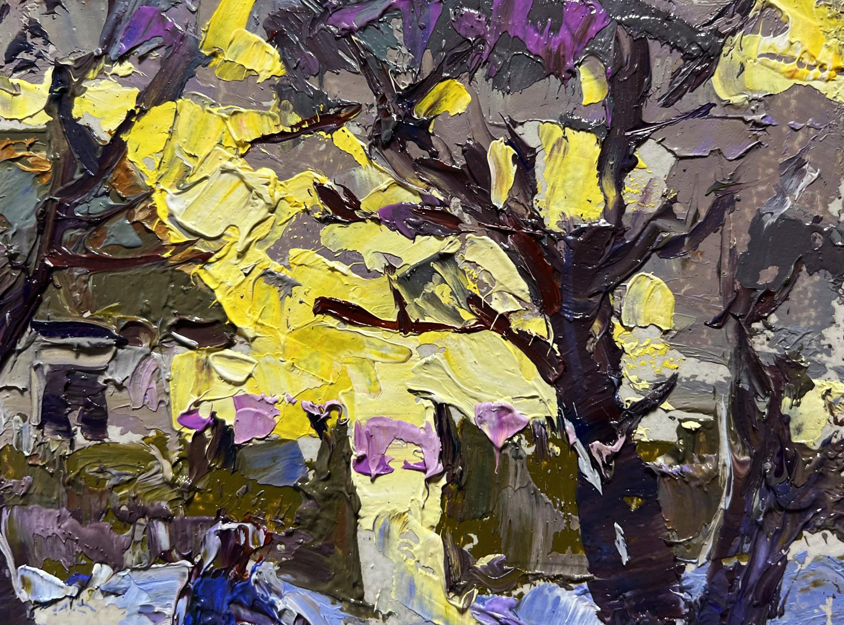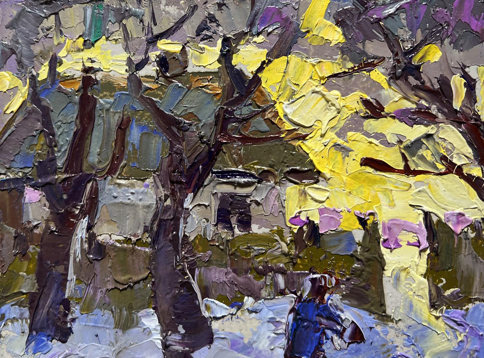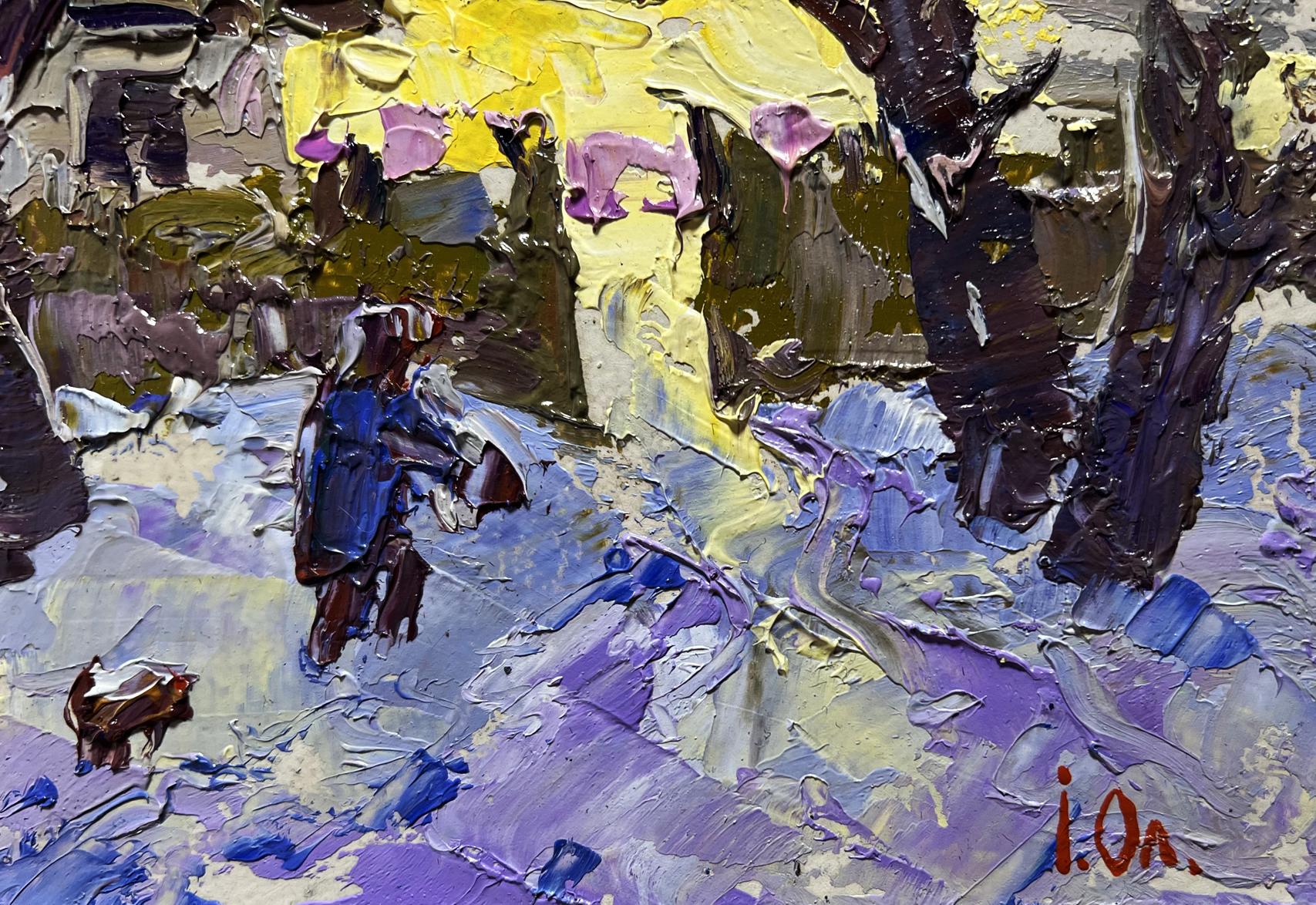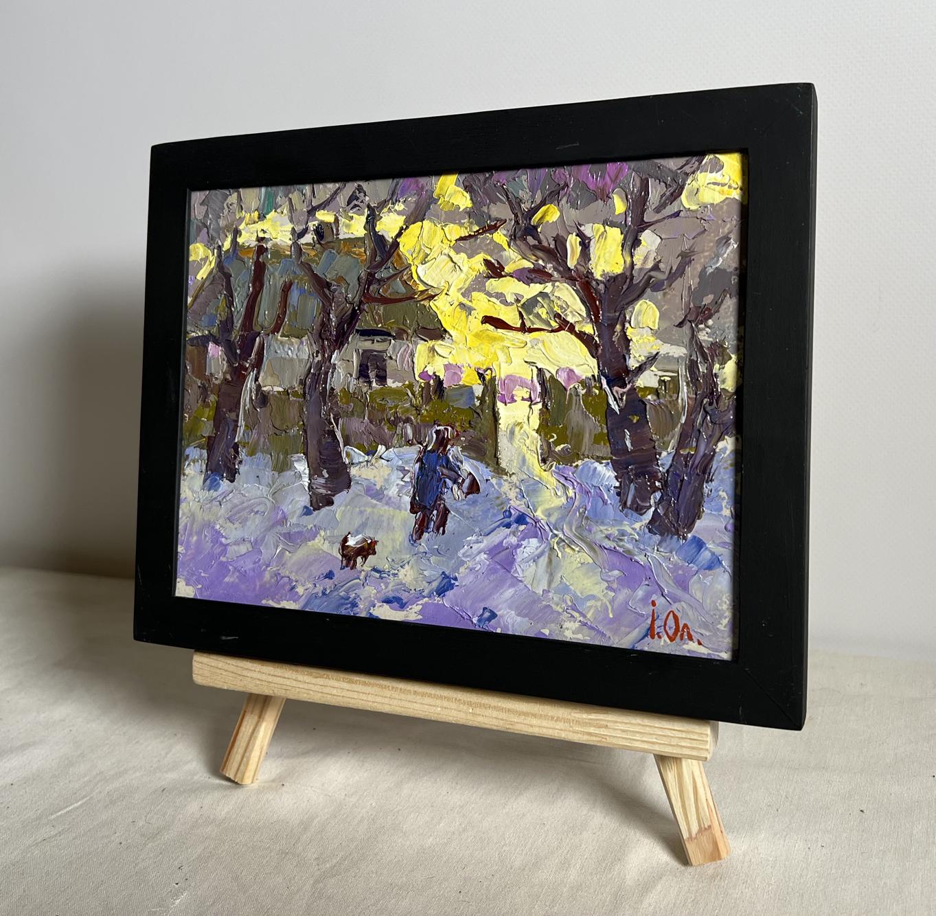 The painting "Over the Evening" depicts a serene and nostalgic scene of a quiet neighborhood at dusk, capturing the transition from day to night. The artist uses a bold palette knife technique with thick layers of oil paint, creating a textured, impressionistic landscape that brings warmth and life to the canvas. In the center of the composition, a figure, dressed in a deep blue coat, is walking along a snowy path, accompanied by a small dog. The figure seems to be heading home, creating a narrative of everyday life, evoking a feeling of peace and simplicity. The dog adds a playful, heartwarming element, emphasizing companionship and comfort. The foreground is dominated by shades of purple, blue, and white, representing the snow-covered ground, with long, soft shadows cast by the trees. The strokes of paint are dynamic and expressive, adding movement to the scene, as if capturing the last light reflecting off the snow. The trees on either side of the path are painted in deep browns and purples, with bare branches reaching toward the sky. The branches are interspersed with splashes of yellow light, suggesting that the sunset's glow is filtering through the trees, creating a warm and inviting atmosphere. The background is illuminated by a radiant burst of golden light, symbolizing the warm glow of evening lights coming from houses or street lamps. The soft yellow, pink, and green tones contrast beautifully with the cool purples and blues in the foreground, creating a balanced and harmonious composition. The mood of the painting is calm and reflective, evoking a sense of nostalgia and comfort. It invites the viewer to imagine a peaceful walk home after a long day, with the warmth of home and companionship waiting at the end of the journey. The signature in the bottom right corner identifies the artist, showcasing their unique ability to capture the essence of light and shadow, everyday life, and emotional resonance through bold textures and vibrant color contrasts. "Over the Evening" would make a perfect addition to a collection of impressionistic works that highlight the beauty of simple, quiet moments.