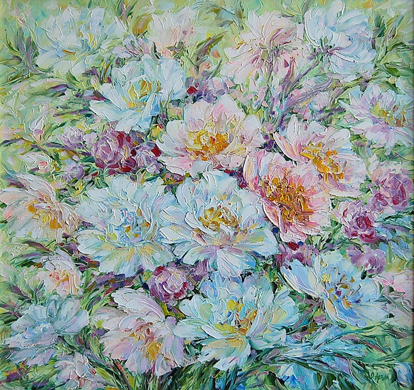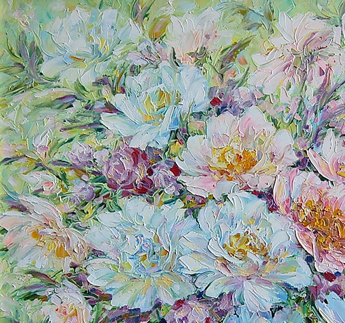 In "Peonies. In the Country," Ukrainian artist Olga Artim presents a lush bouquet of peonies in full bloom, beautifully capturing the essence of their natural charm. The painting features soft pastels—pinks, whites, and greens—evoking a peaceful and serene atmosphere, reminiscent of a tranquil countryside setting. The textured petals give the flowers depth and dimension, making them appear almost alive, as if they were gently swaying in a country breeze. This work is an ideal addition to any Collection of Still lifes or Collection of Painting with Flowers.