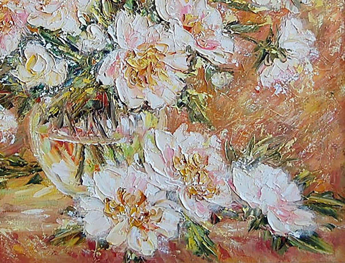 In "Peonies on a Golden Background," Ukrainian artist Olga Artim presents a striking composition where delicate white peonies gracefully stand against a rich, golden backdrop. The textured paint application brings these beautiful flowers to life, capturing their softness and elegance. The golden tones in the background evoke a sense of warmth, luxury, and timeless beauty. This painting is a stunning addition to any Collection of Still lifes or Collection of Painting with Flowers, offering a harmonious blend of nature’s fragility and the lasting allure of gold.
